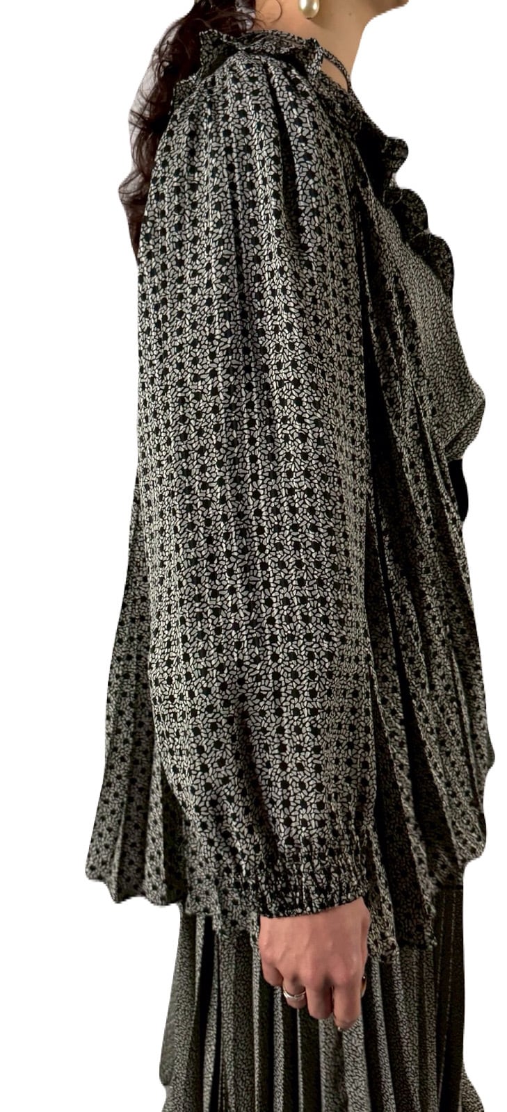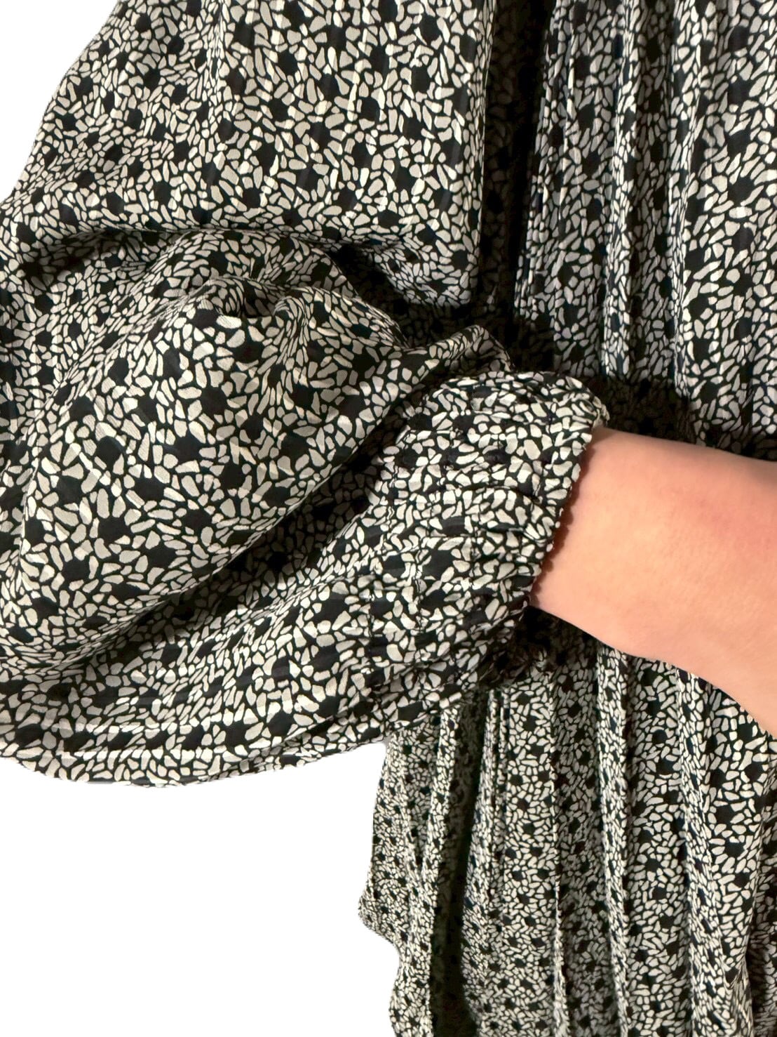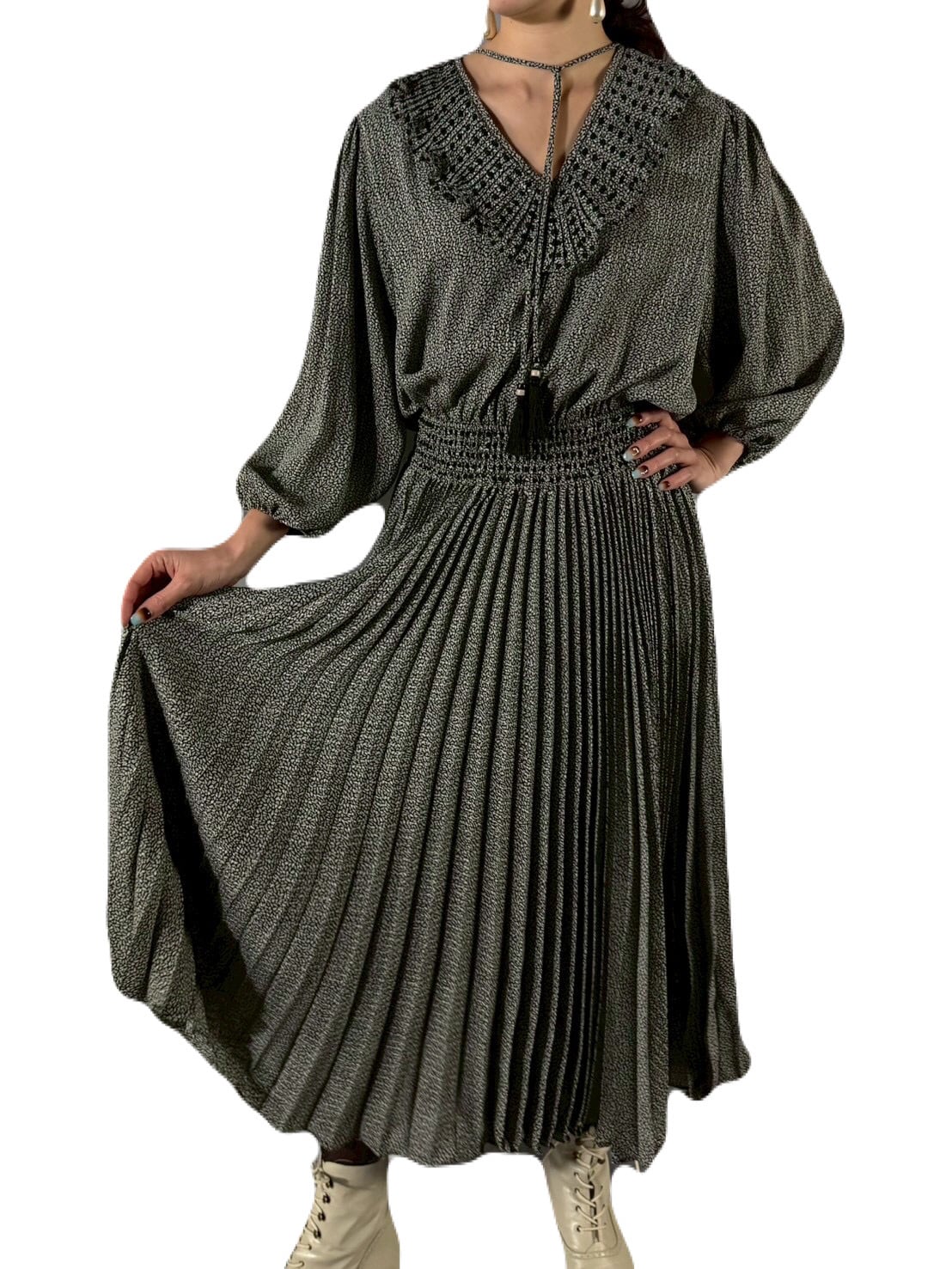 ワンピースのボトムは生地をたっぷりと使ったアコーディオンプリーツで、歩くたびに優雅にゆらめく動きがとても美しいです。