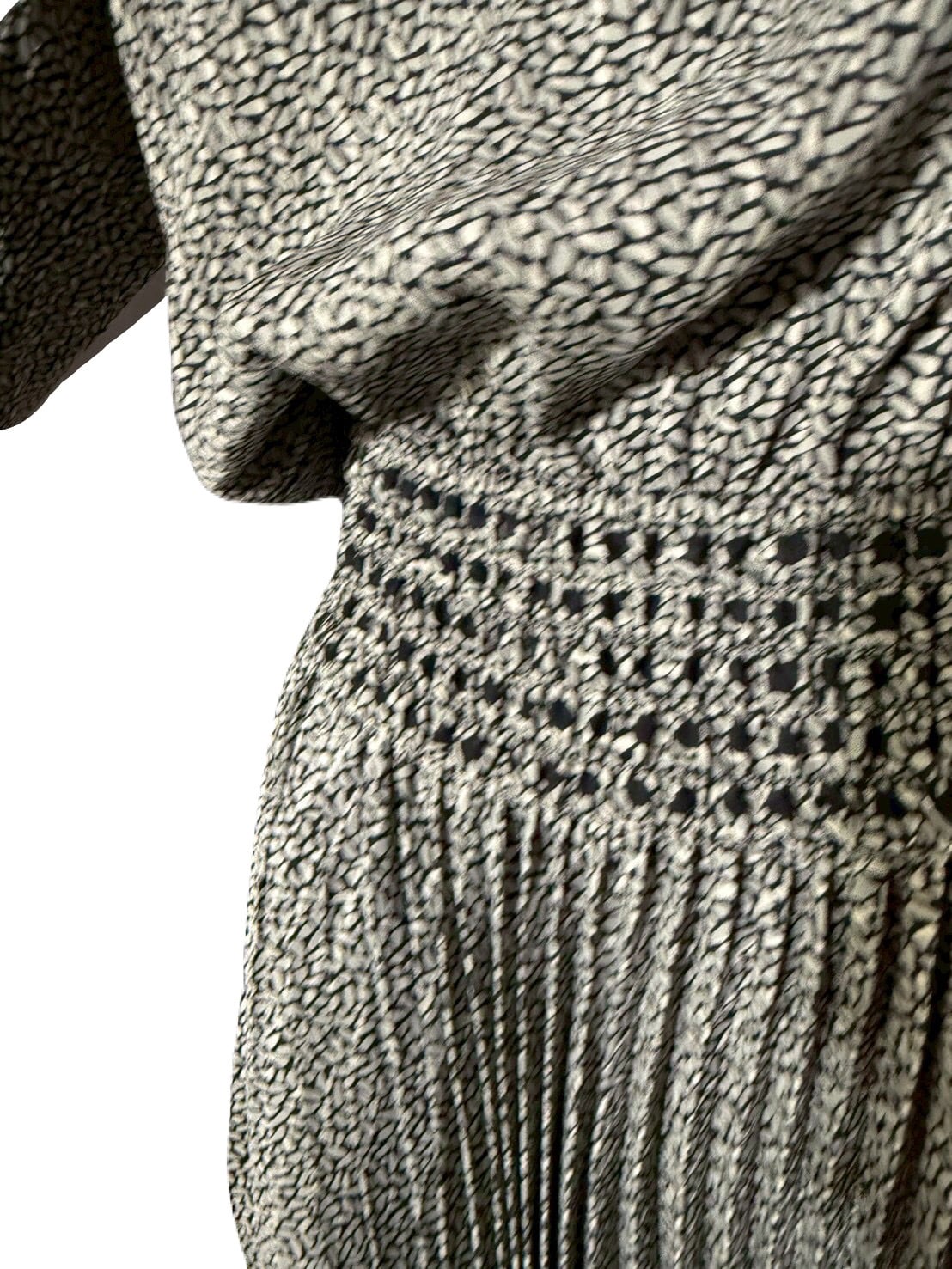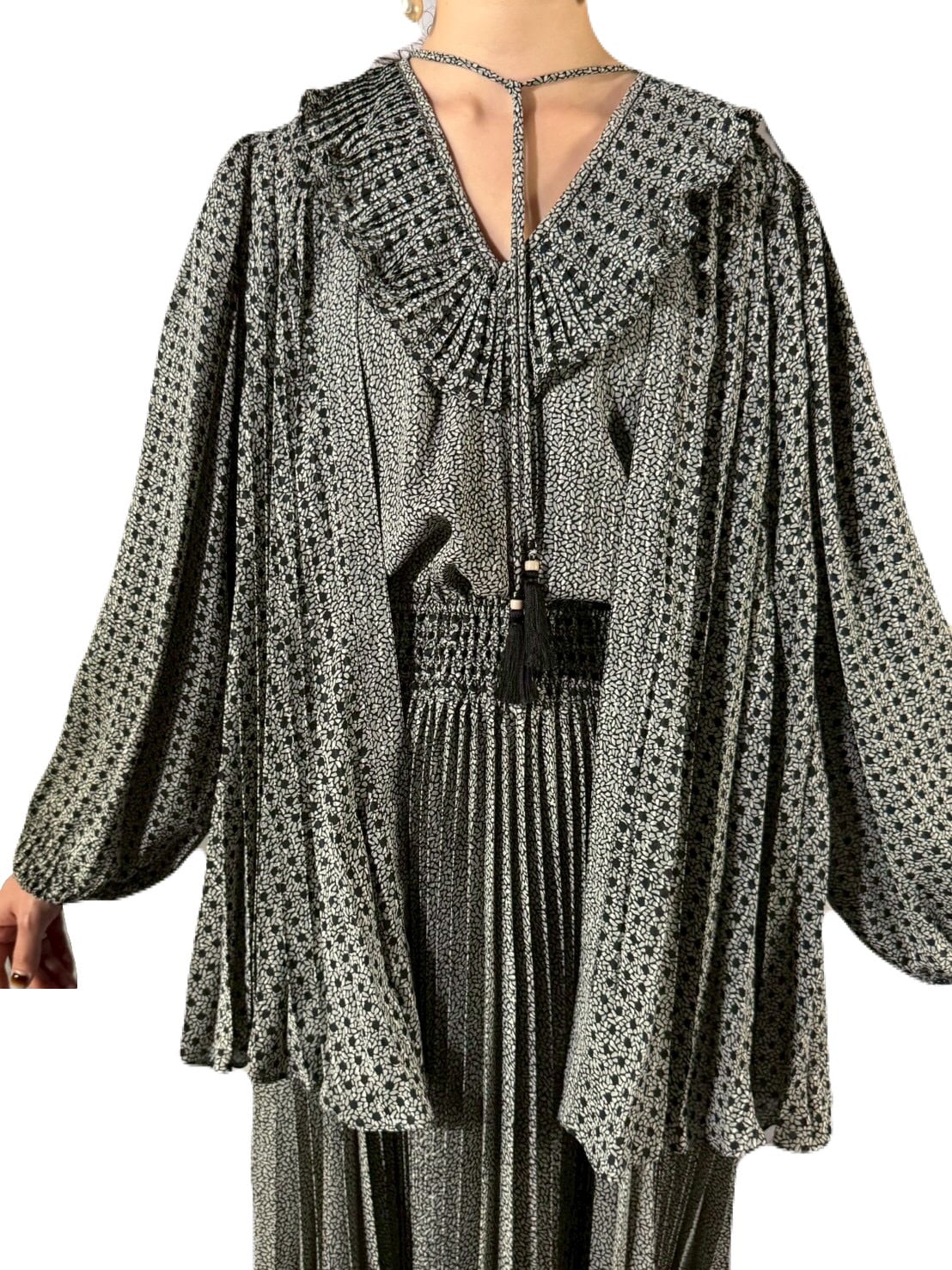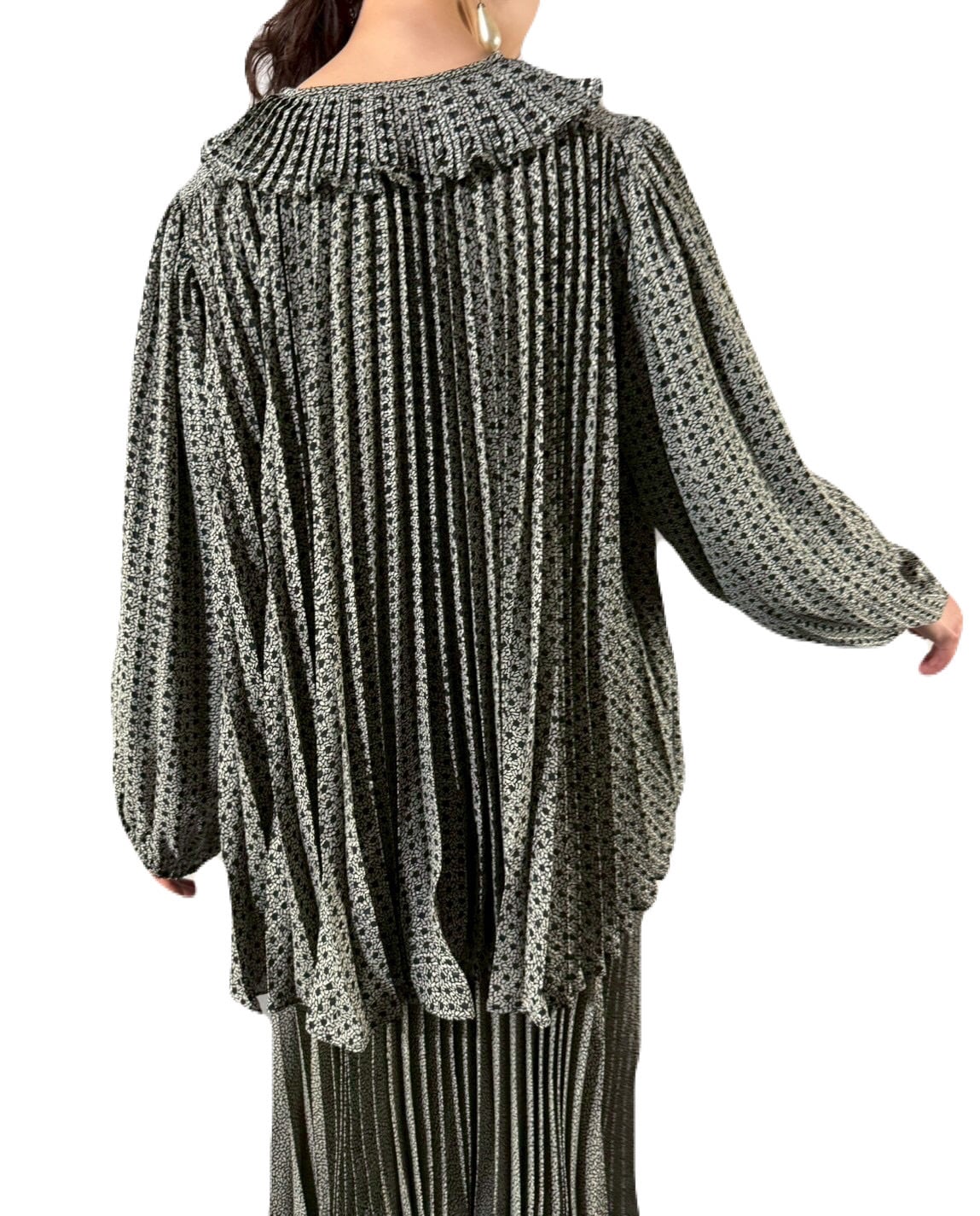 付属の羽織りにもアコーディオンプリーツが折り込まれ、セットで着用すればより優雅で統一感のある印象になります。