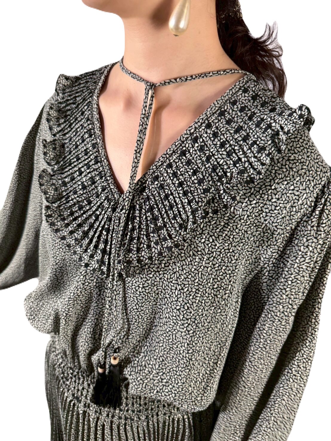 シンプルなVネックはデコルテをすっきりと美しく見せ、フリルやタッセル遣いが華やかさを添えます。