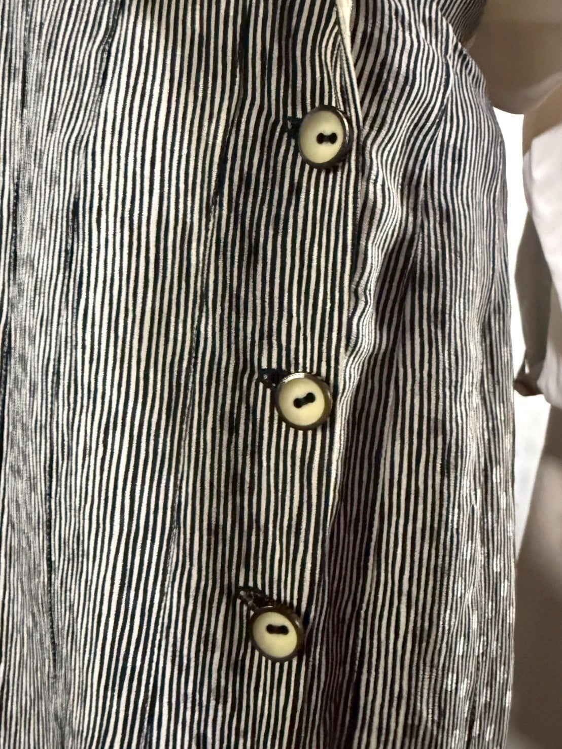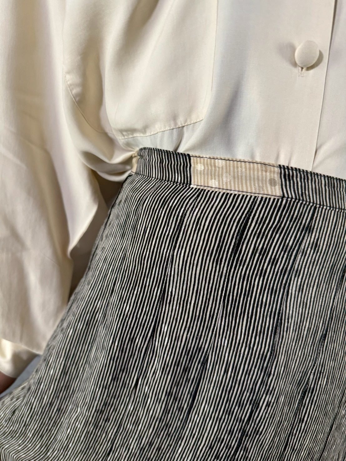 メインの生地は、優しいモノトーンのストライプ柄で、水玉模様の織柄がさりげなく重なり、奥行きのある表情を見せています。