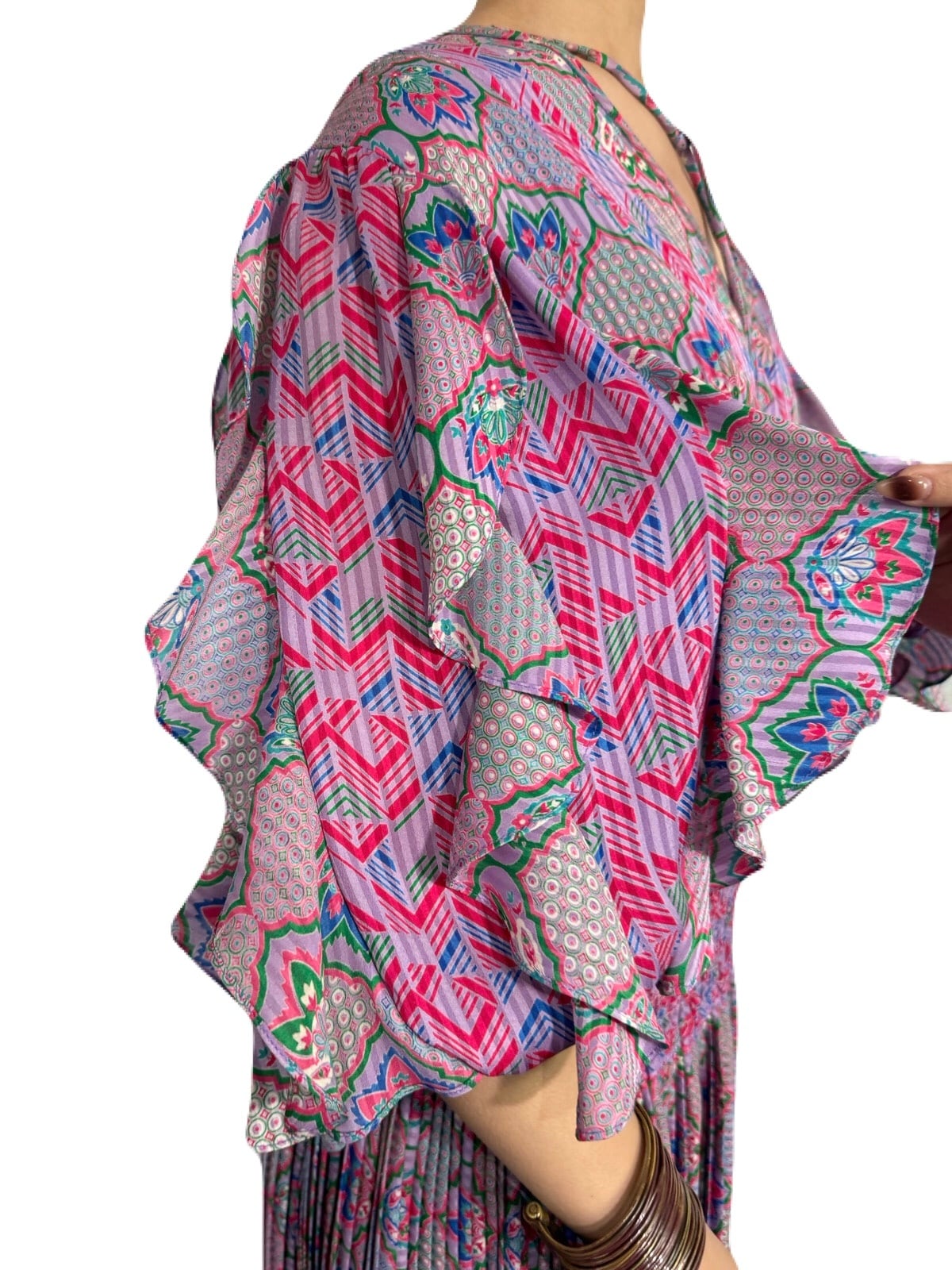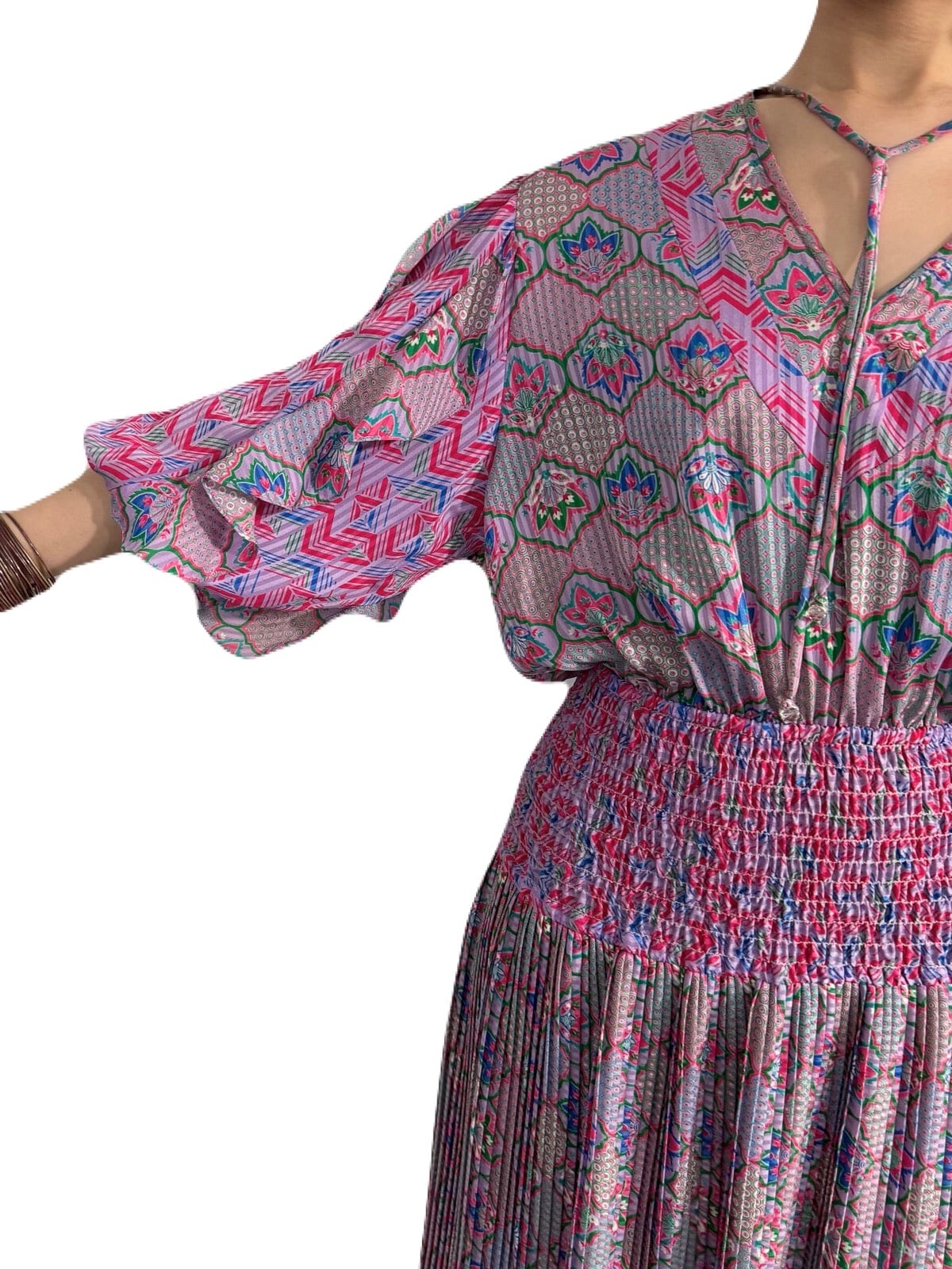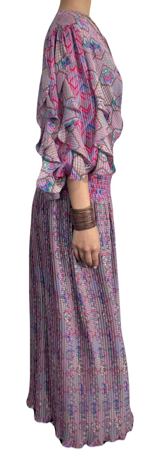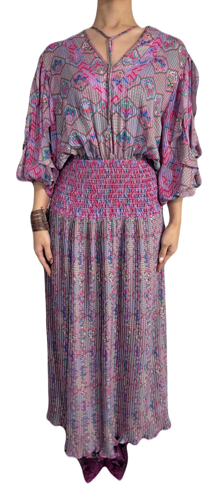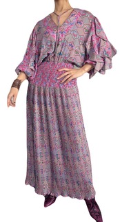 エキゾチックで宮殿的な華やかさのあるプリントデザイン。立体的に仕上げられた素敵過ぎる袖のデザインが目を惹くSusan Freisのスペシャルなワンピース。