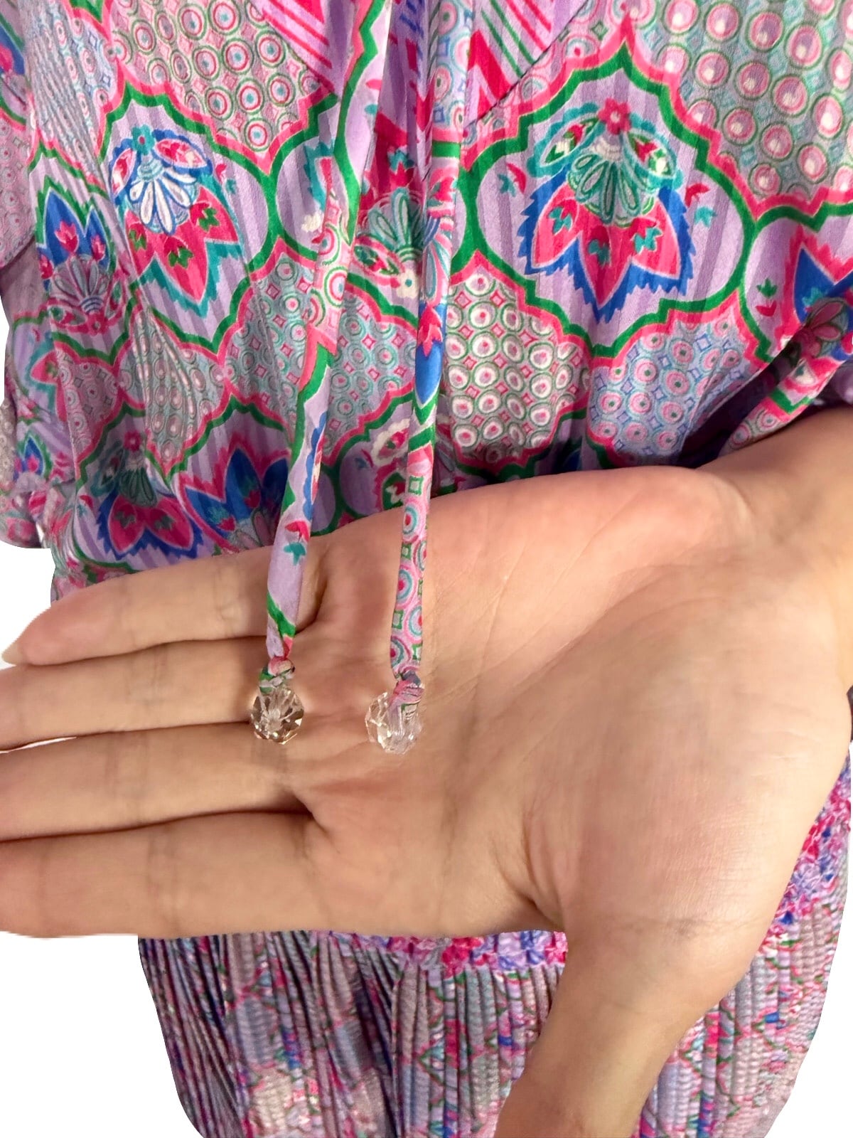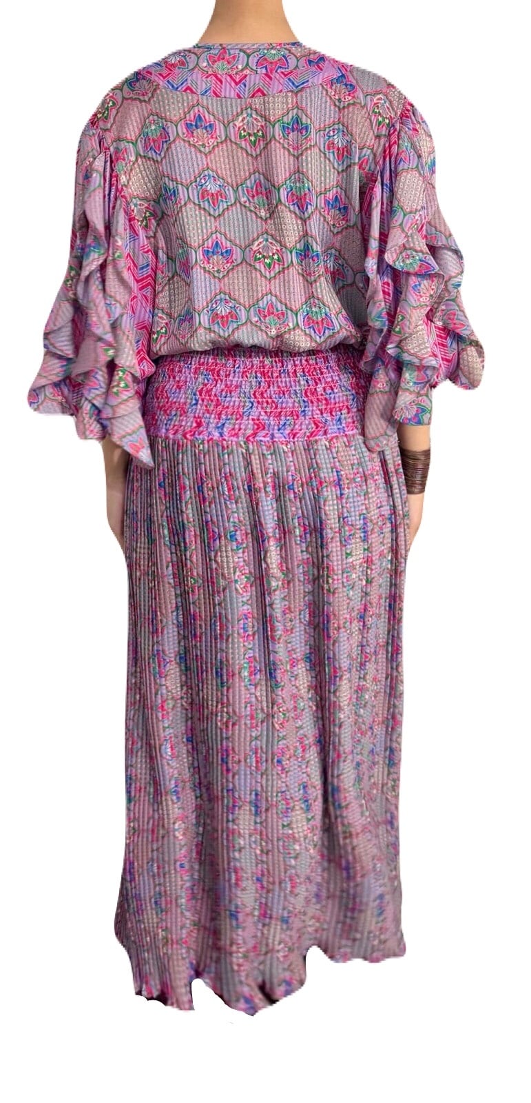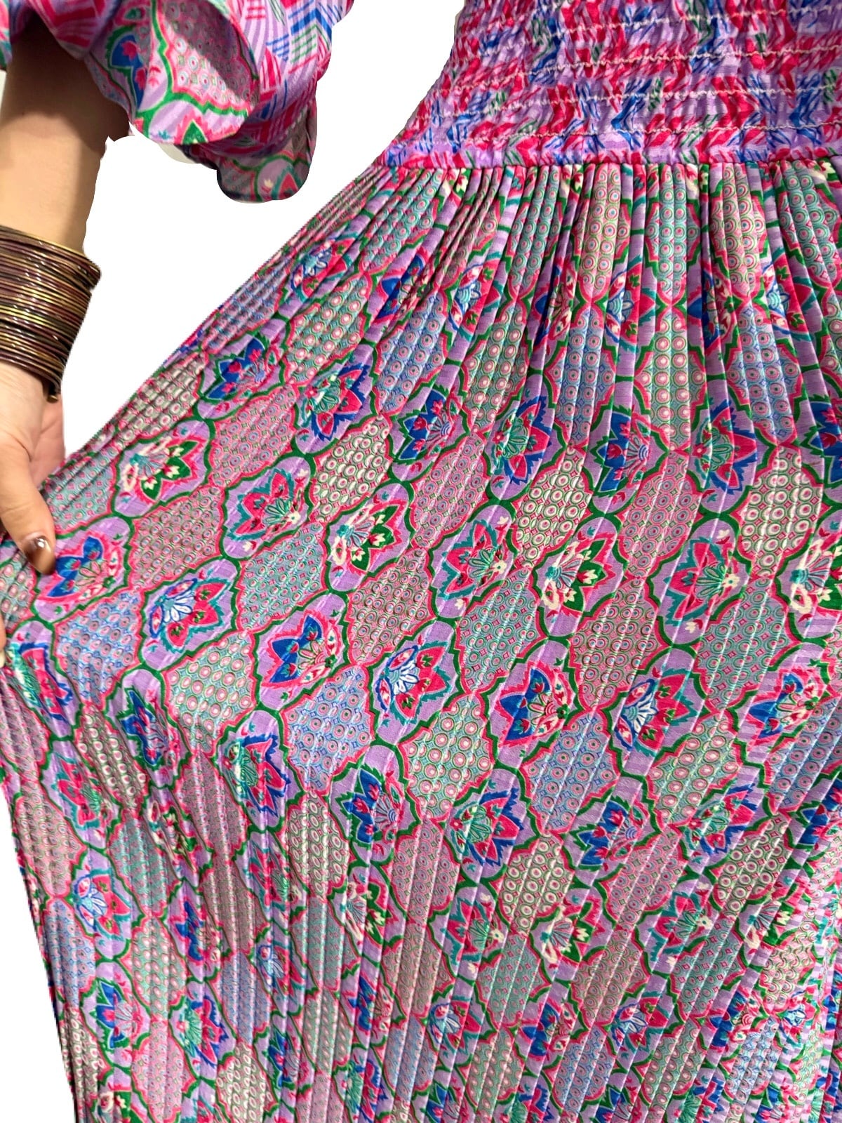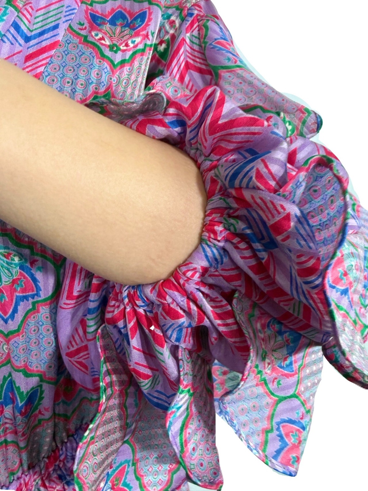 エキゾチックで宮殿的な華やかさのあるプリントデザイン。立体的に仕上げられた素敵過ぎる袖のデザインが目を惹くSusan Freisのスペシャルなワンピース。