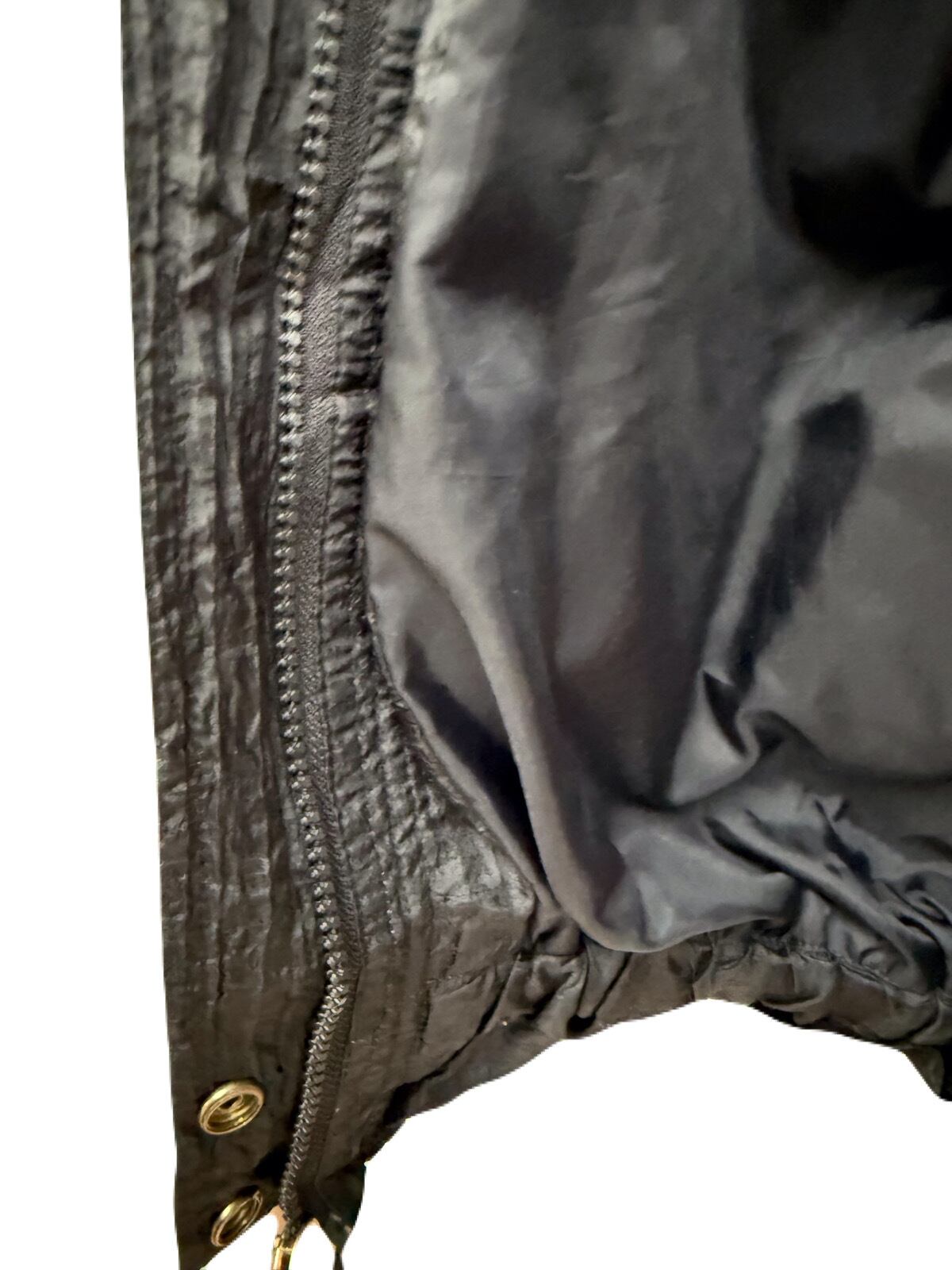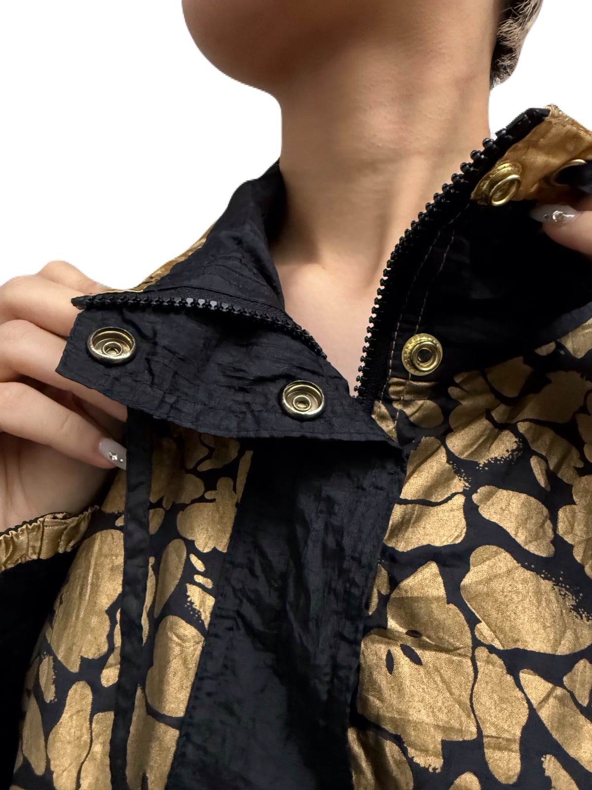 ブラックナイロンの柔らかな光沢とマットゴールドがとてもマッチしています。ドルマンスリーブのゆったりとした人気のシルエットです。