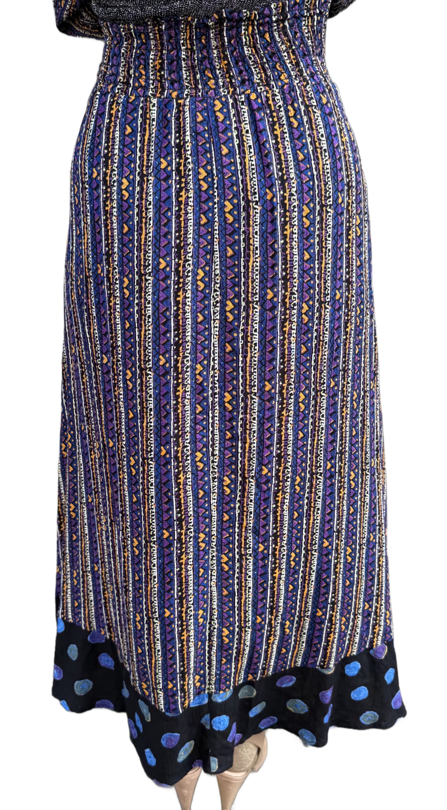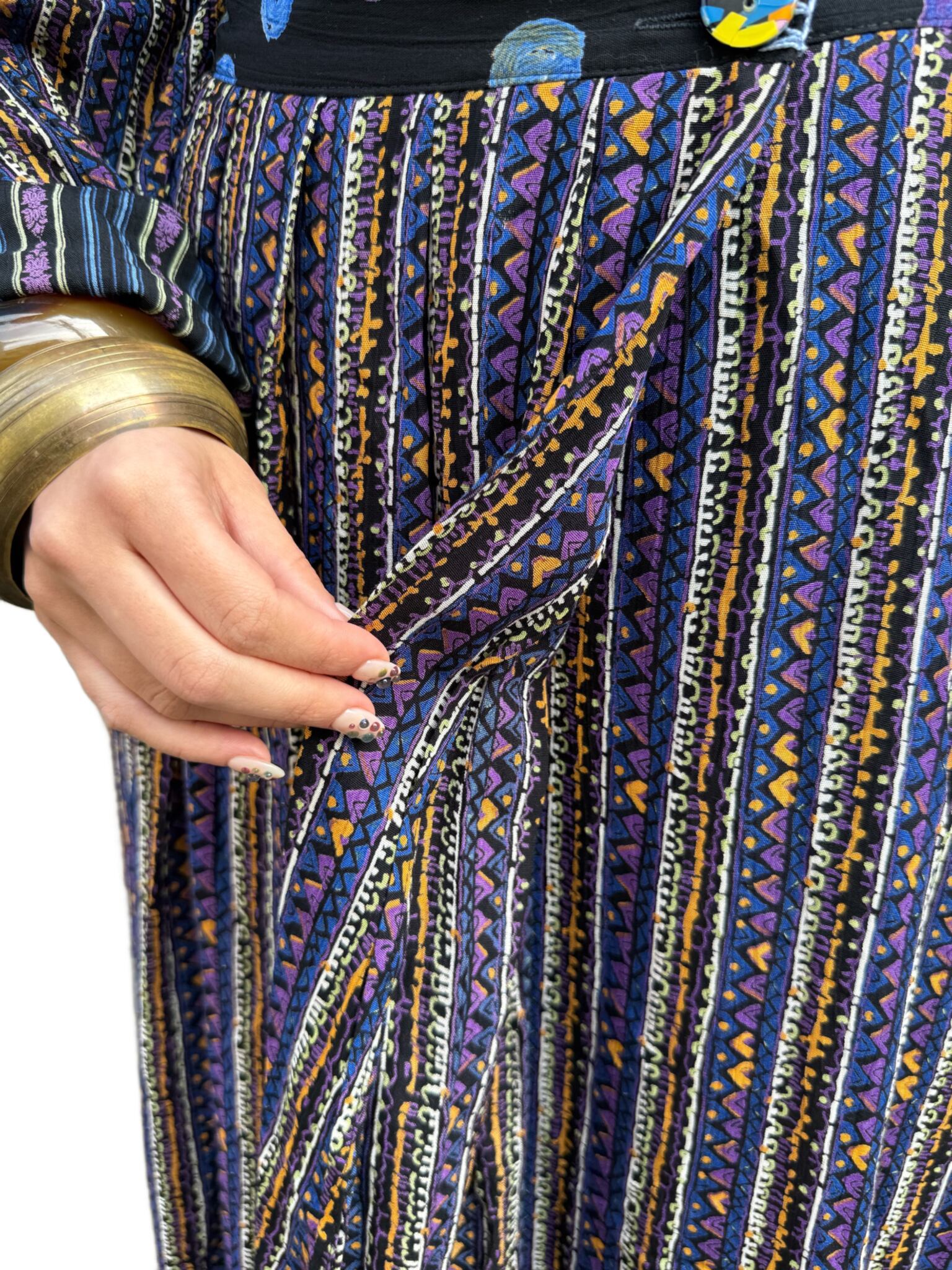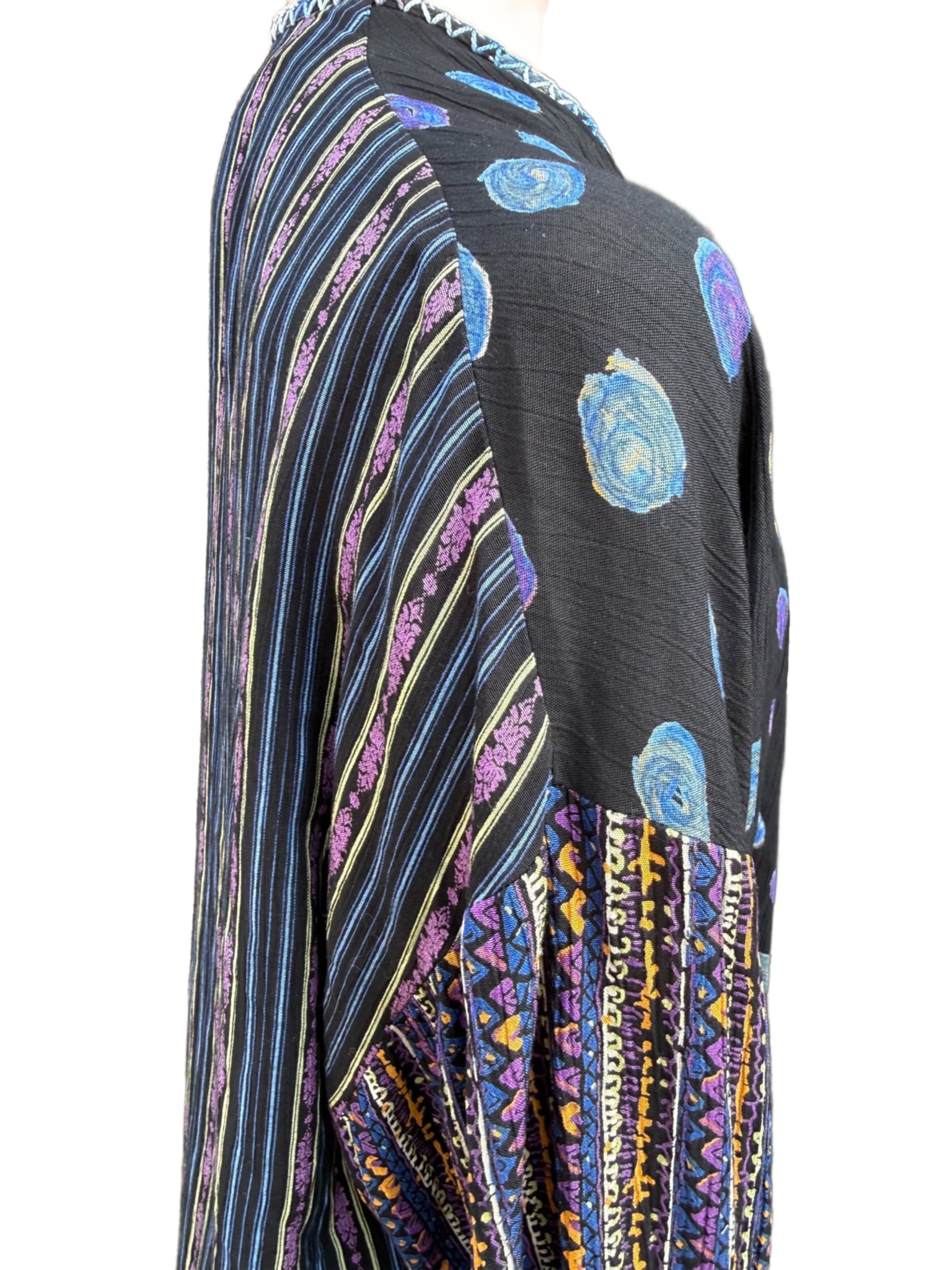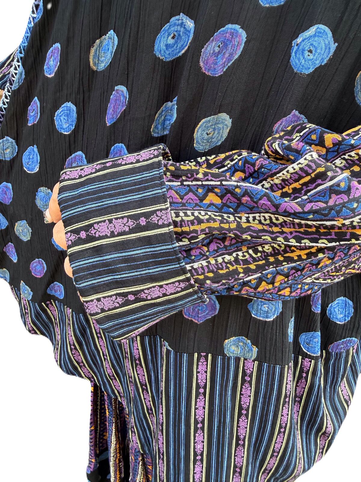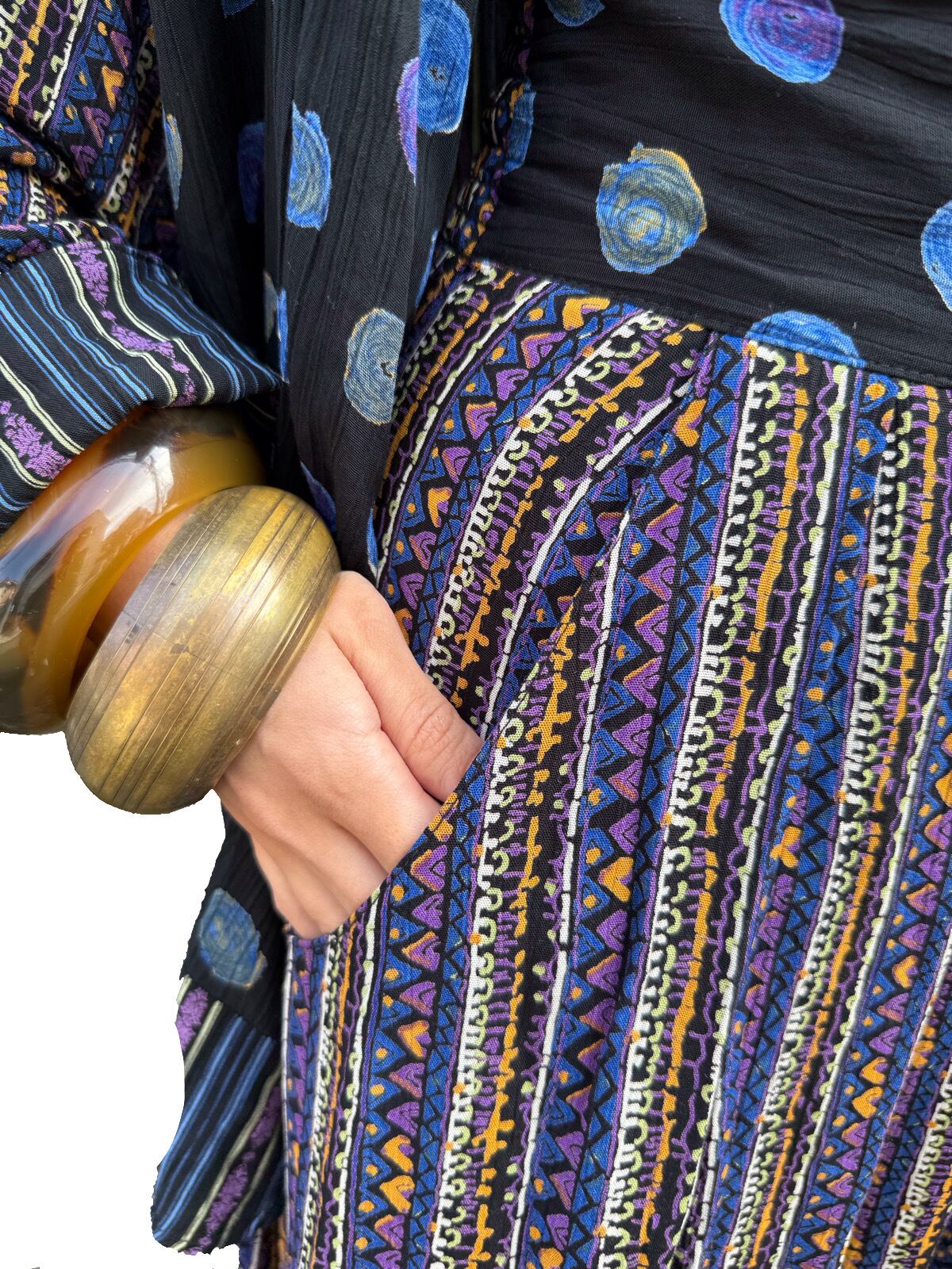 ネイビーベースにラベンダーやソイルベージュなど、絶妙カラーに彩られた 手描き風のドットやフォークロアなストライプ。異なる二つの柄が大胆にミックスされた オープンフロントジャケットとラップスカート。縁どりにグラデーションのステッチまで入った、手の込んだデザインです。