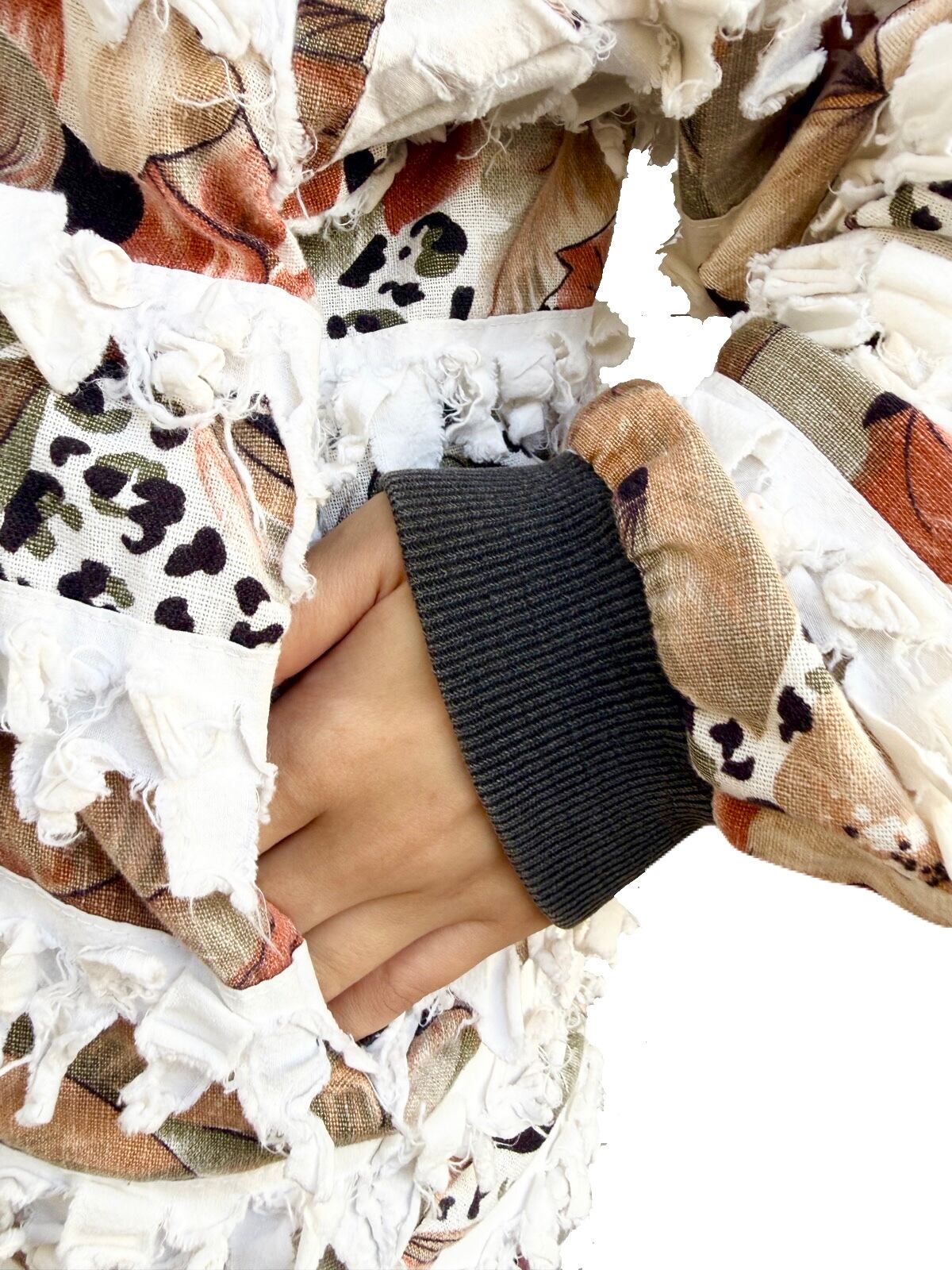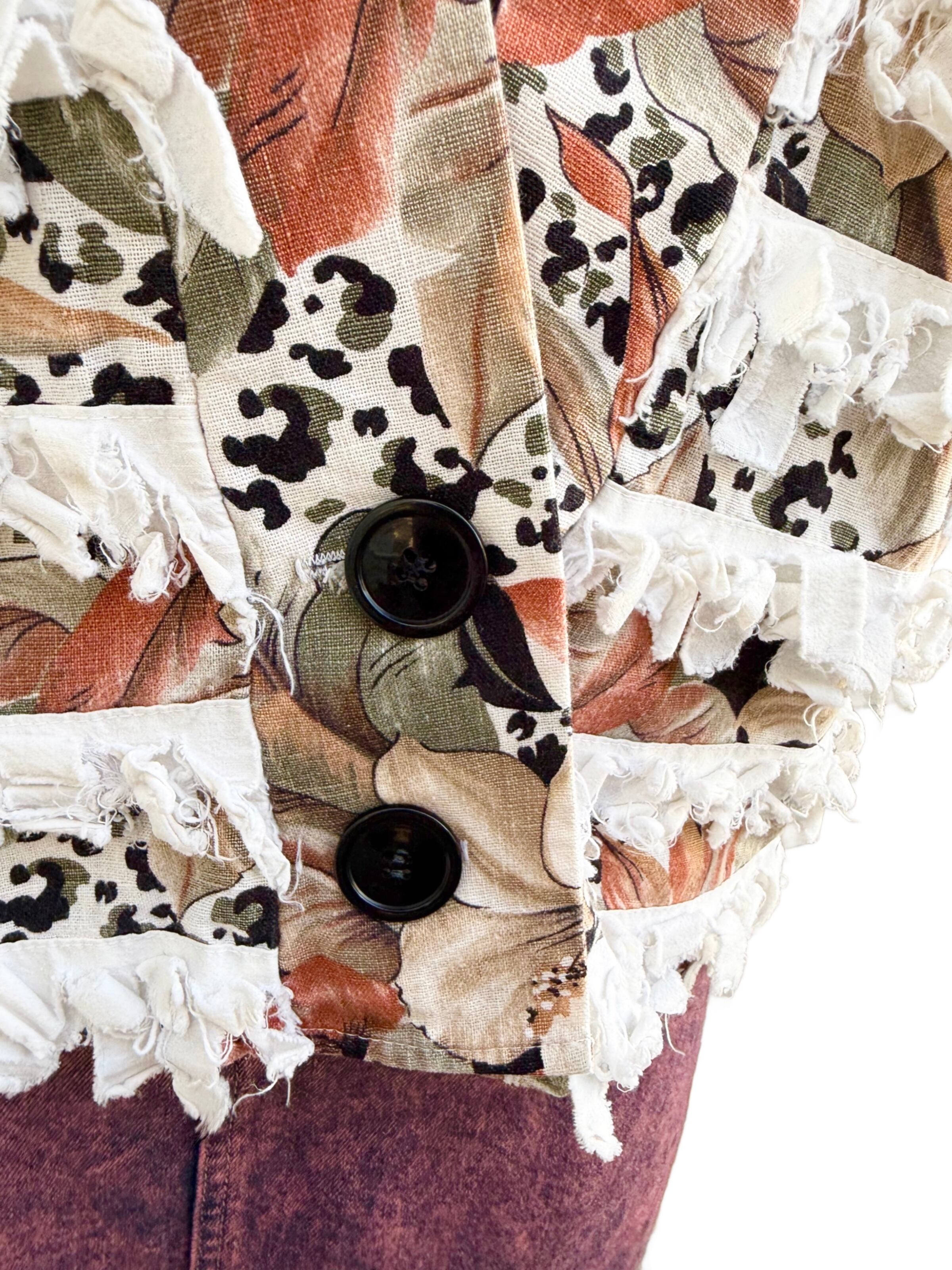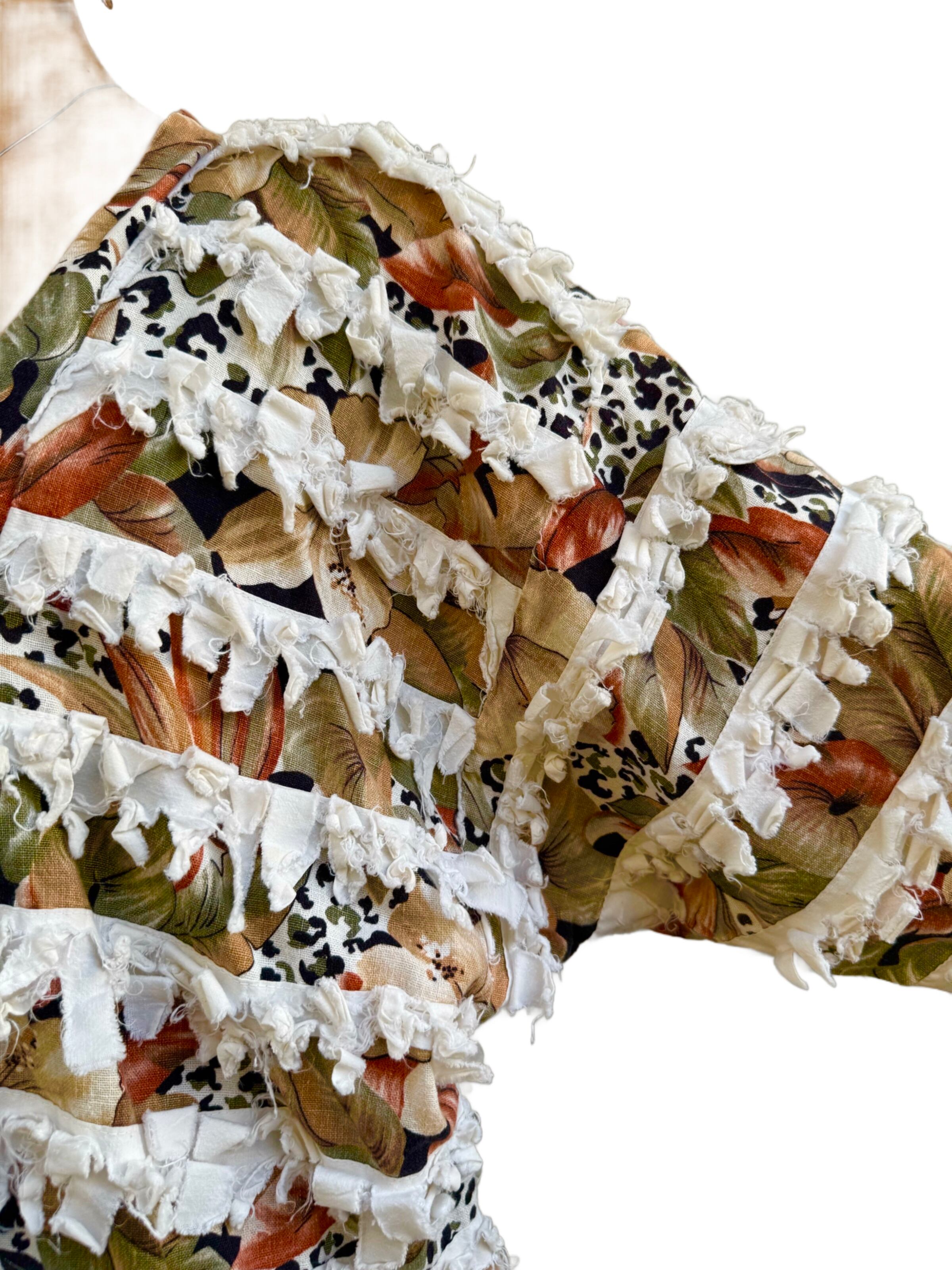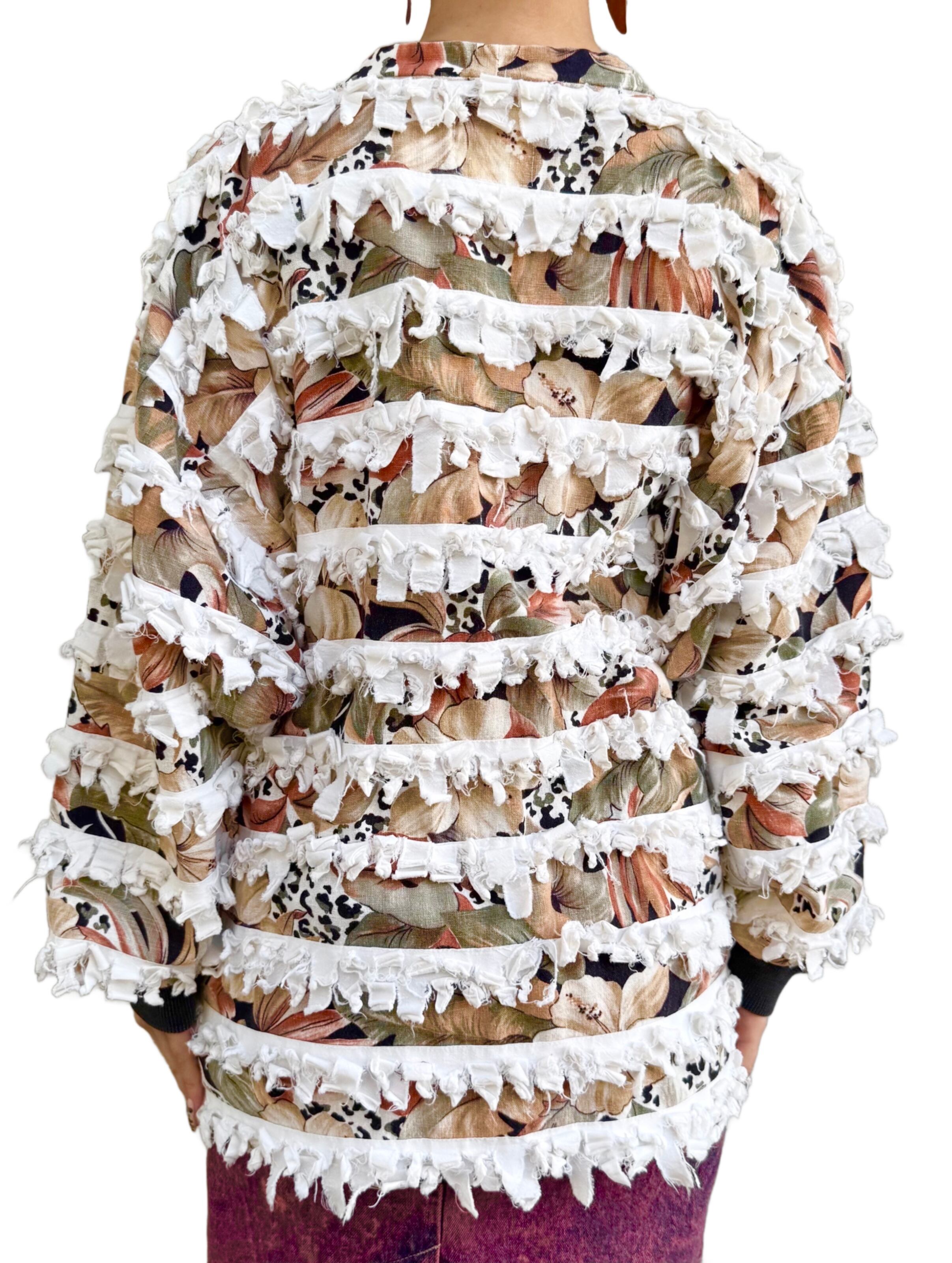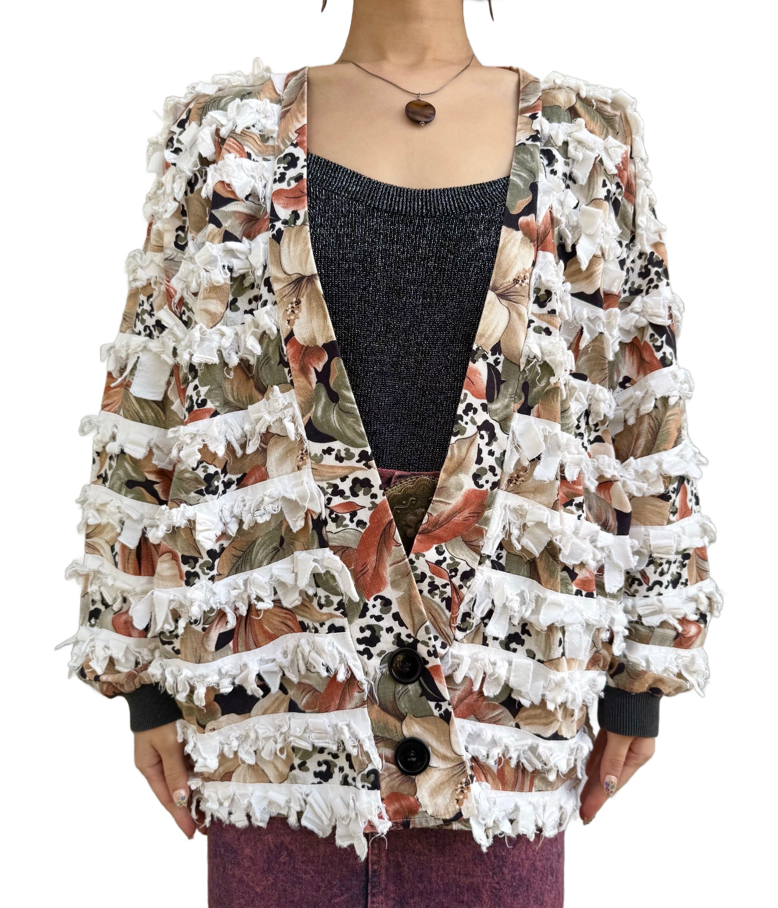 アニマルやエキゾチックフラワーを組み合わせたユニークなプリント生地に、オフホワイトの手裂きのようなフリンジが たっぷりとあしらわれた80’sジャケット。