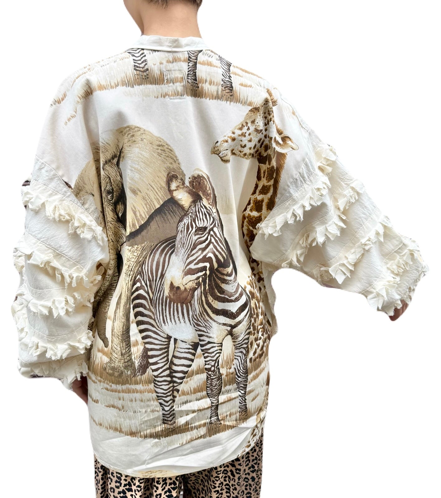 一見シンプルなホワイトジャケット…と思いきや、バックスタイルには大胆なアニマルがプリントされている 80’sフリンジジャケット。