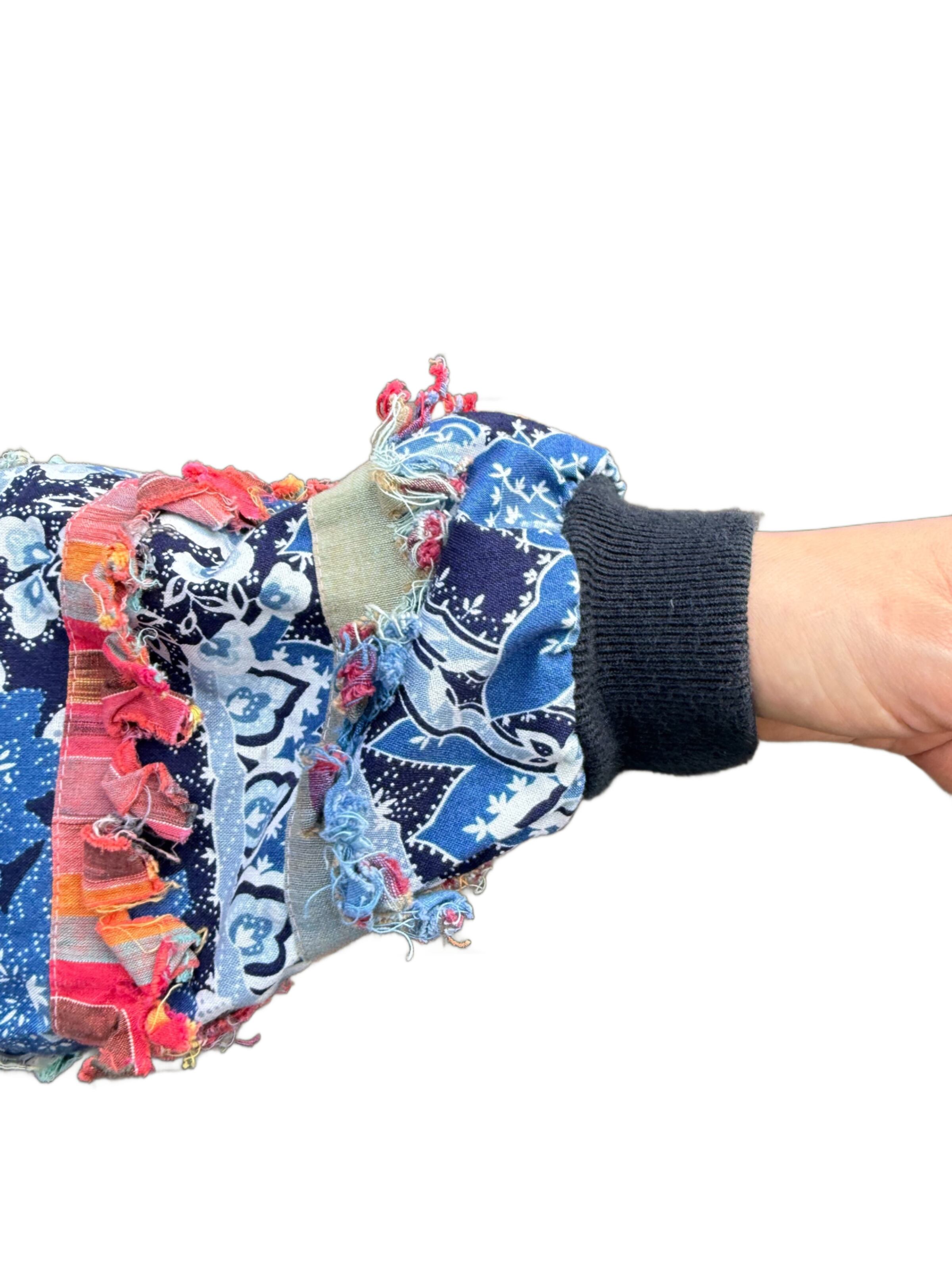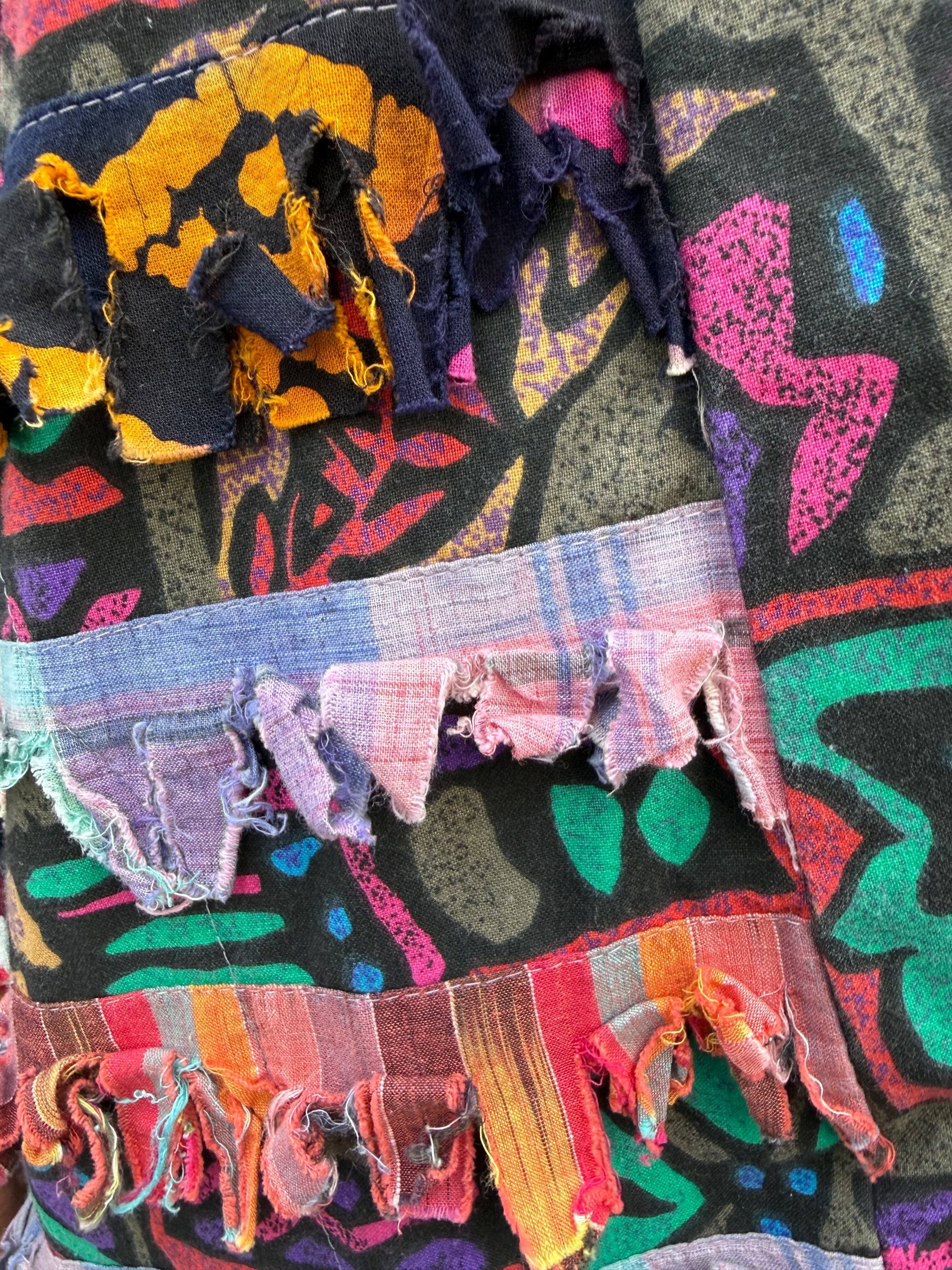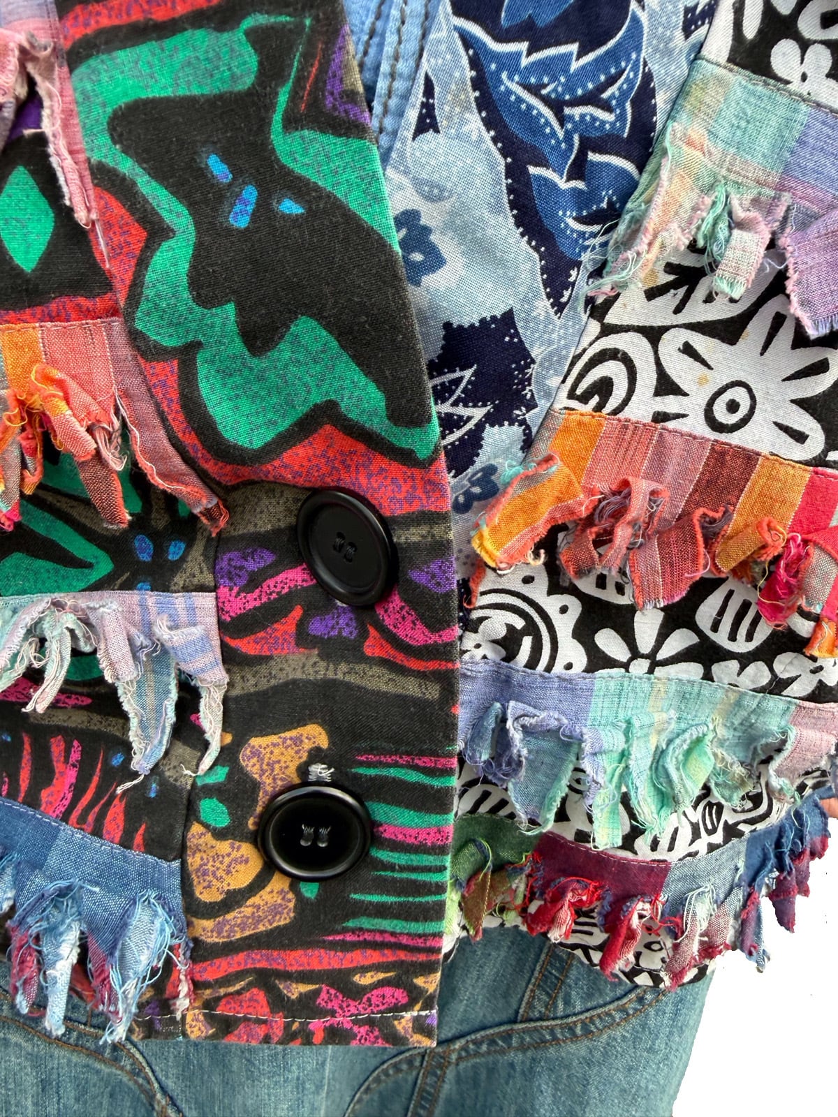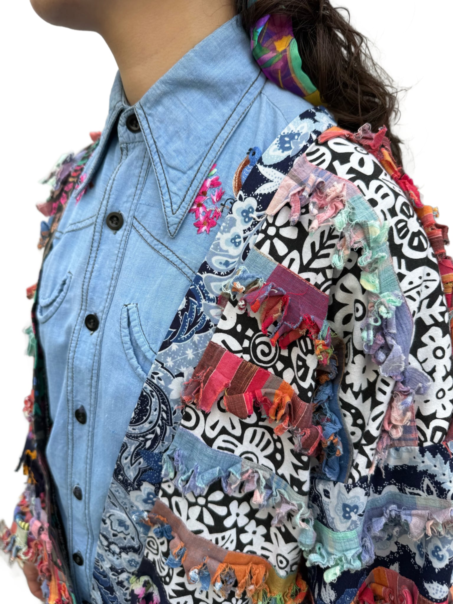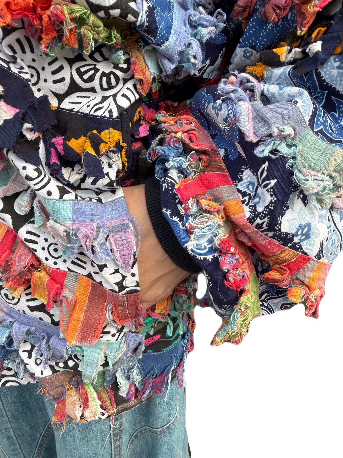エスニックやエキゾチックなプリントに、どことなくステンドグラスのように感じるプリント、マドラスチェックに、可愛らしい花など…様々なテキスタイルをミックスさせながら、最高なバランスでデザインされた フリンジジャケット。