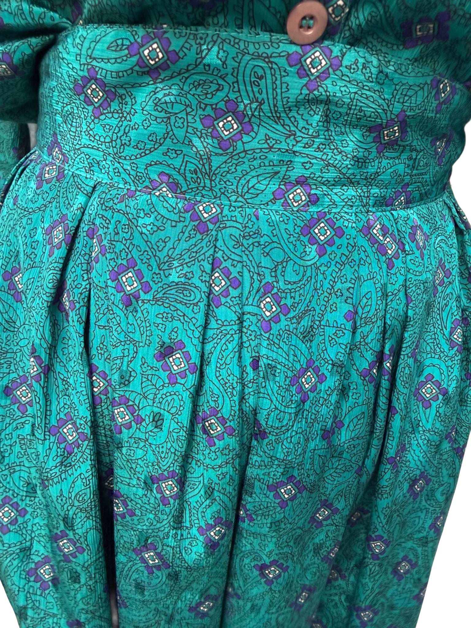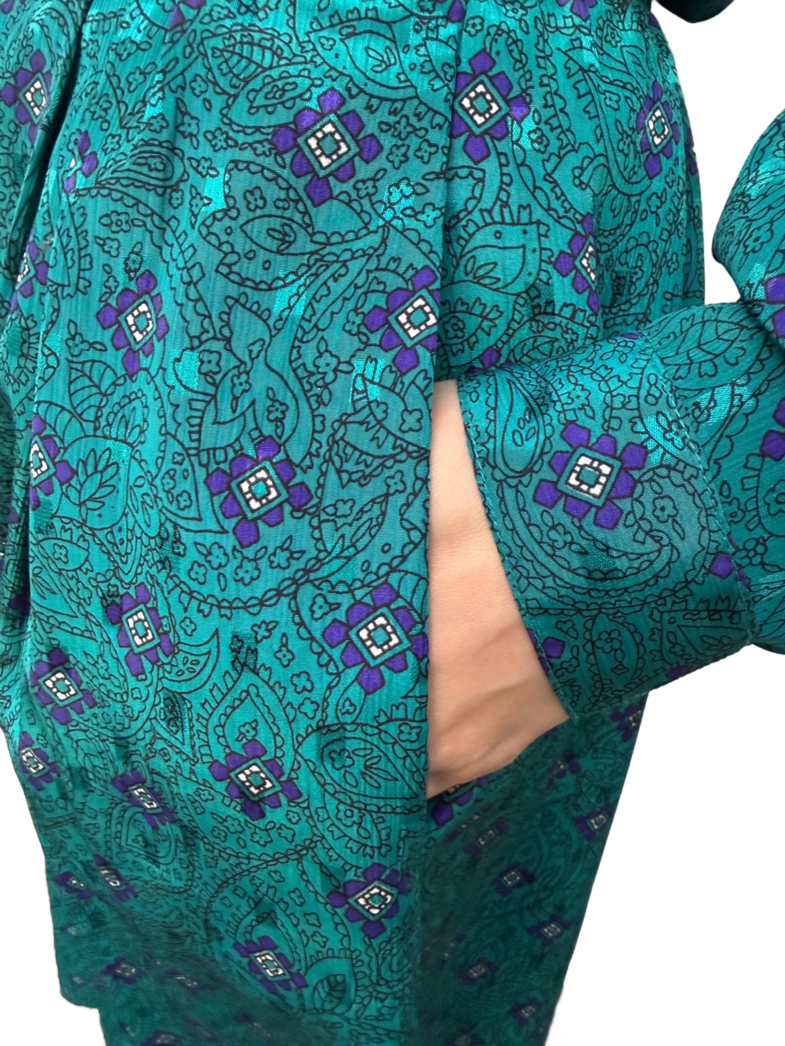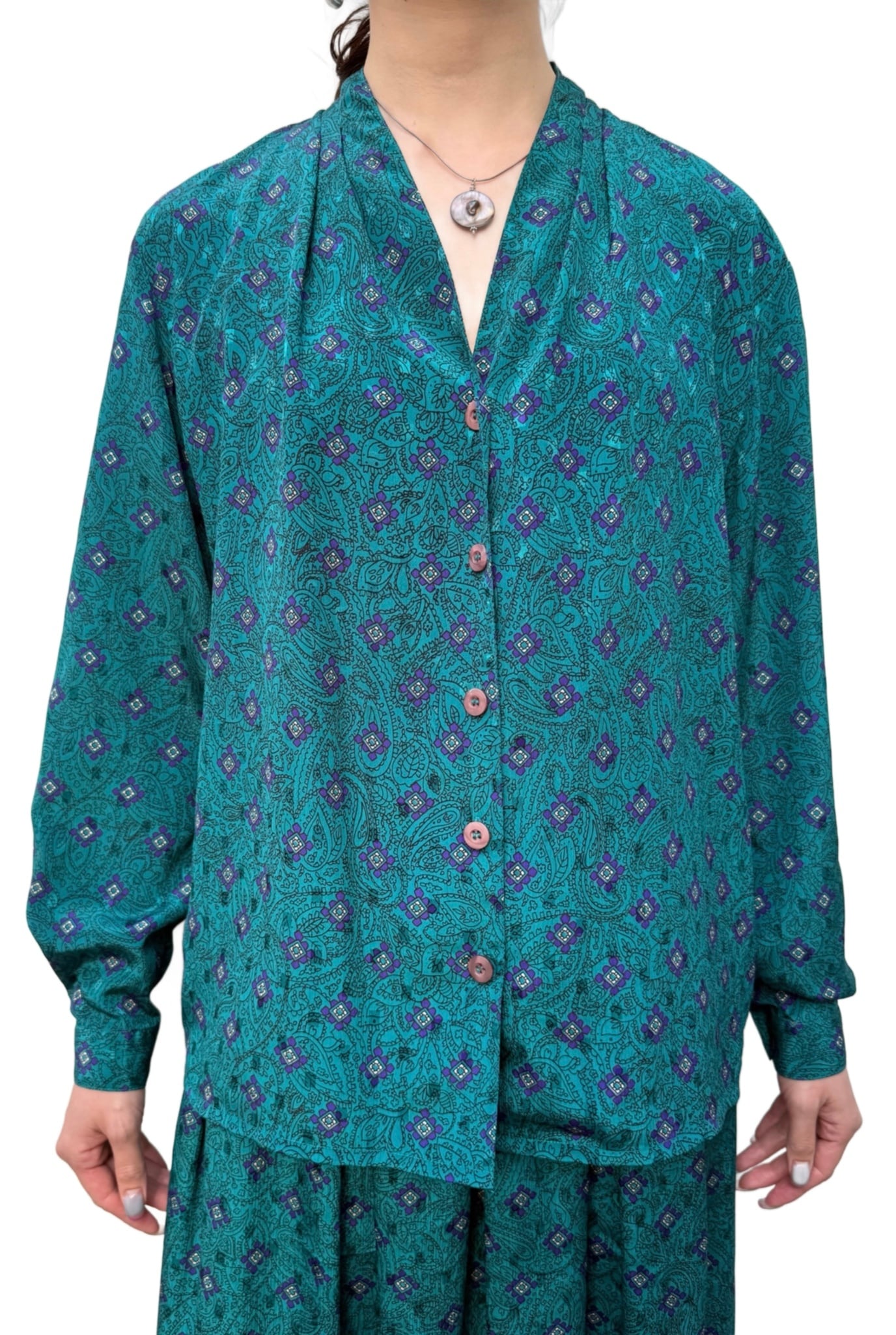 清々しく奥行きを感じさせる グリーンのヴィンテージセットアップ。ペイズリーと スクエアーの織柄はどことなく凛としたマニッシュさがあります。
