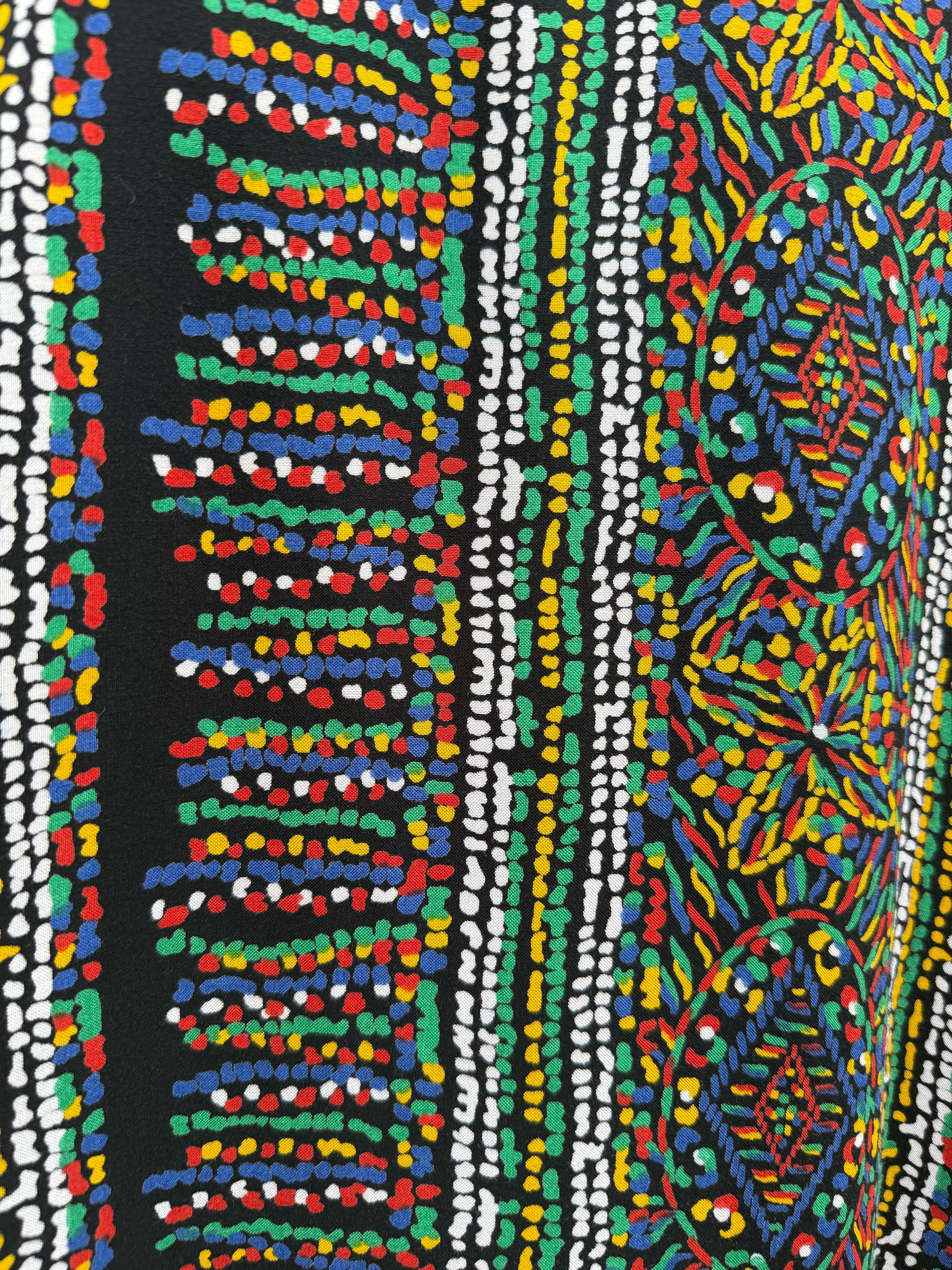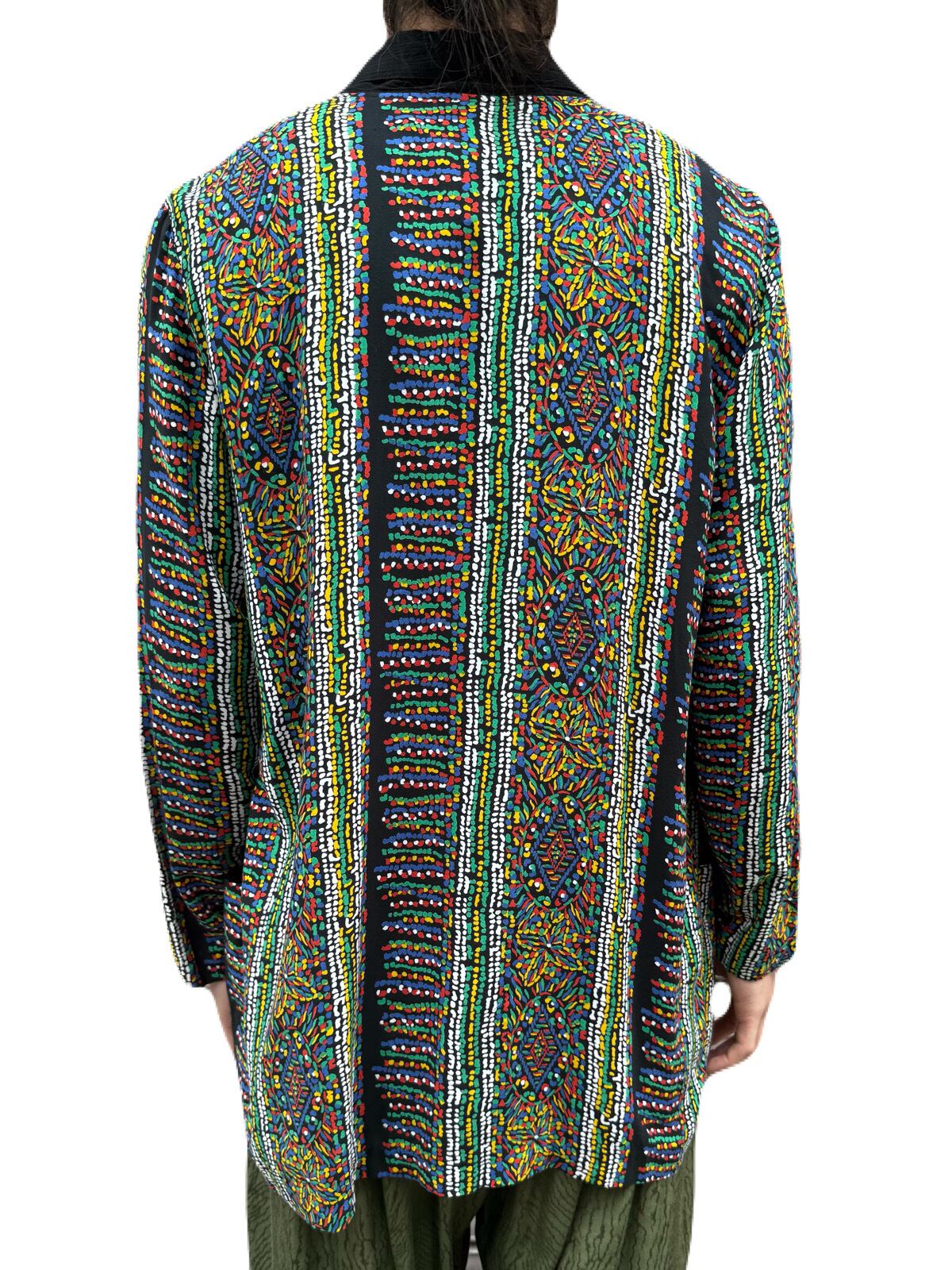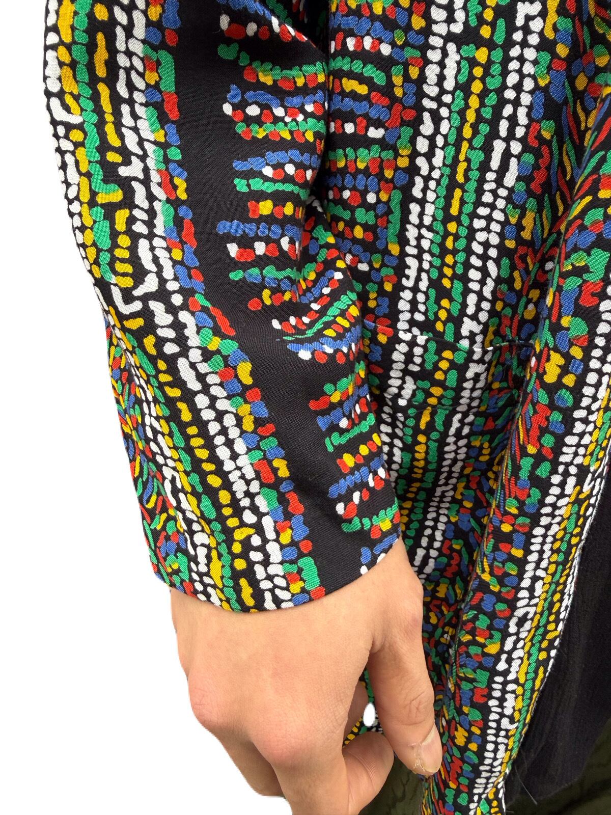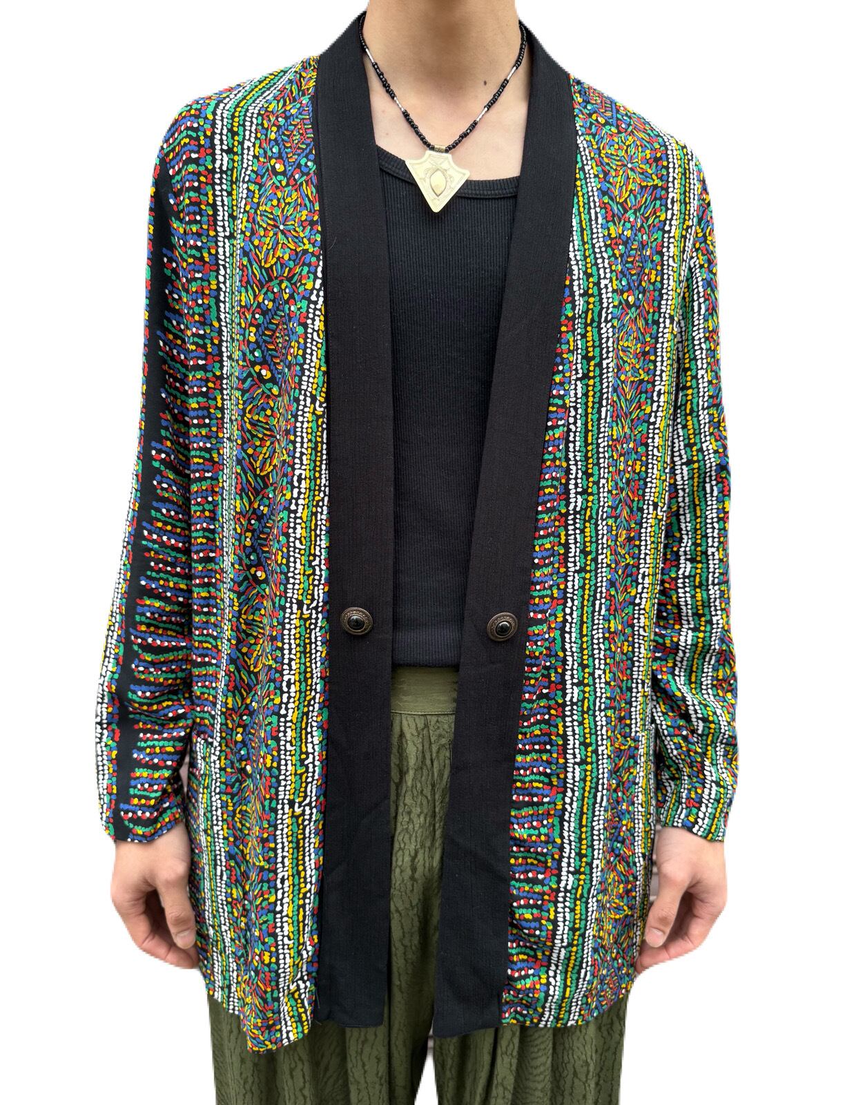 モザイクアートを見ているような テキスタイルデザインに、ブラックを効かせたオープンフロントジャケット。