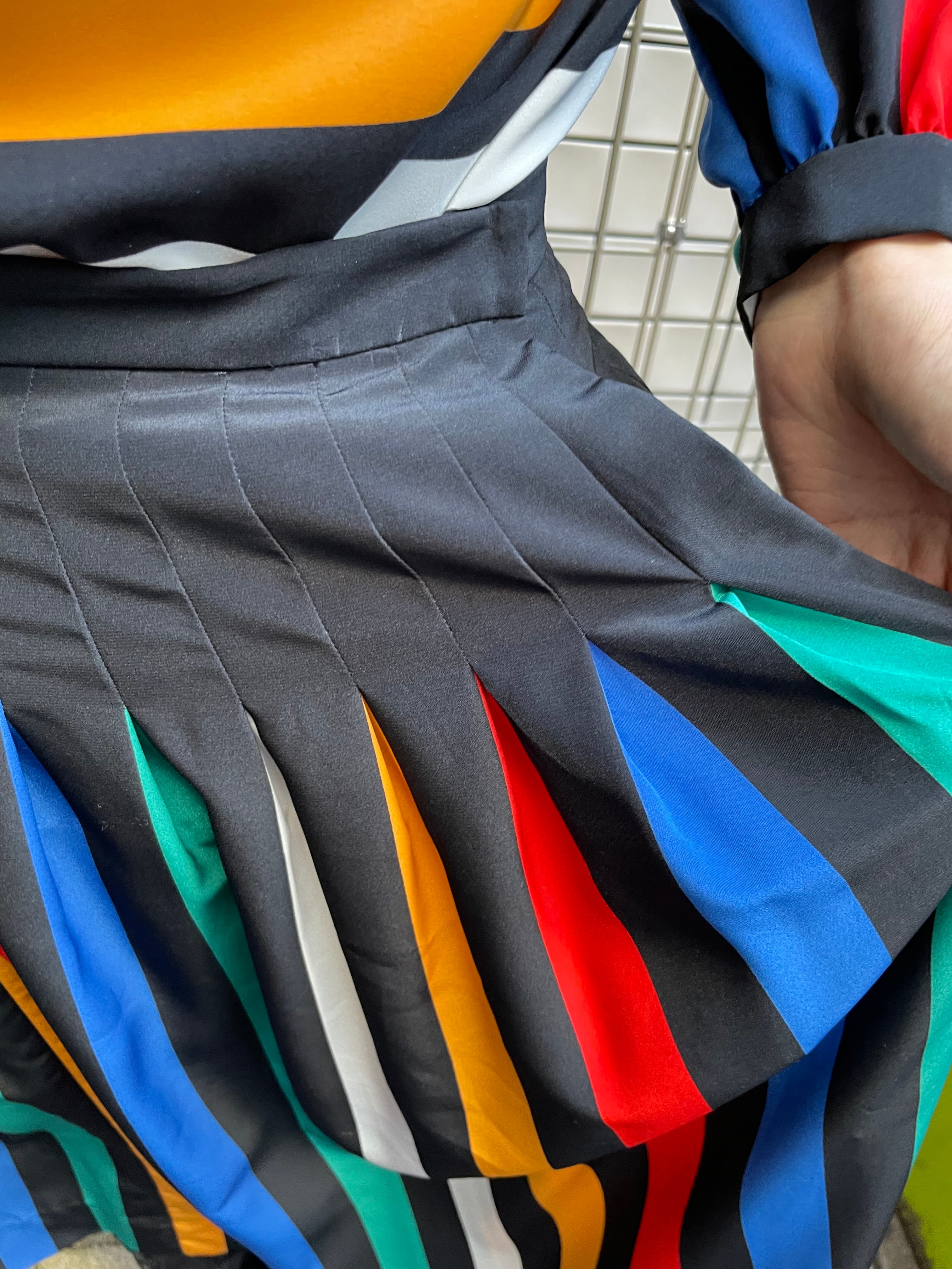 スカート上部にはオールブラックに見えるようにタックが取られ、動きによりカラフルカラーが見え隠れするところがとてもお洒落です。