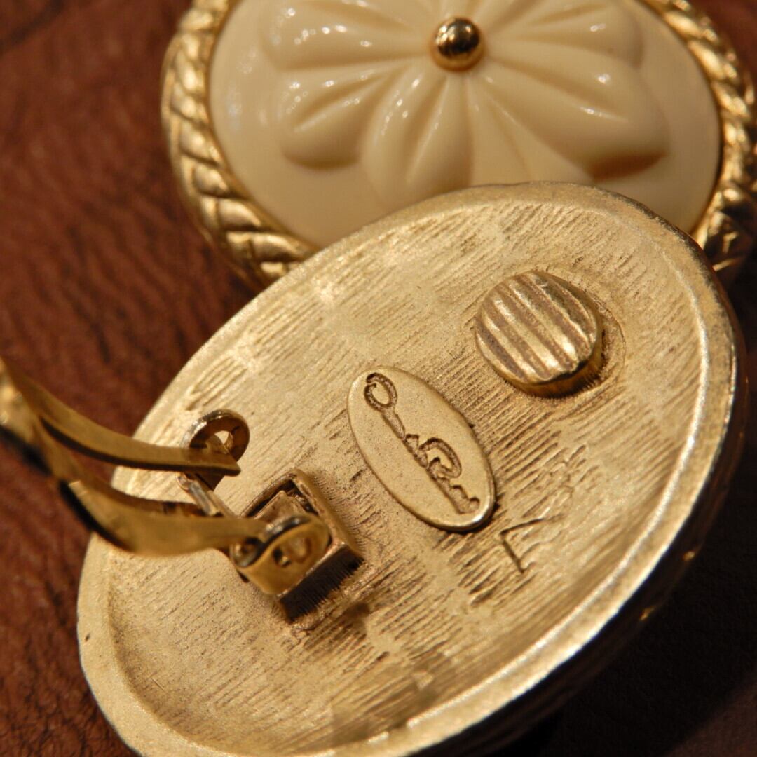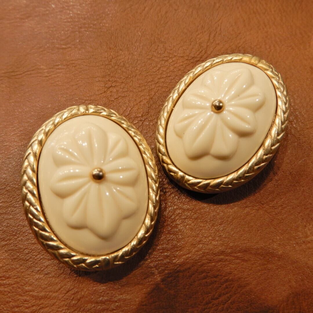 ころんとしたフォルムとアイボリーのレトロなレリーフが可愛らしいOscar de la Renta の大振りイヤリング。
