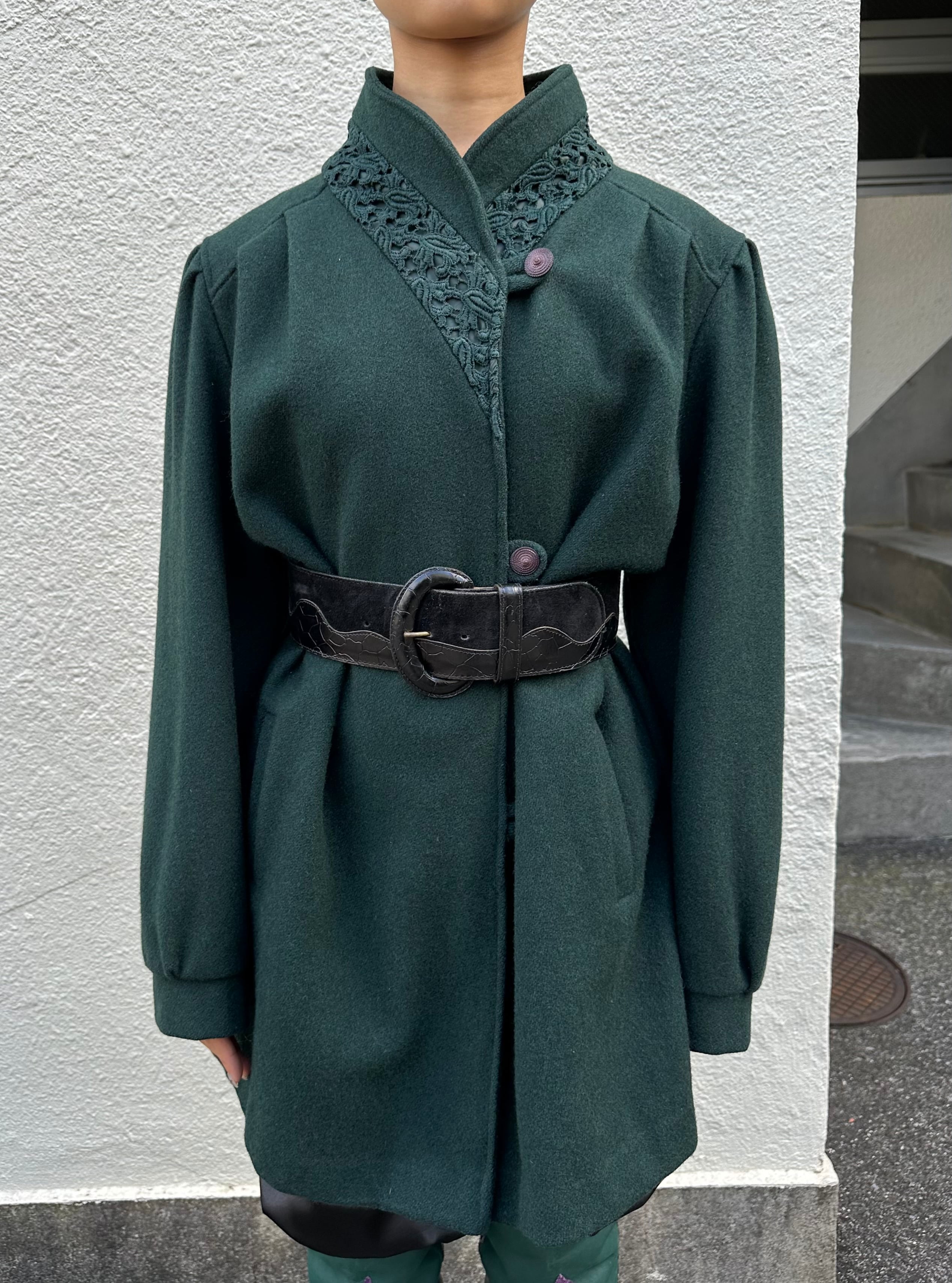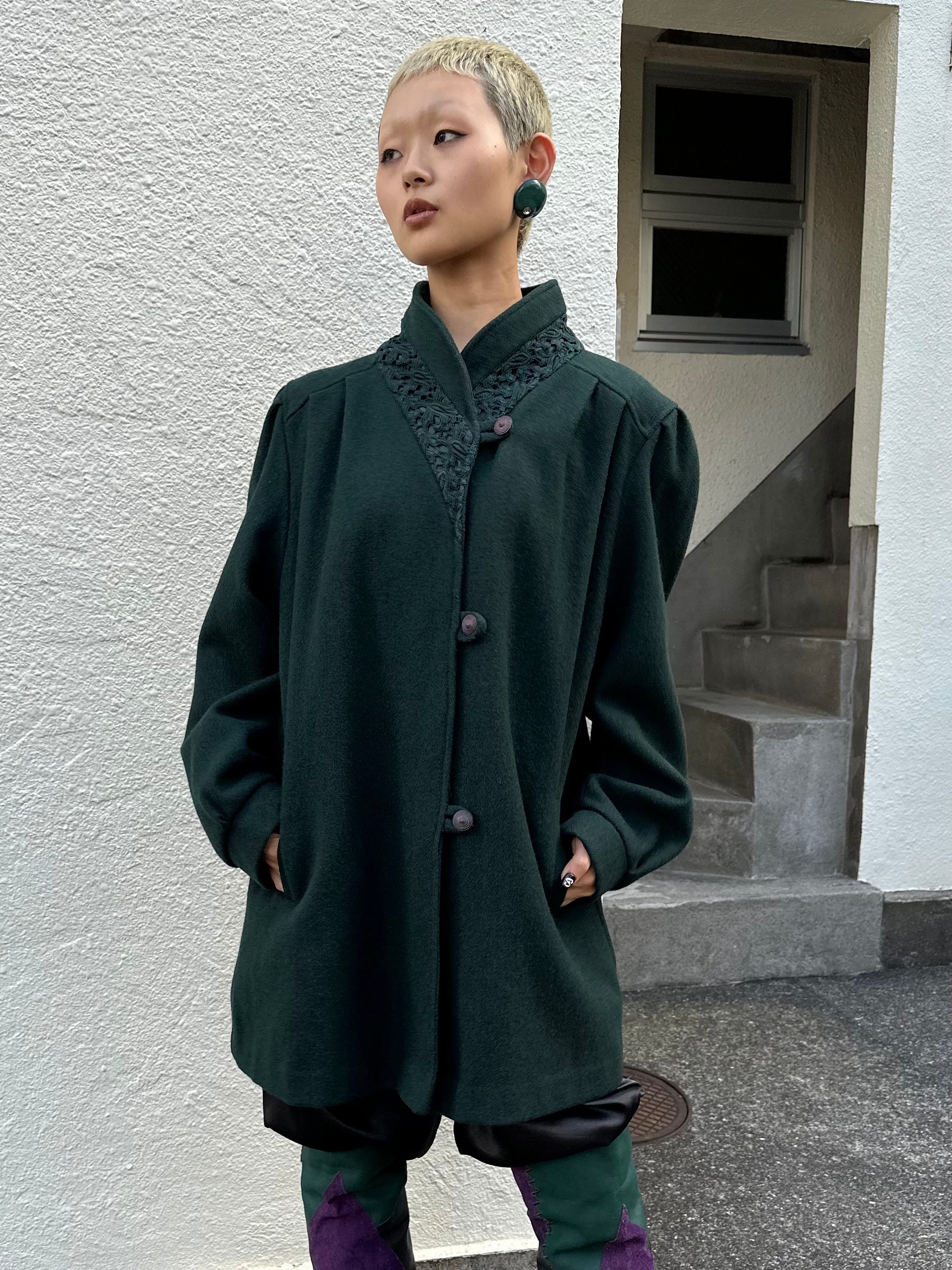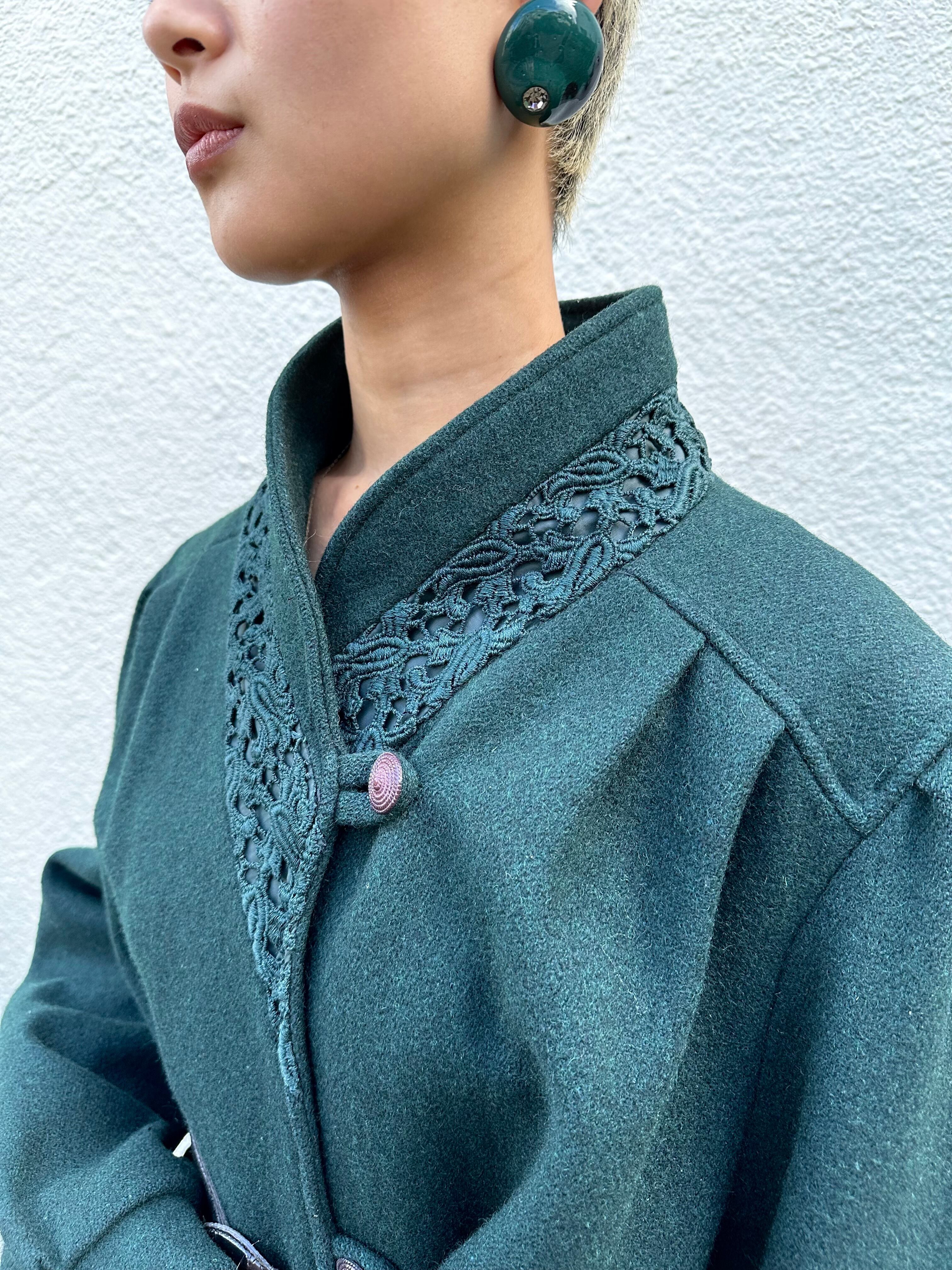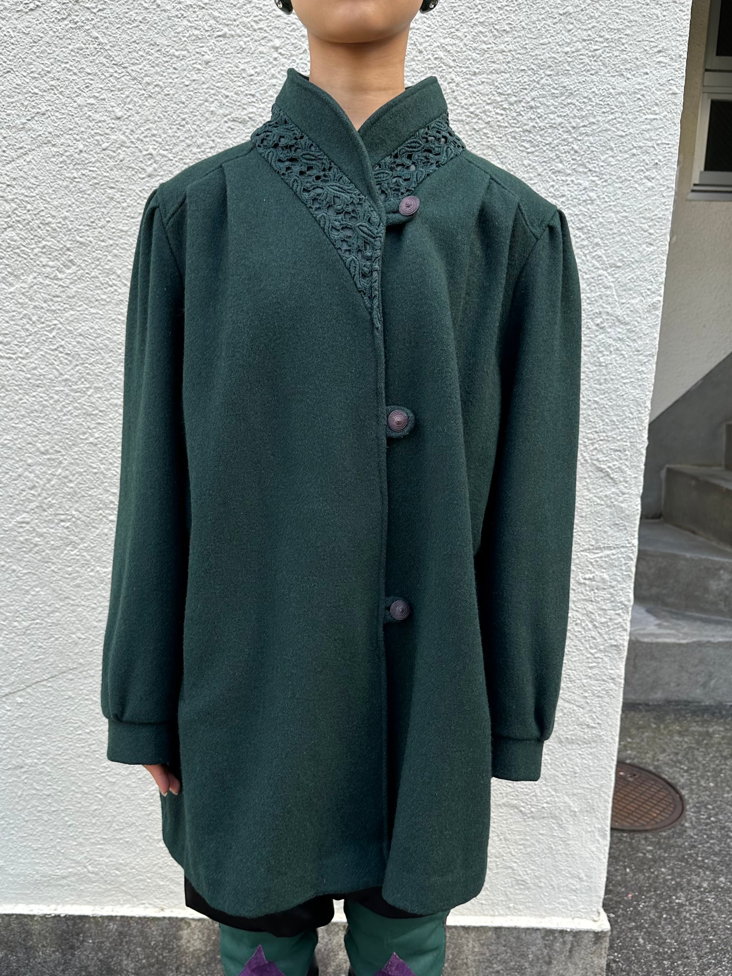 襟周りあしらわれた、 厚みのあるコットンレース。ヴィンテージながら今が旬のフォレストグリーンのウールコートです。