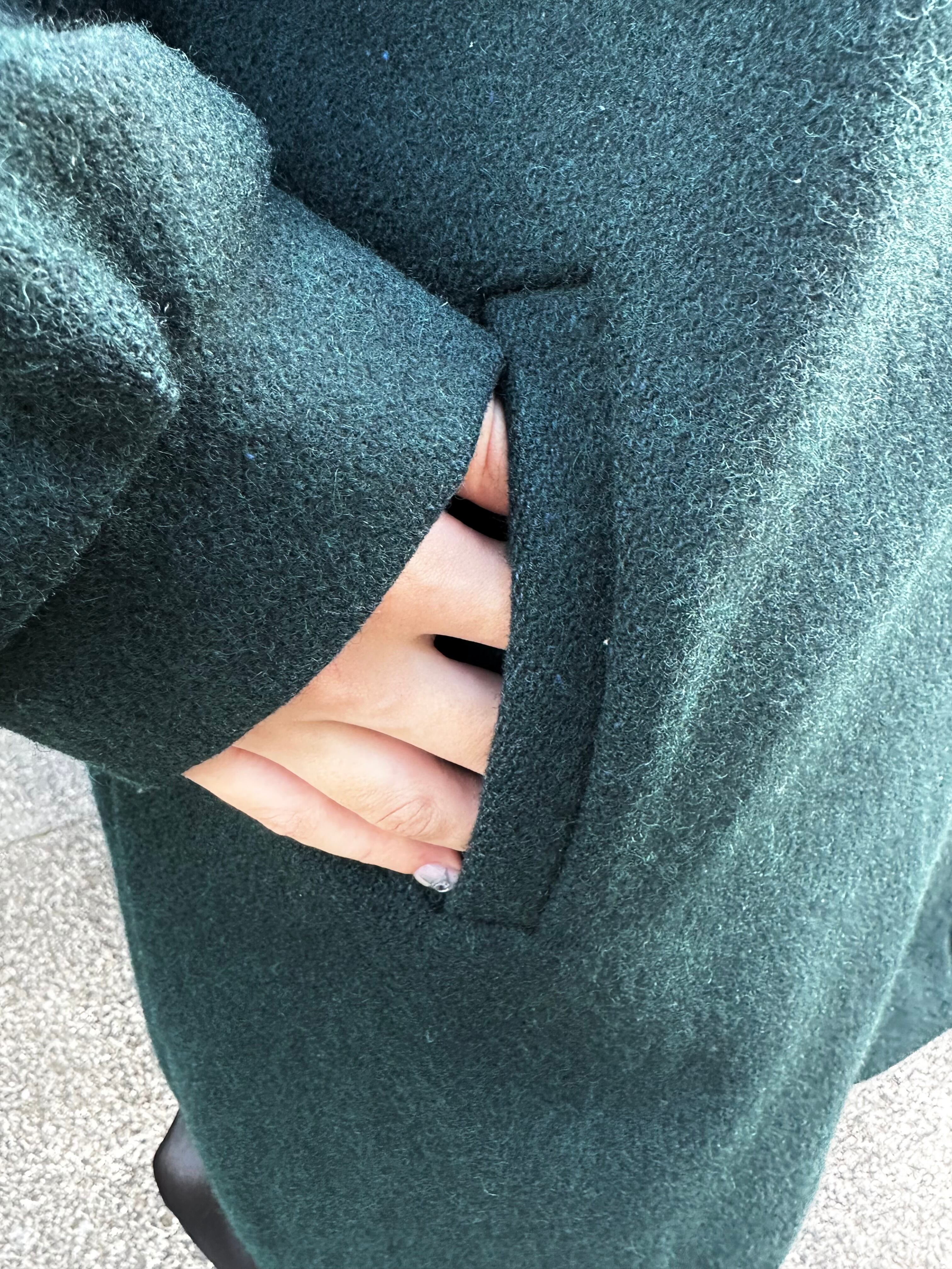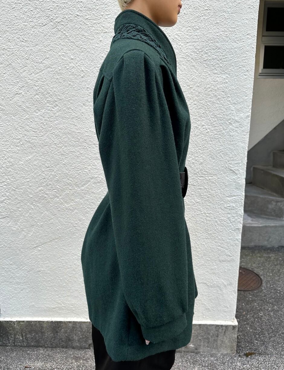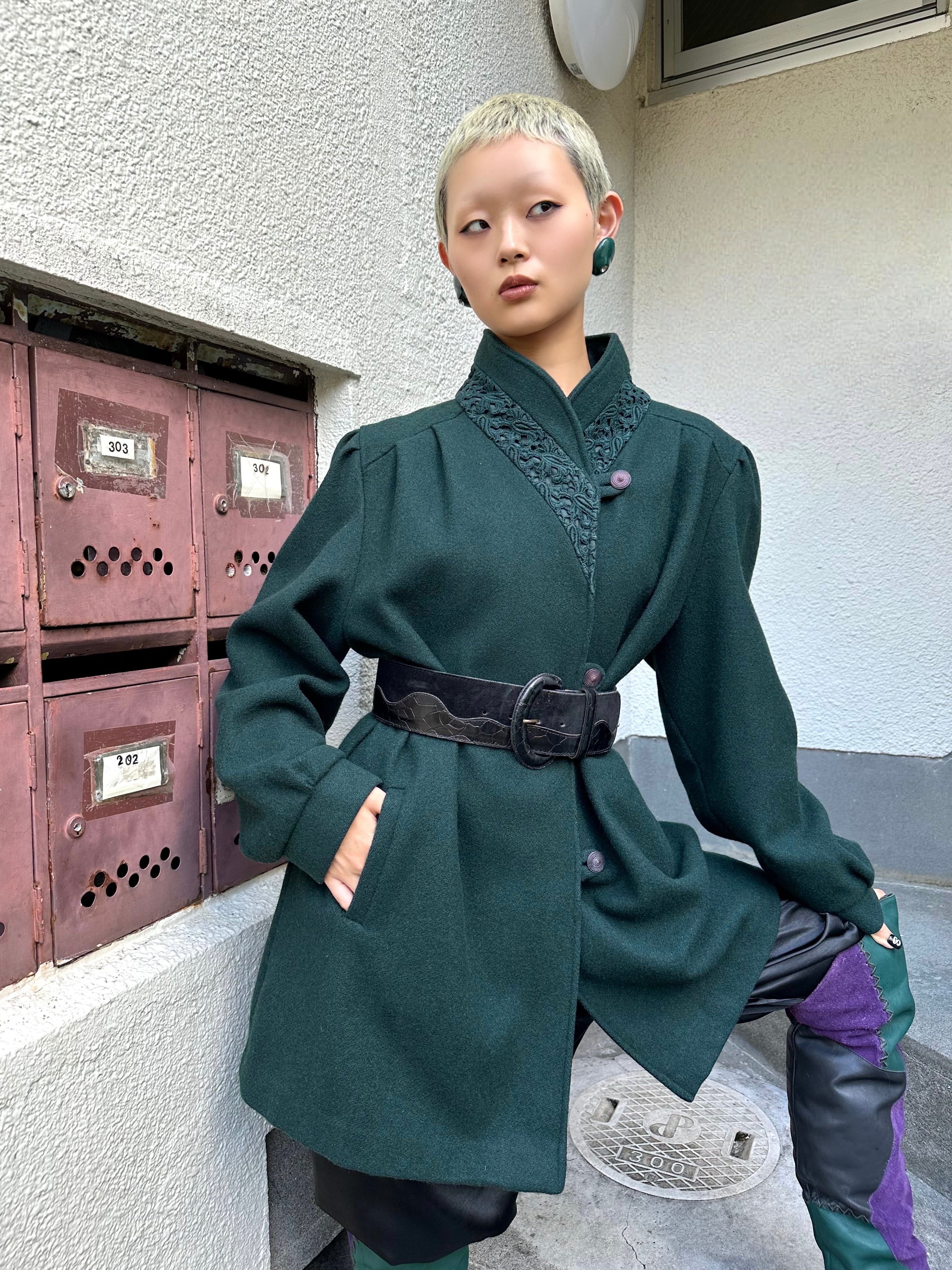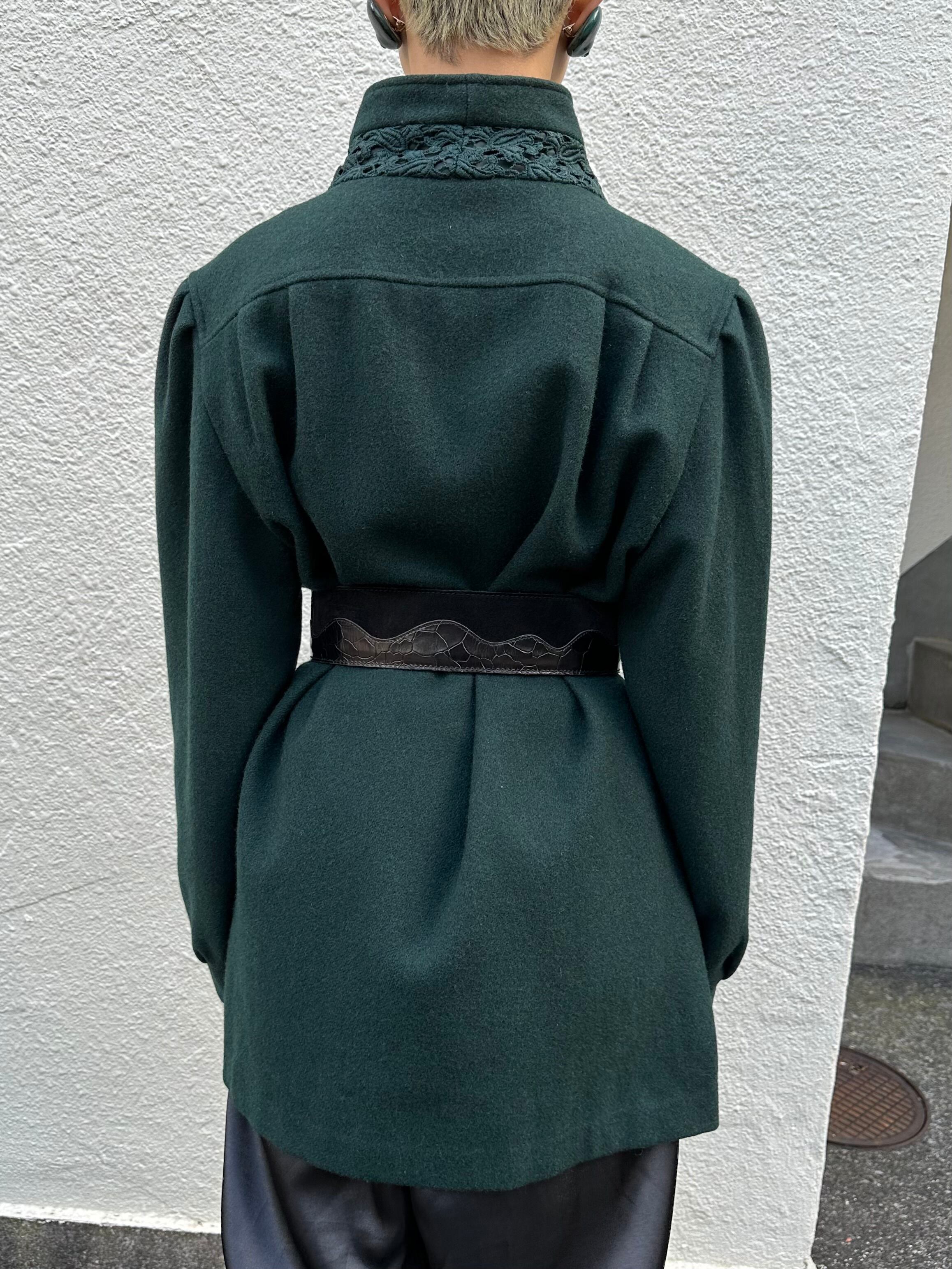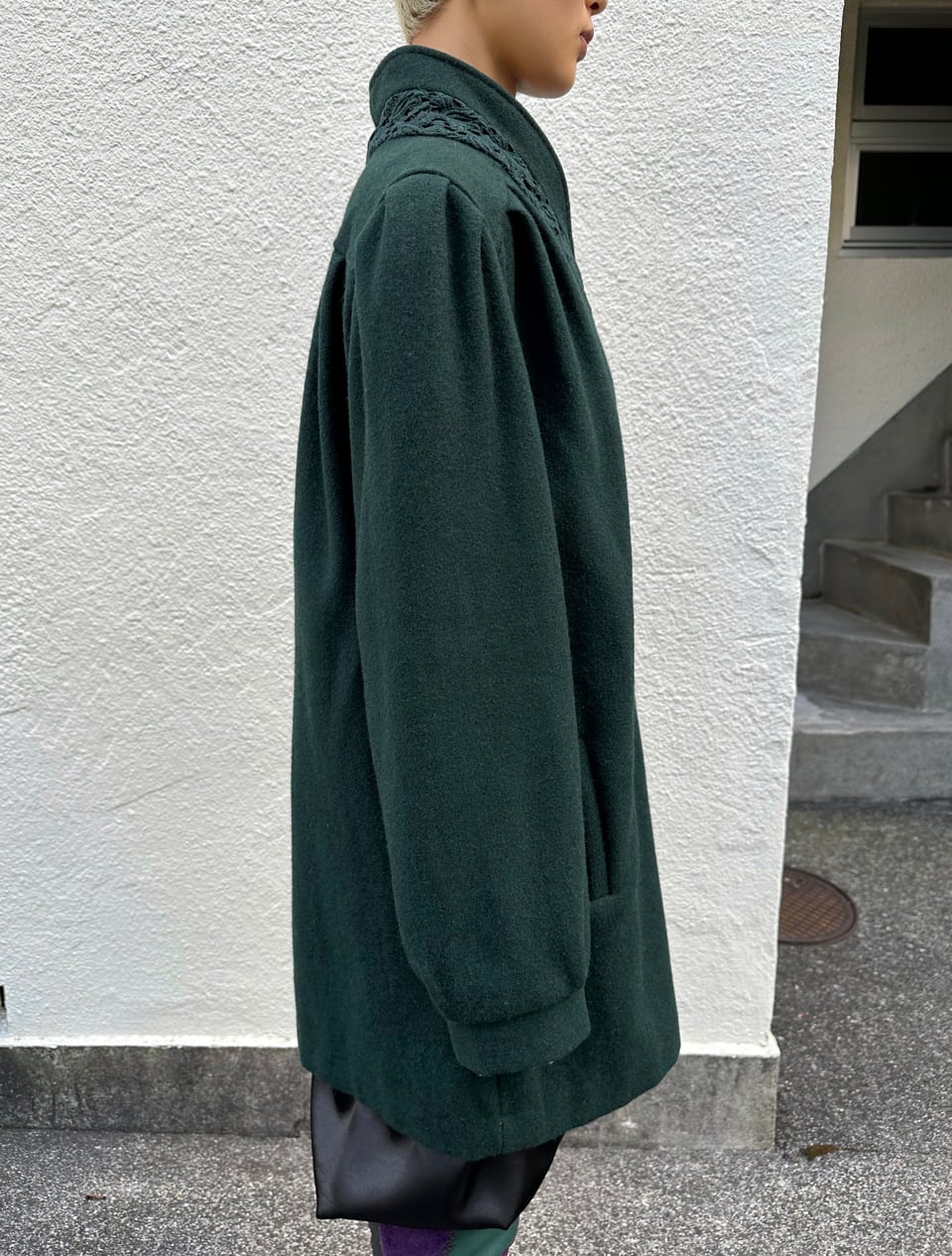 襟周りあしらわれた、 厚みのあるコットンレース。ヴィンテージながら今が旬のフォレストグリーンのウールコートです。