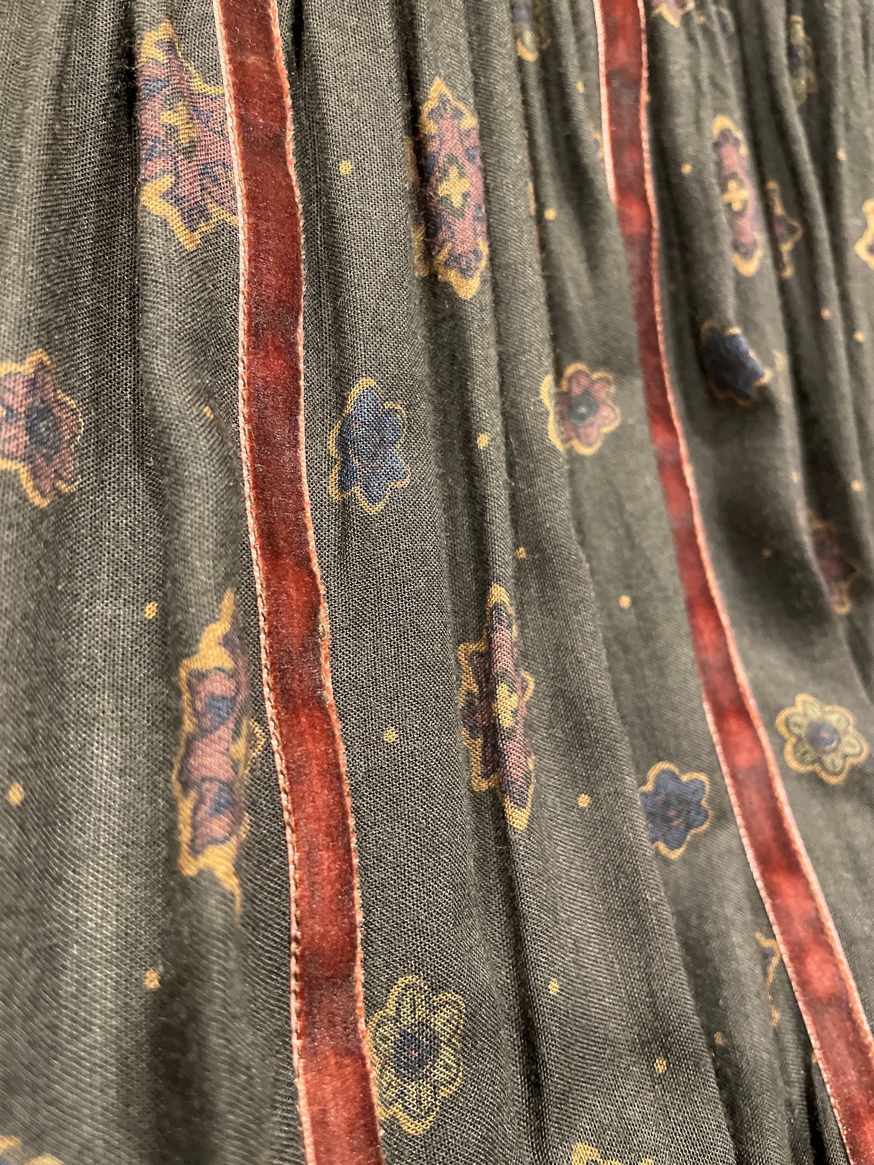 ローウエスト気味に始まるボトム部分には細かなギャザーが寄せられ、更にベルベットのリボンが挟み込まれてます。