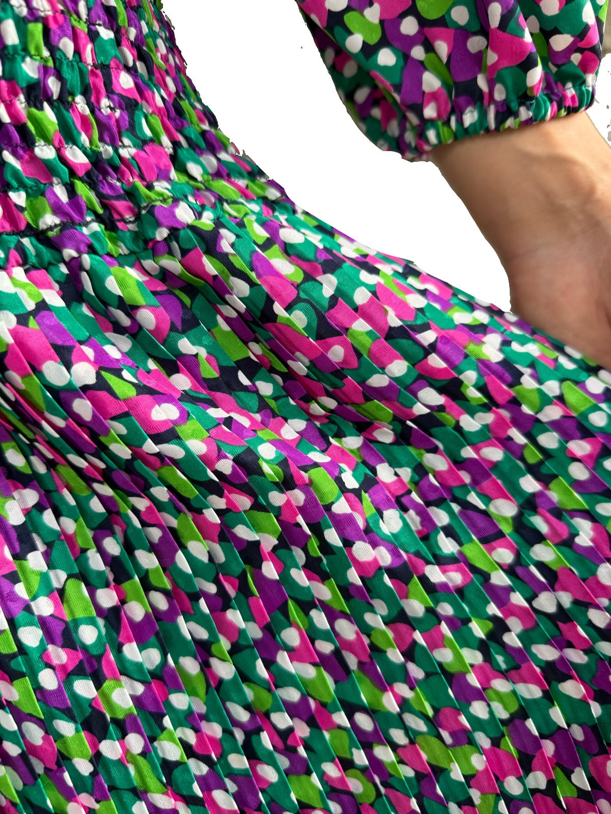 点で描かれたジオメトリックプリント。カラフルながら、清々しさがあるSusan Freisのワンピース。