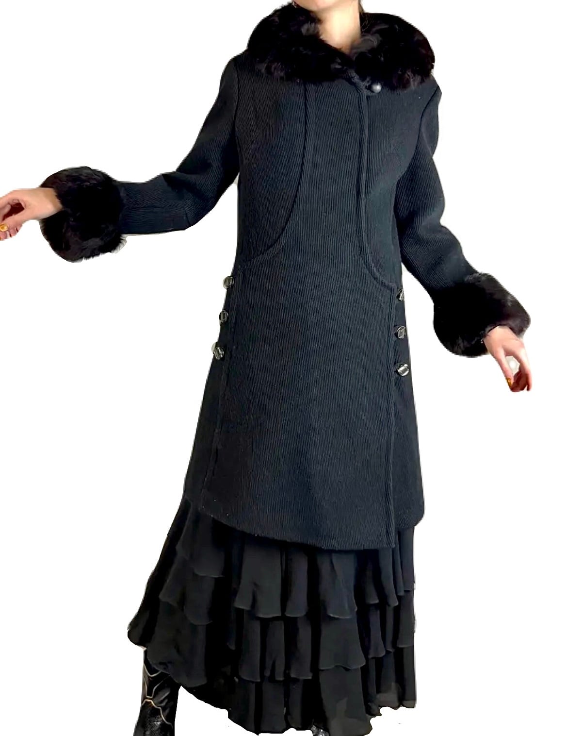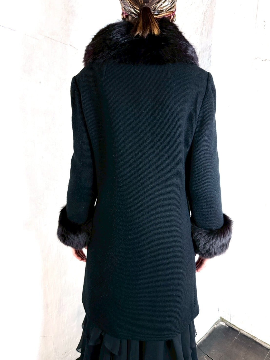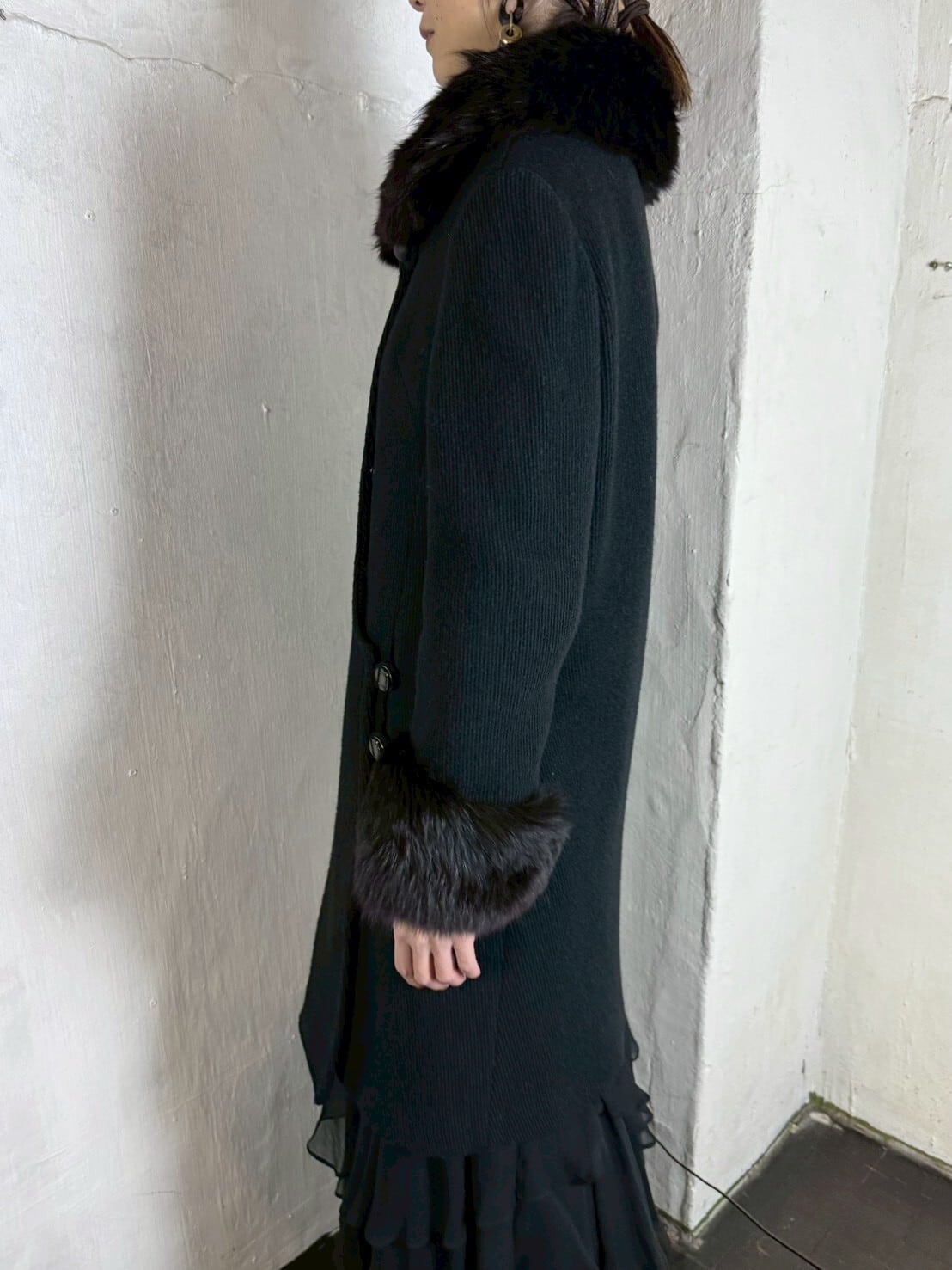 襟とカフスに施された大胆なブラック系のファー使いは大変クールで、モダンなデザインにとてもよくマッチしています。