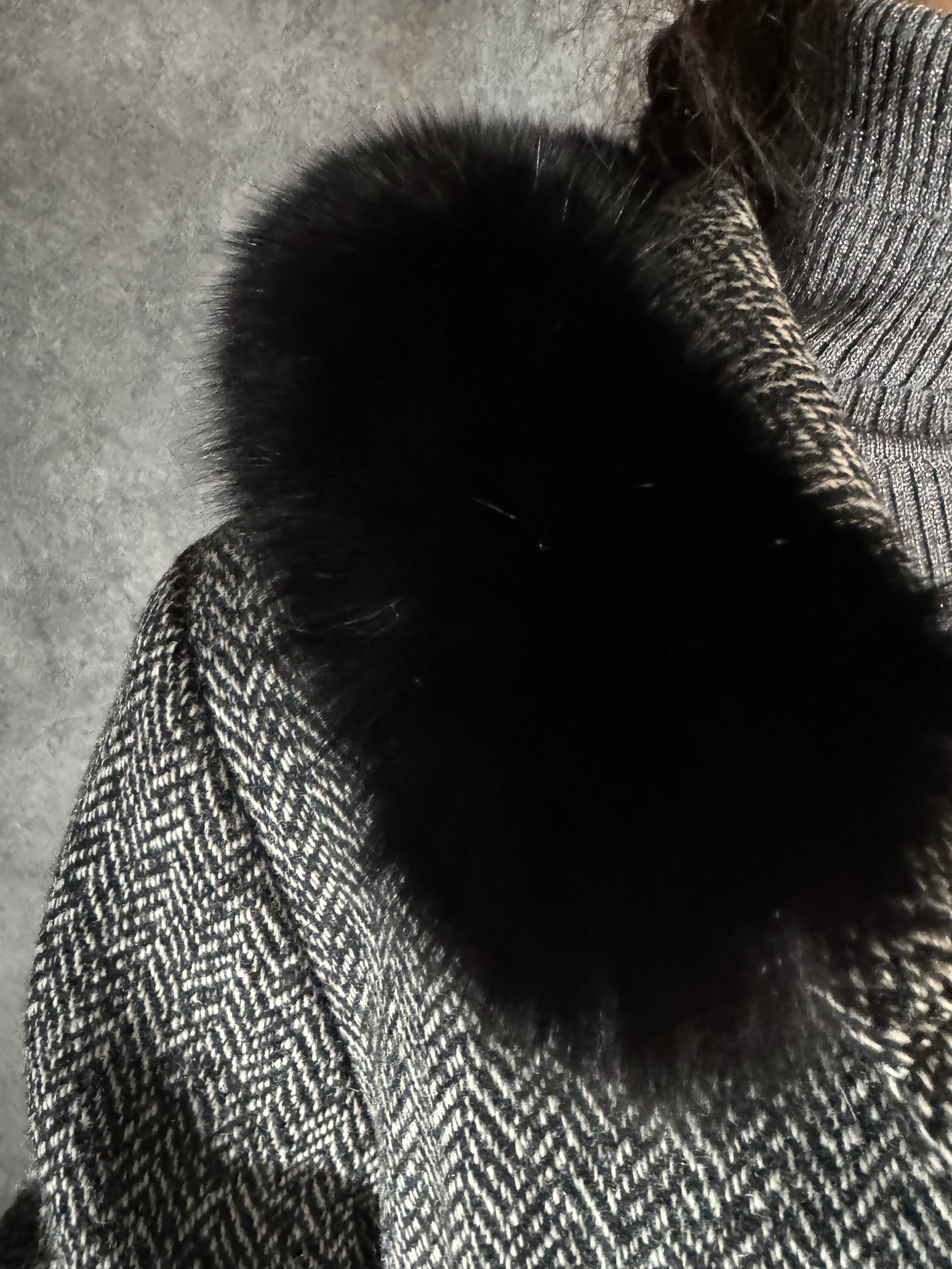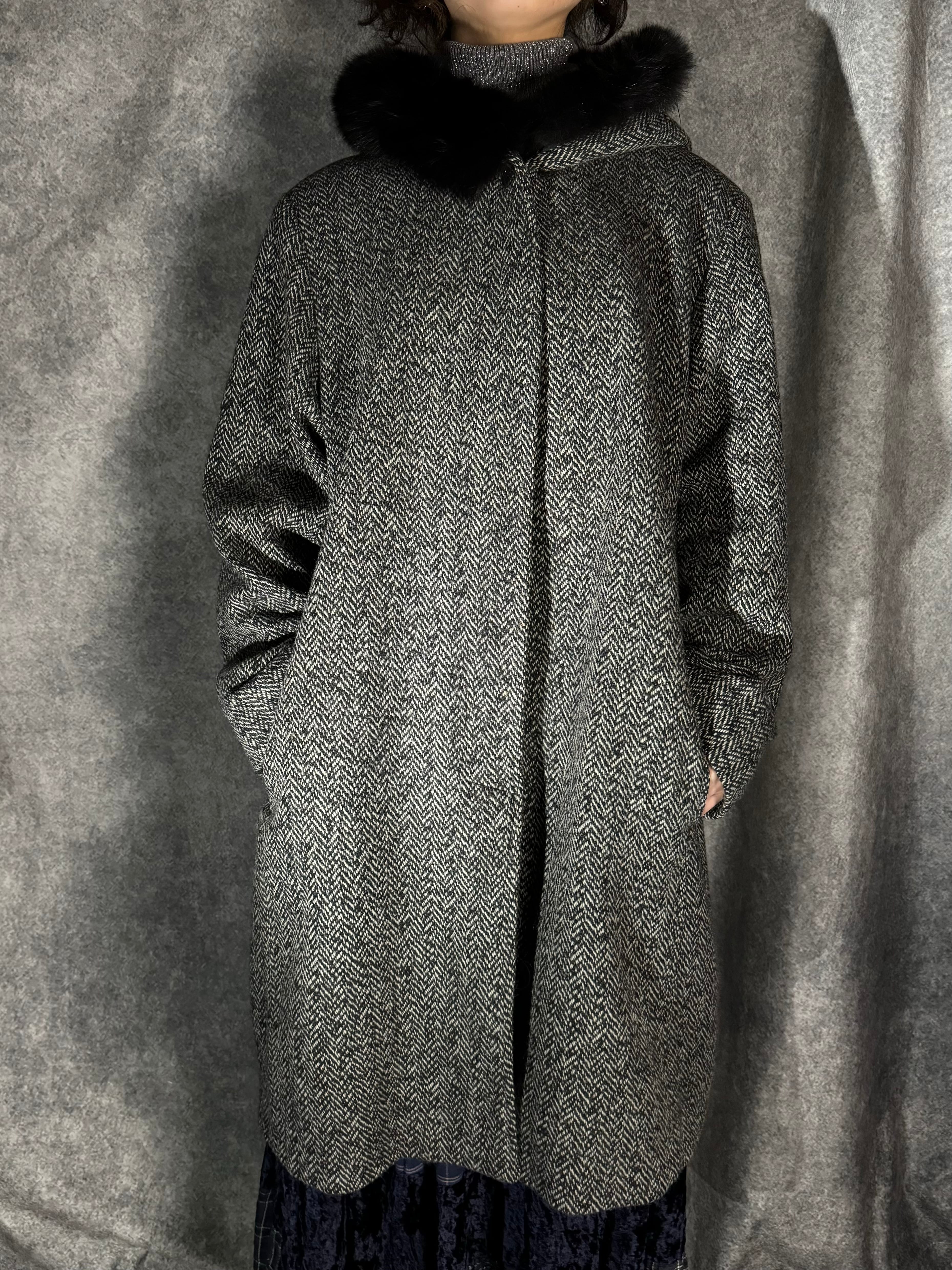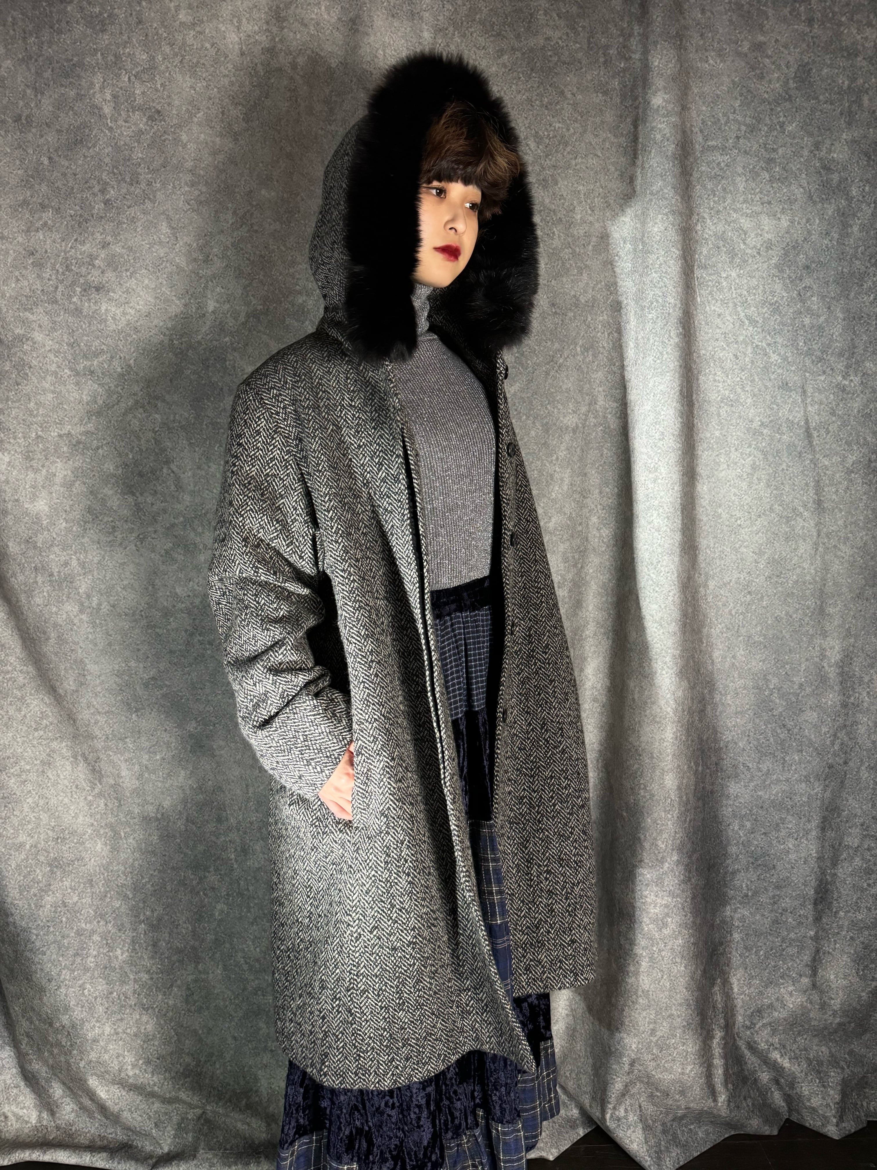 グレーのヘリンボーンに、ブラックファーがトリミングされた深いフード付きのウールコート。