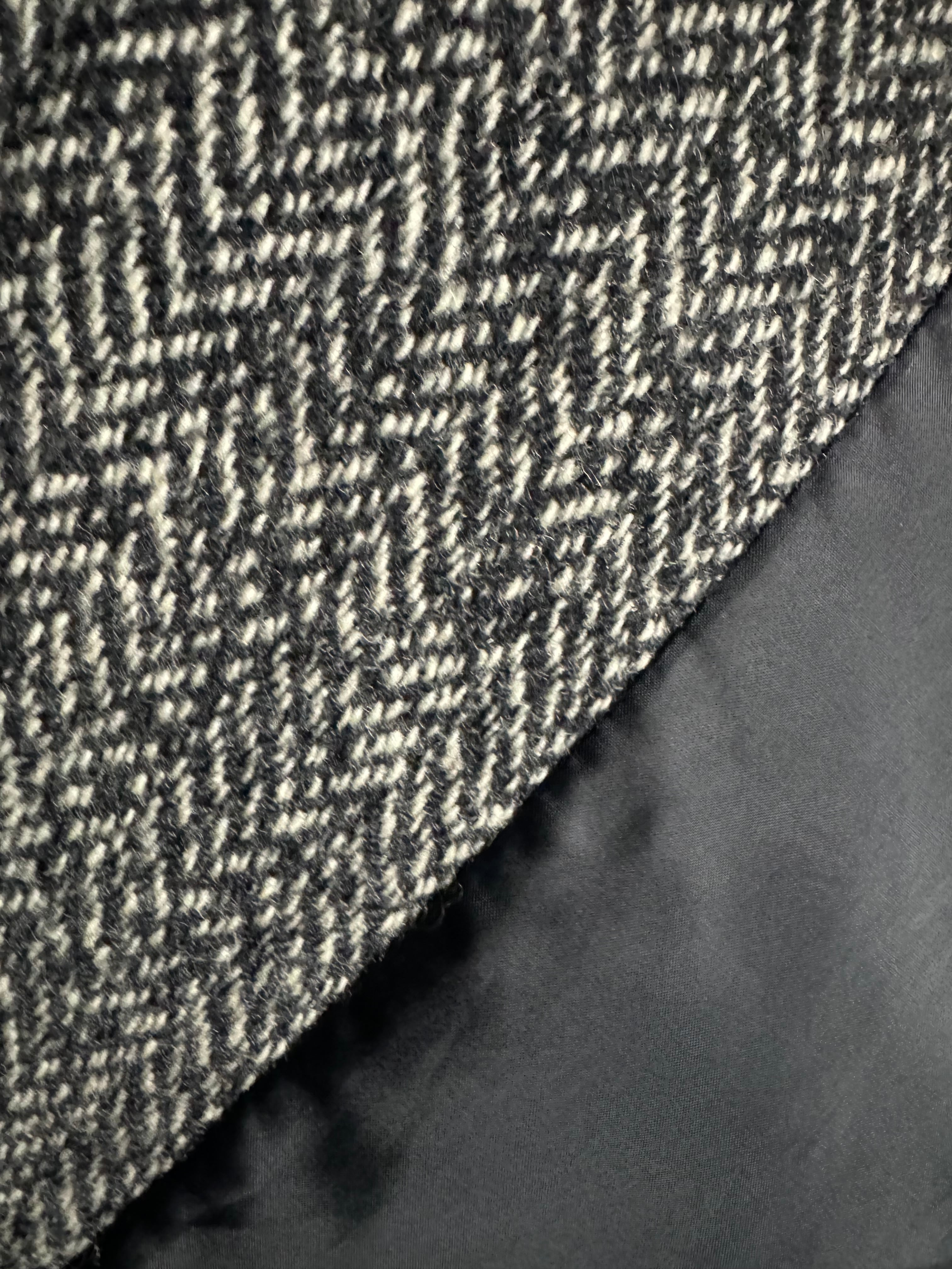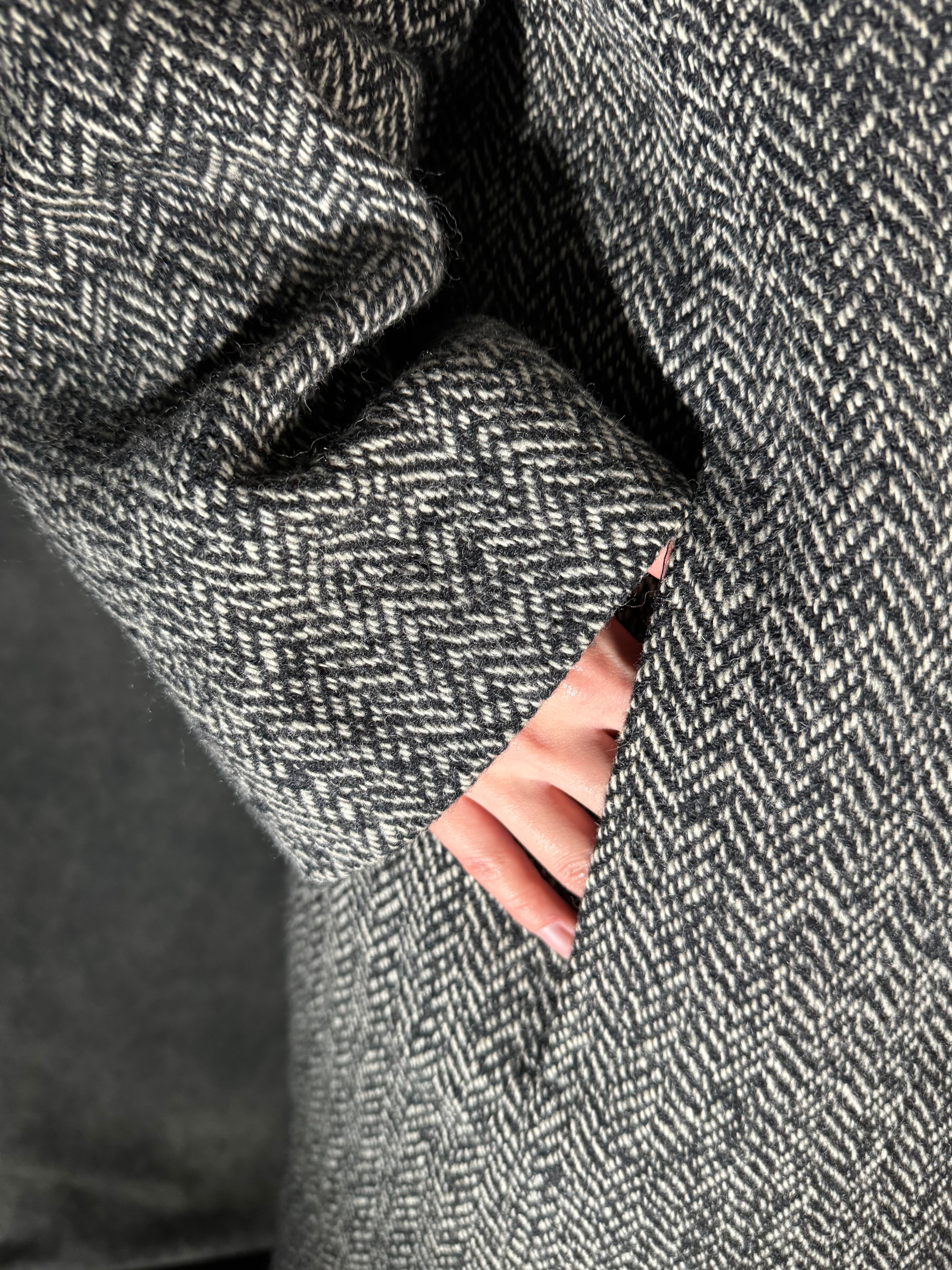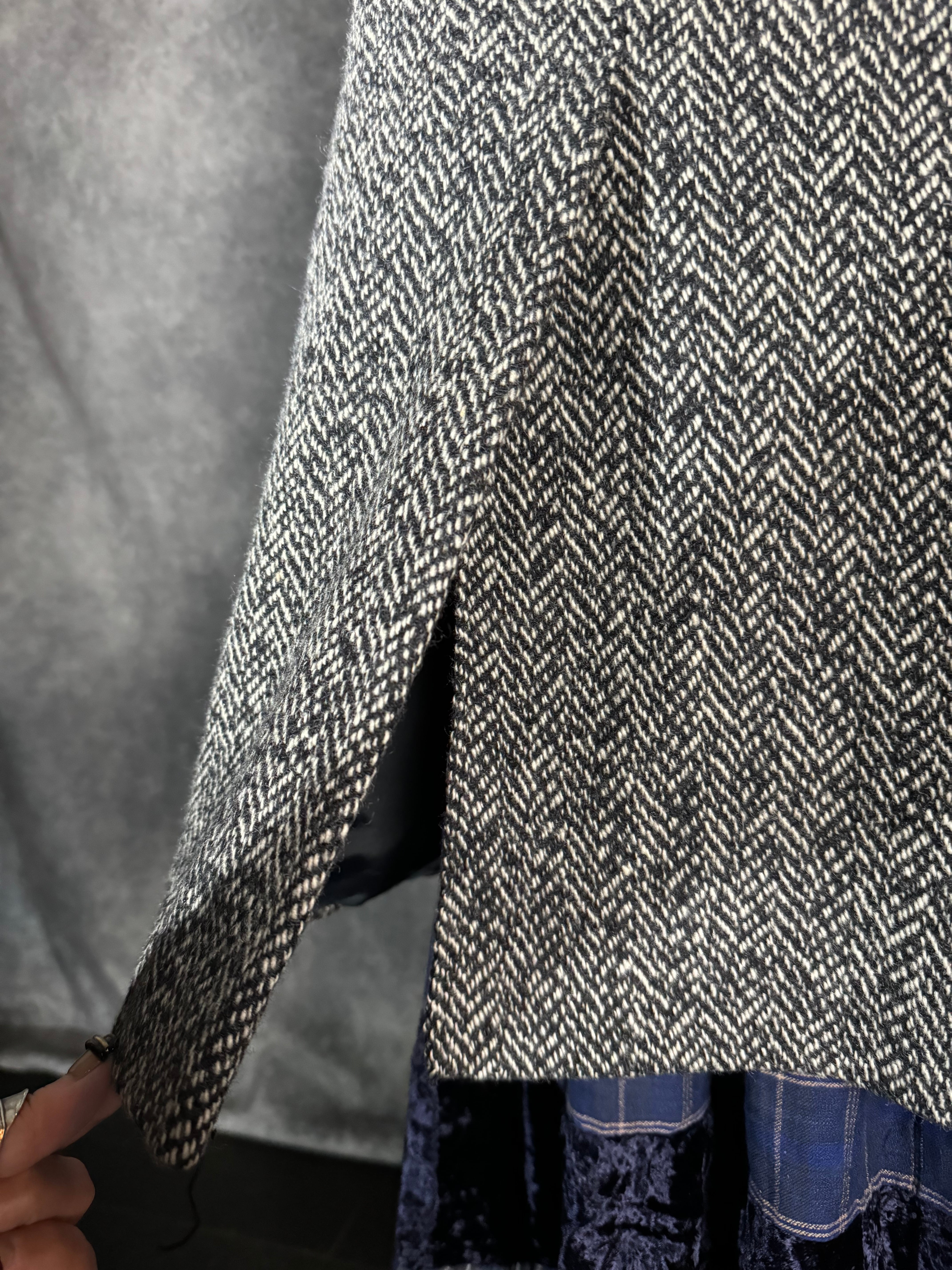 グレーのヘリンボーンに、ブラックファーがトリミングされた深いフード付きのウールコート。