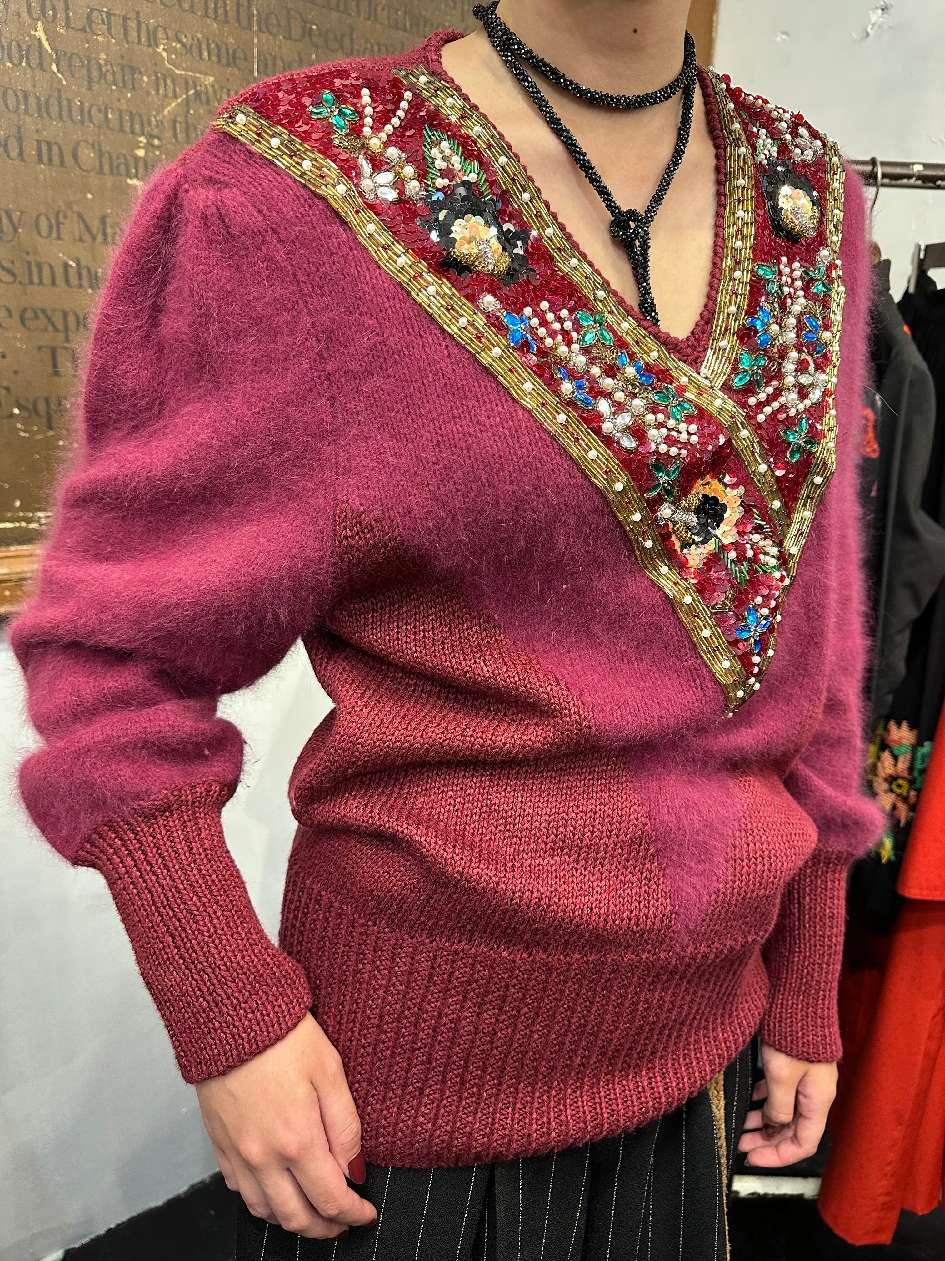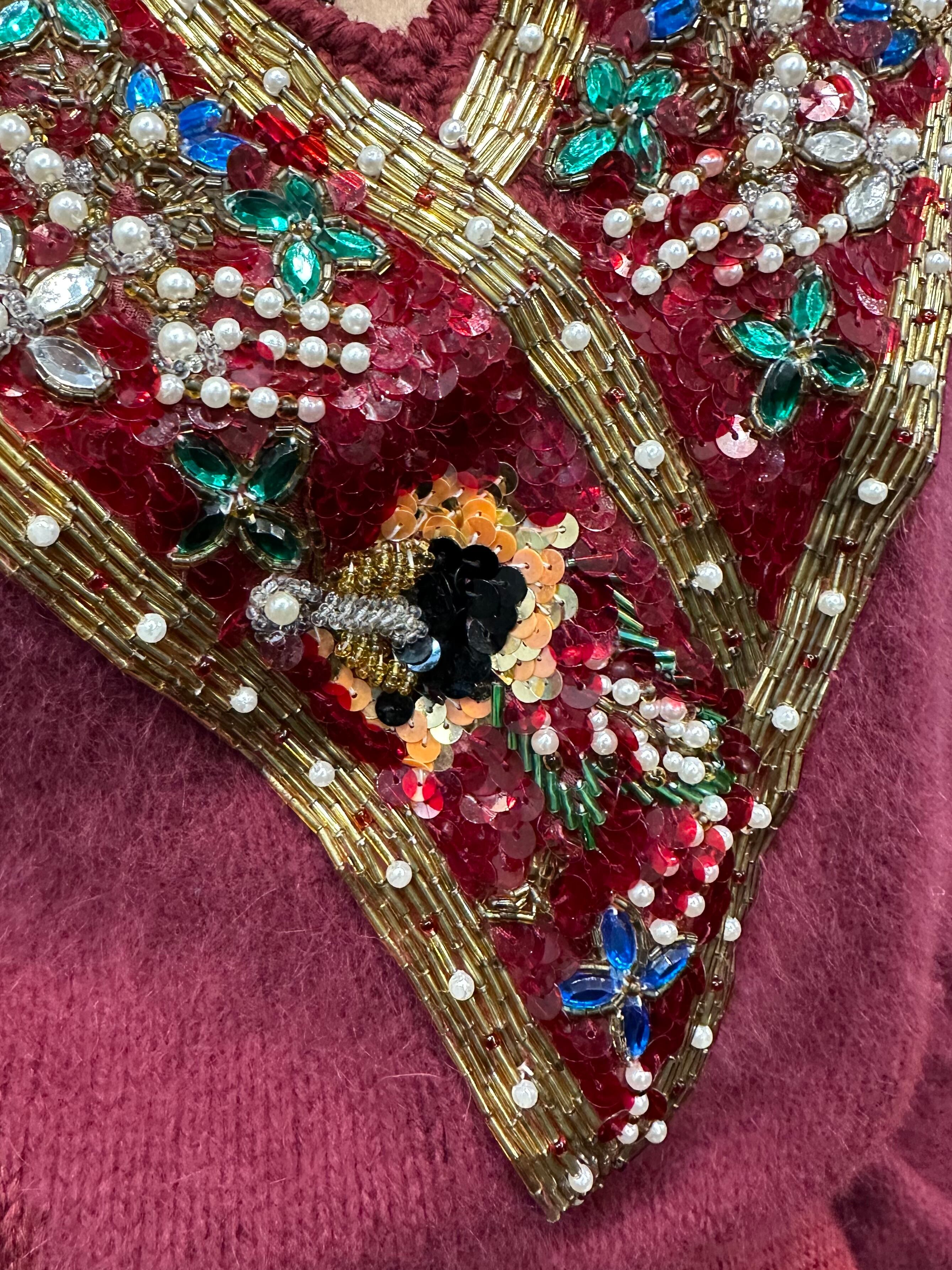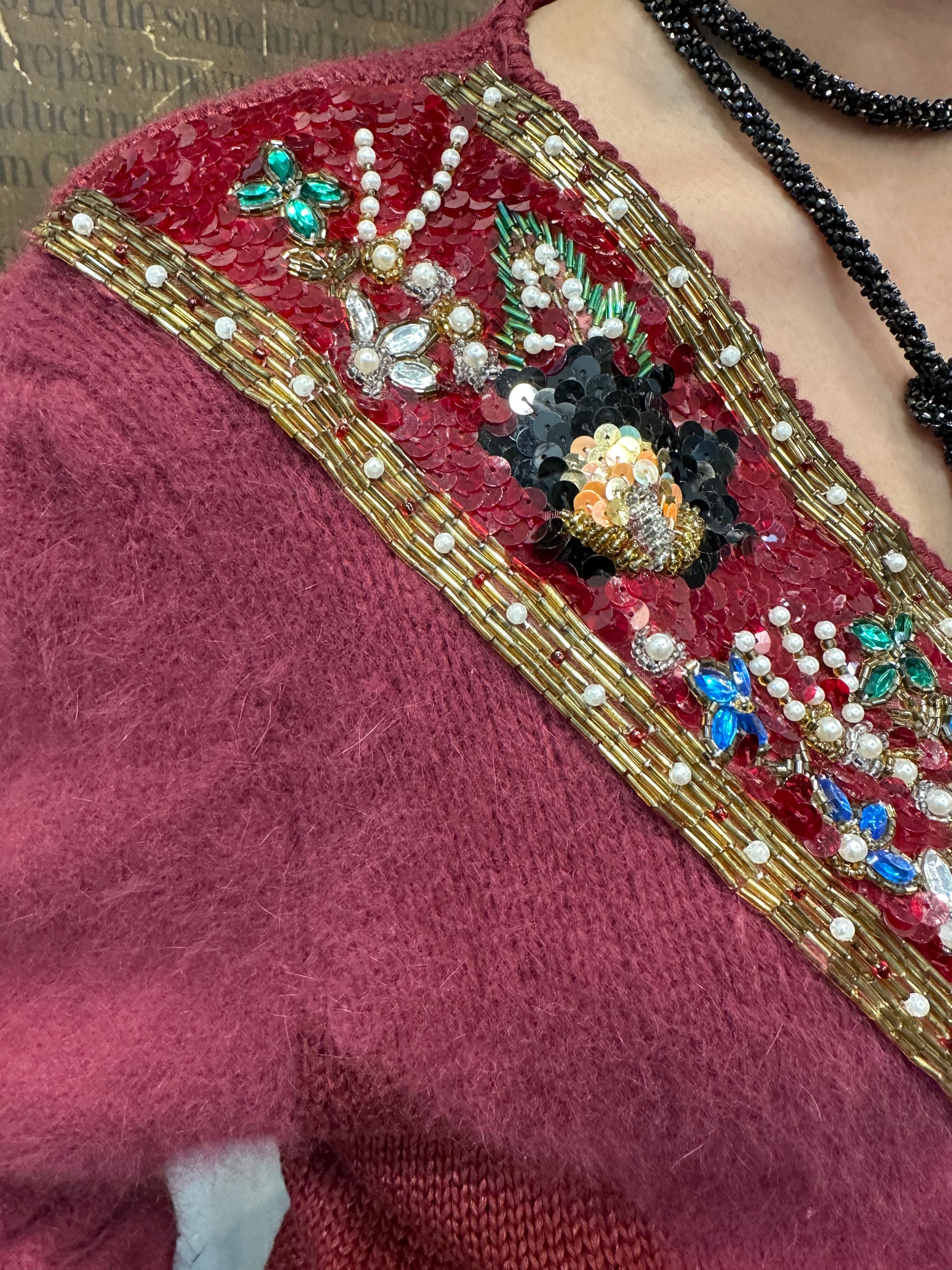 Vネックに合わせて幅広にあしらわれたビジューやスパンコールやパール。品の良い華やさと、エキゾチックな色合わせまでもがお洒落な一枚です。