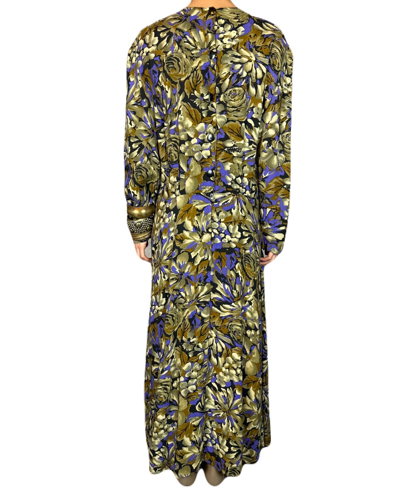 肌馴染みのよいニュートラルなカーキにパープルの差し色が美しく映える80’sフラワーワンピース。