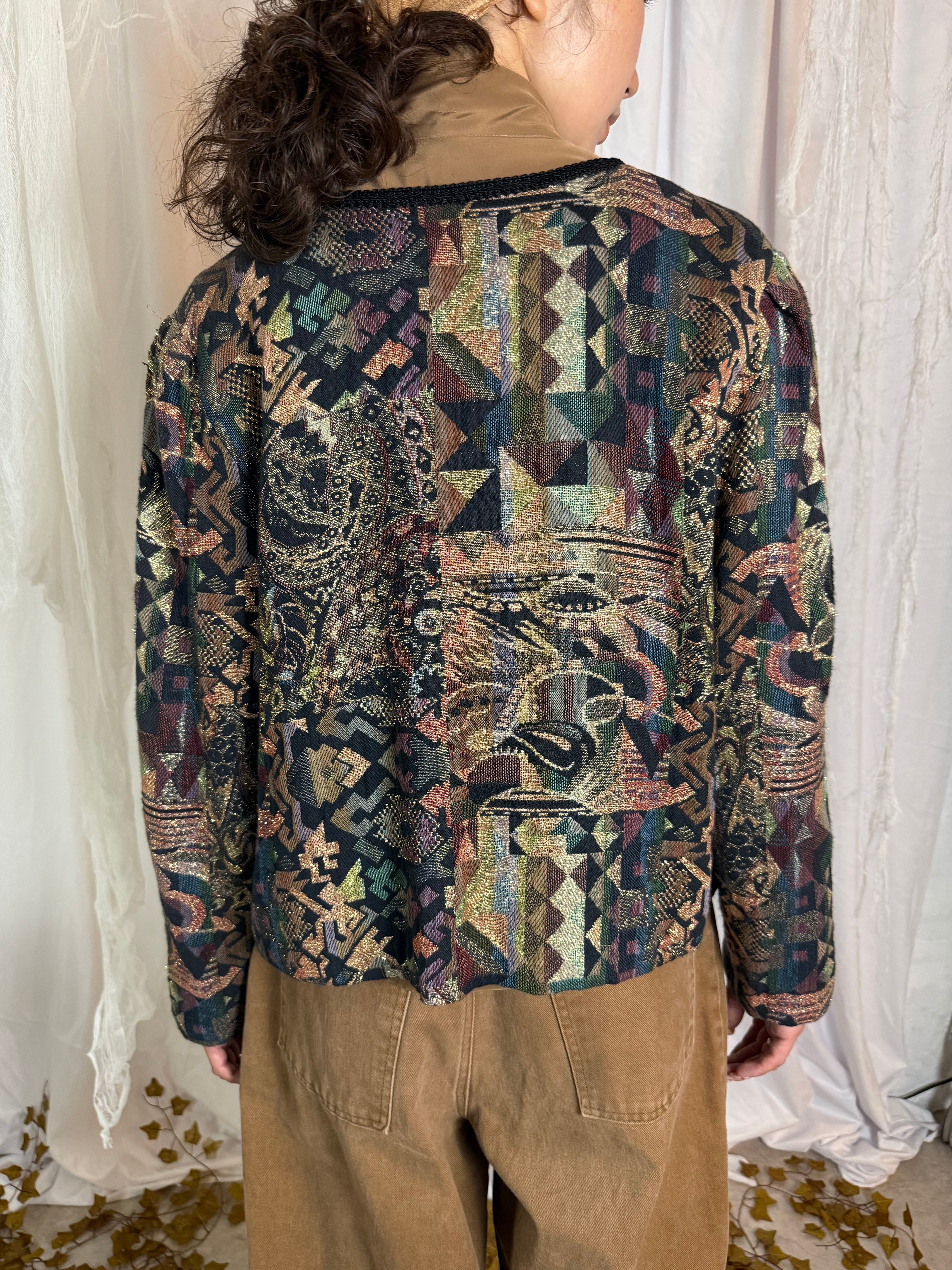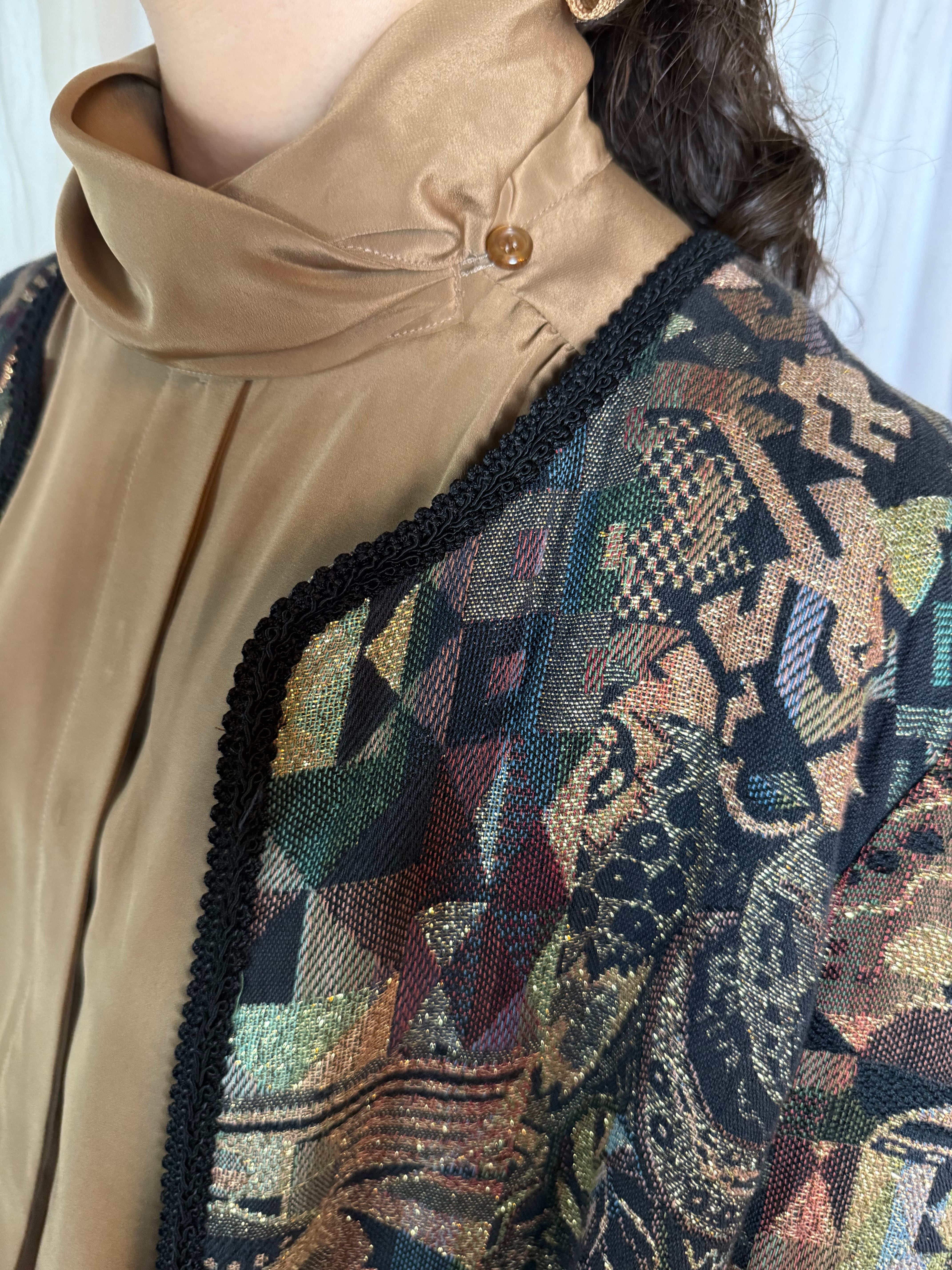 ジオメトリックとボタニカルがモザイクのようにミックスしたシンプルなオープンフロントジャケット。