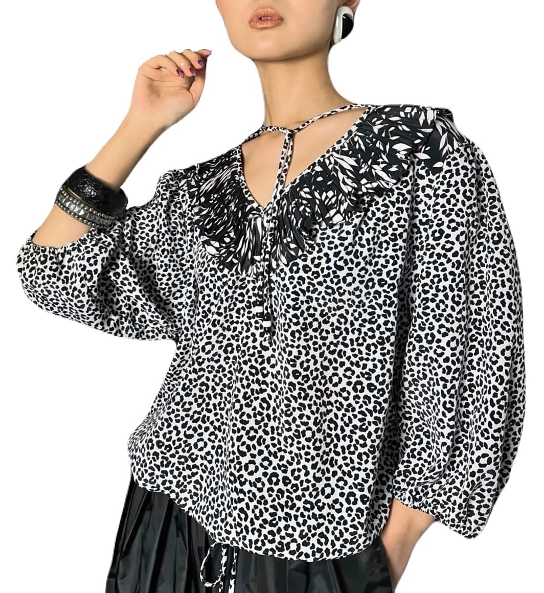 モノトーンでまとめられた、レオパードとボタニカルがミックスした Susan Freisのシックなプルオーバートップス。