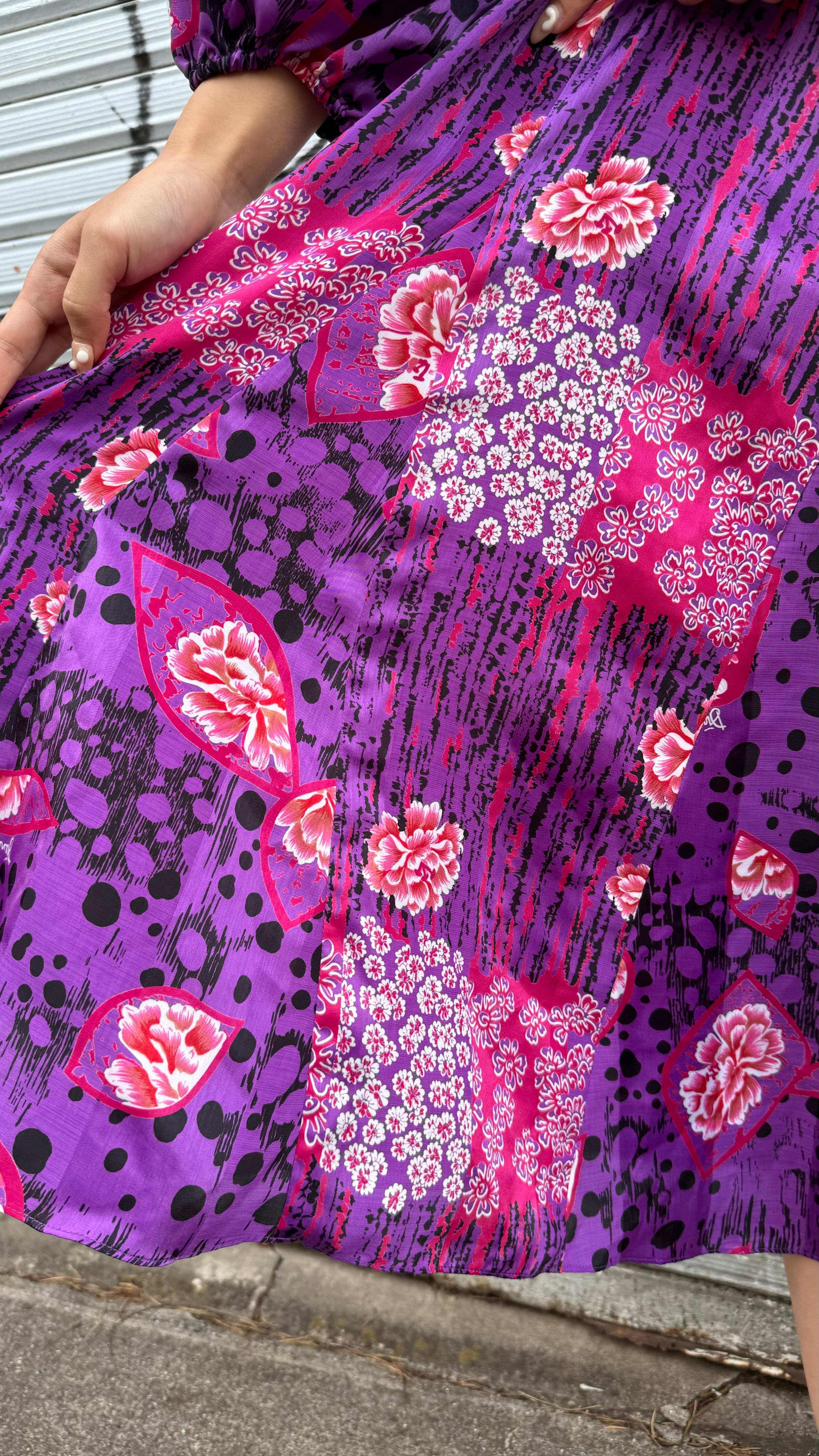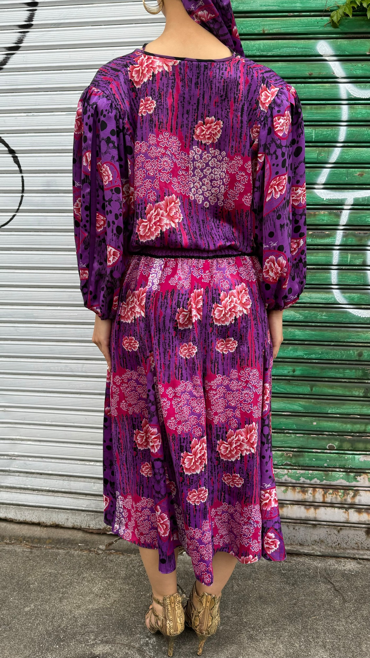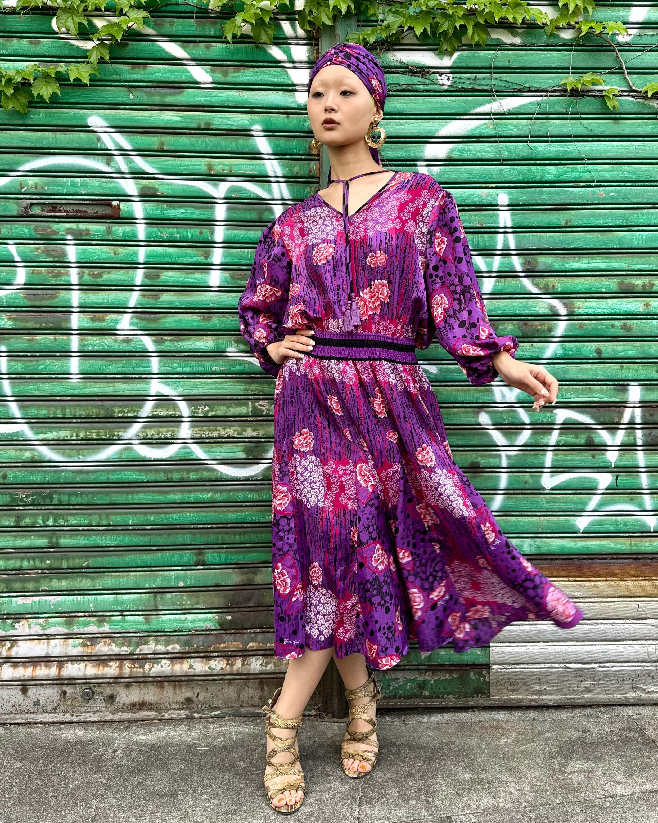ドラマティックなパープルベースのフラワープリントが美しい、Diane Freis のワンピース。
