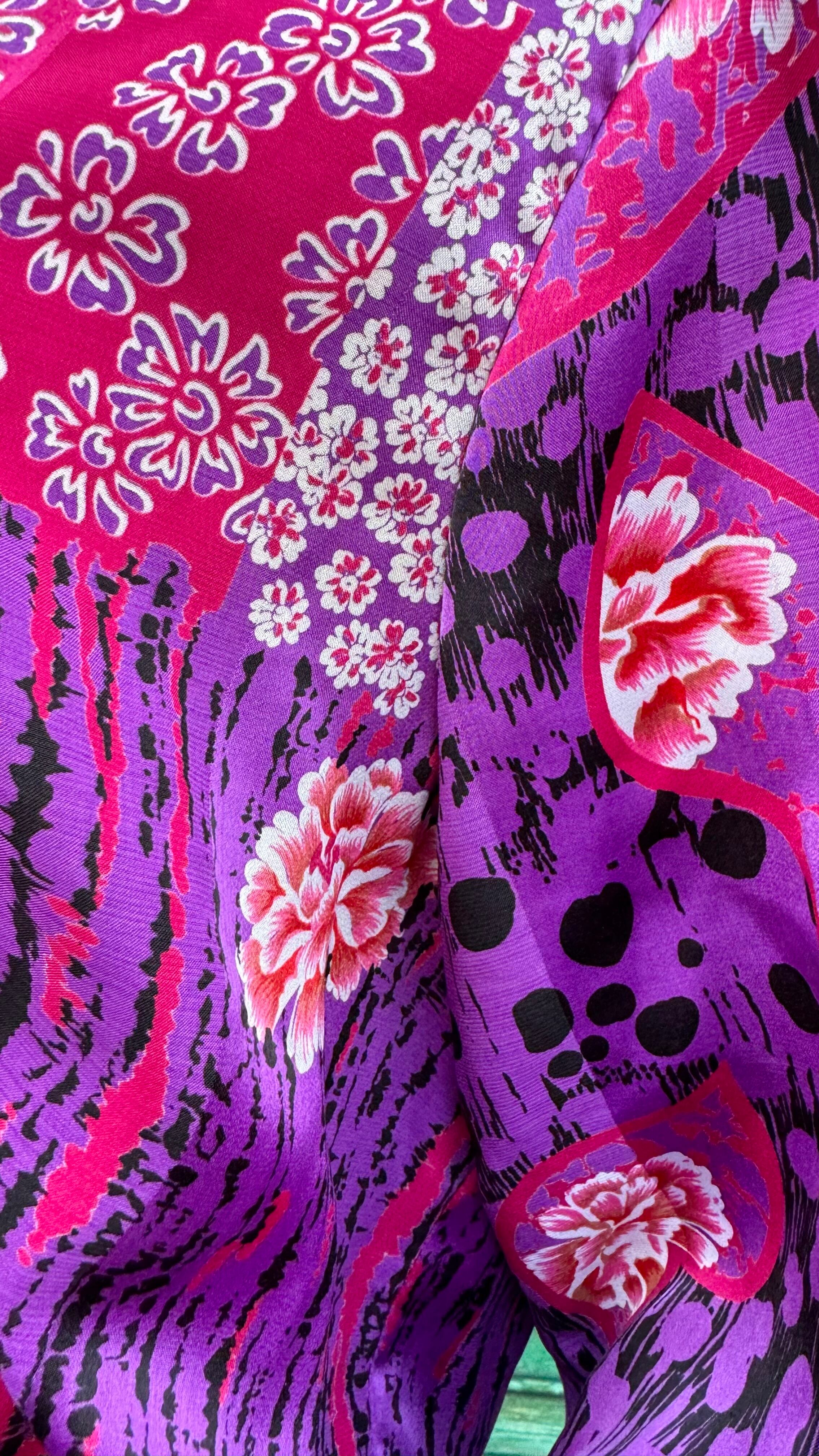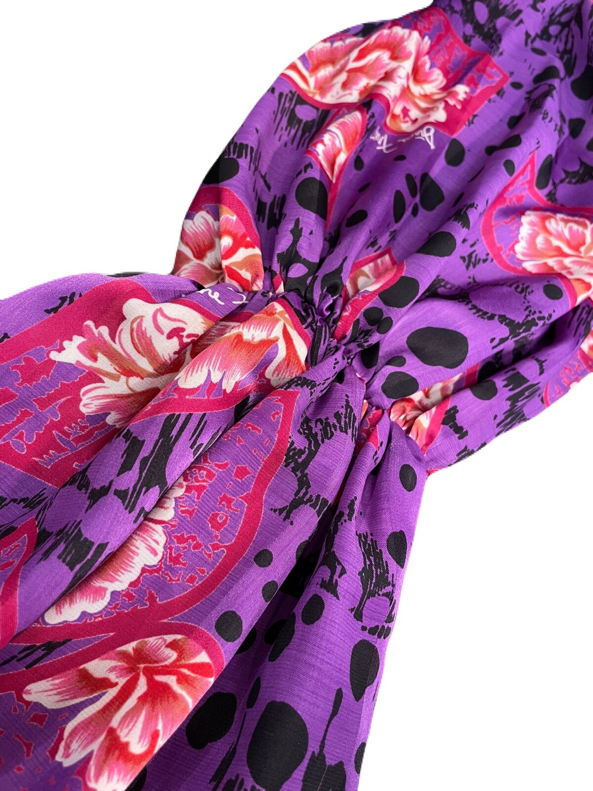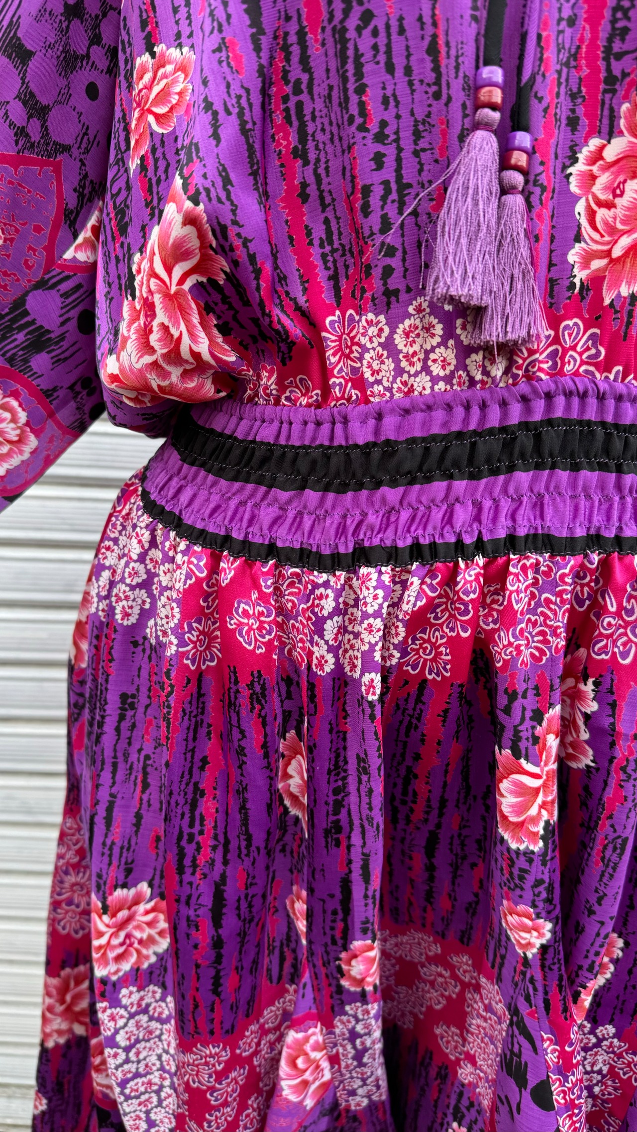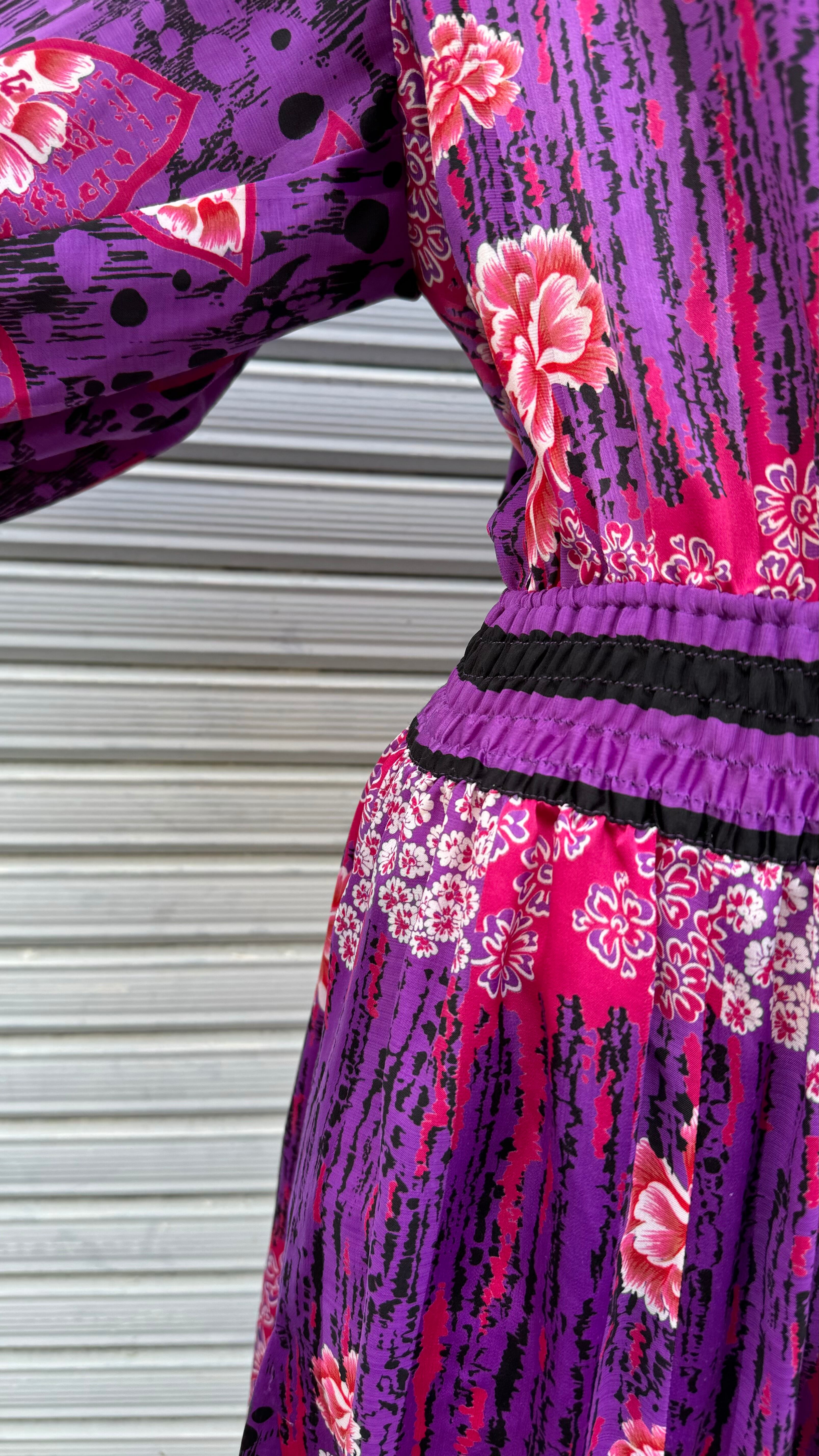 ドラマティックなパープルベースのフラワープリントが美しい、Diane Freis のワンピース。