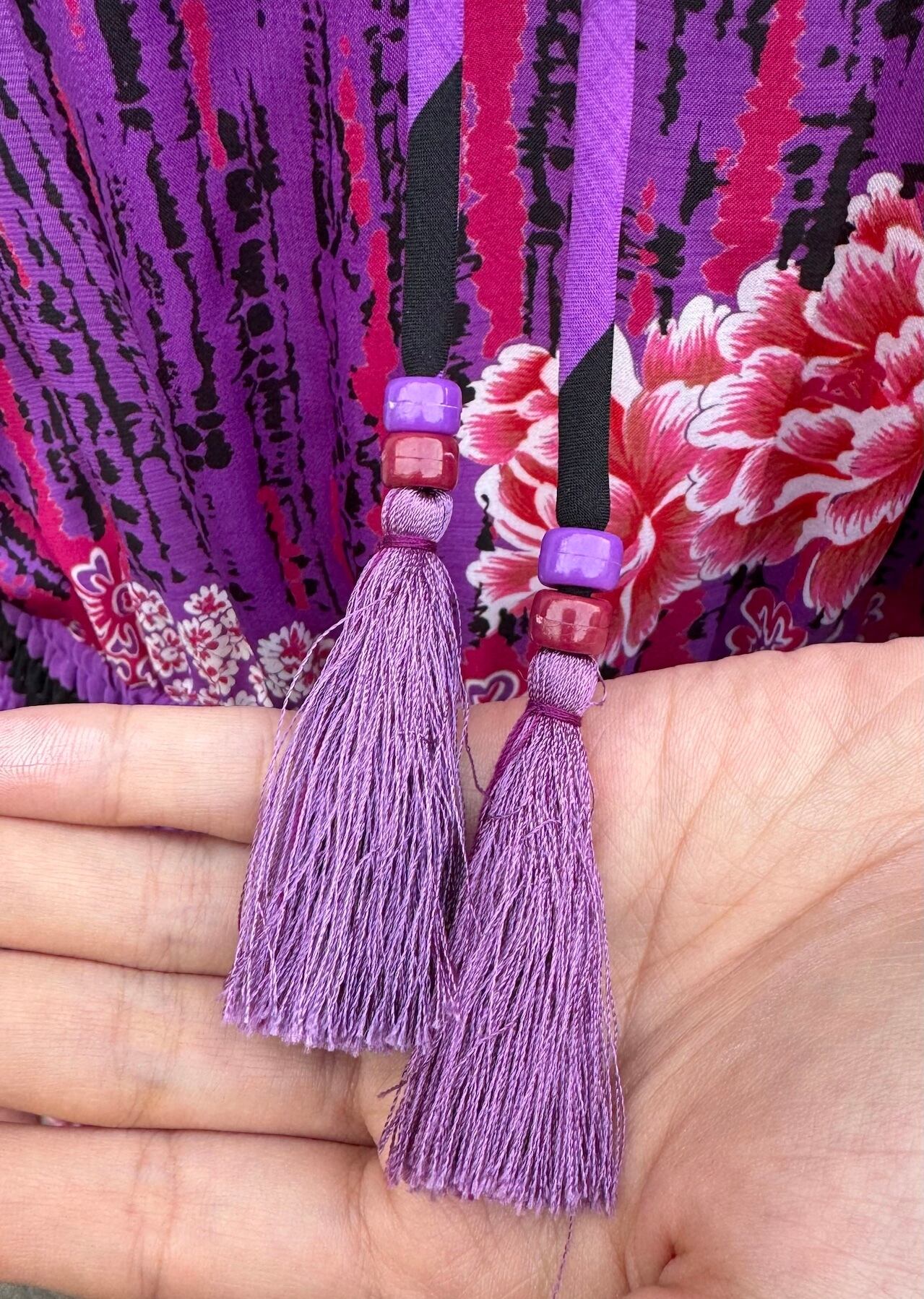 ふんわりとしたスリーブ、裾に向かって広がる動きの綺麗なボトム、シグニチャーのタッセルと、Diane Freis らしいシルエットです。