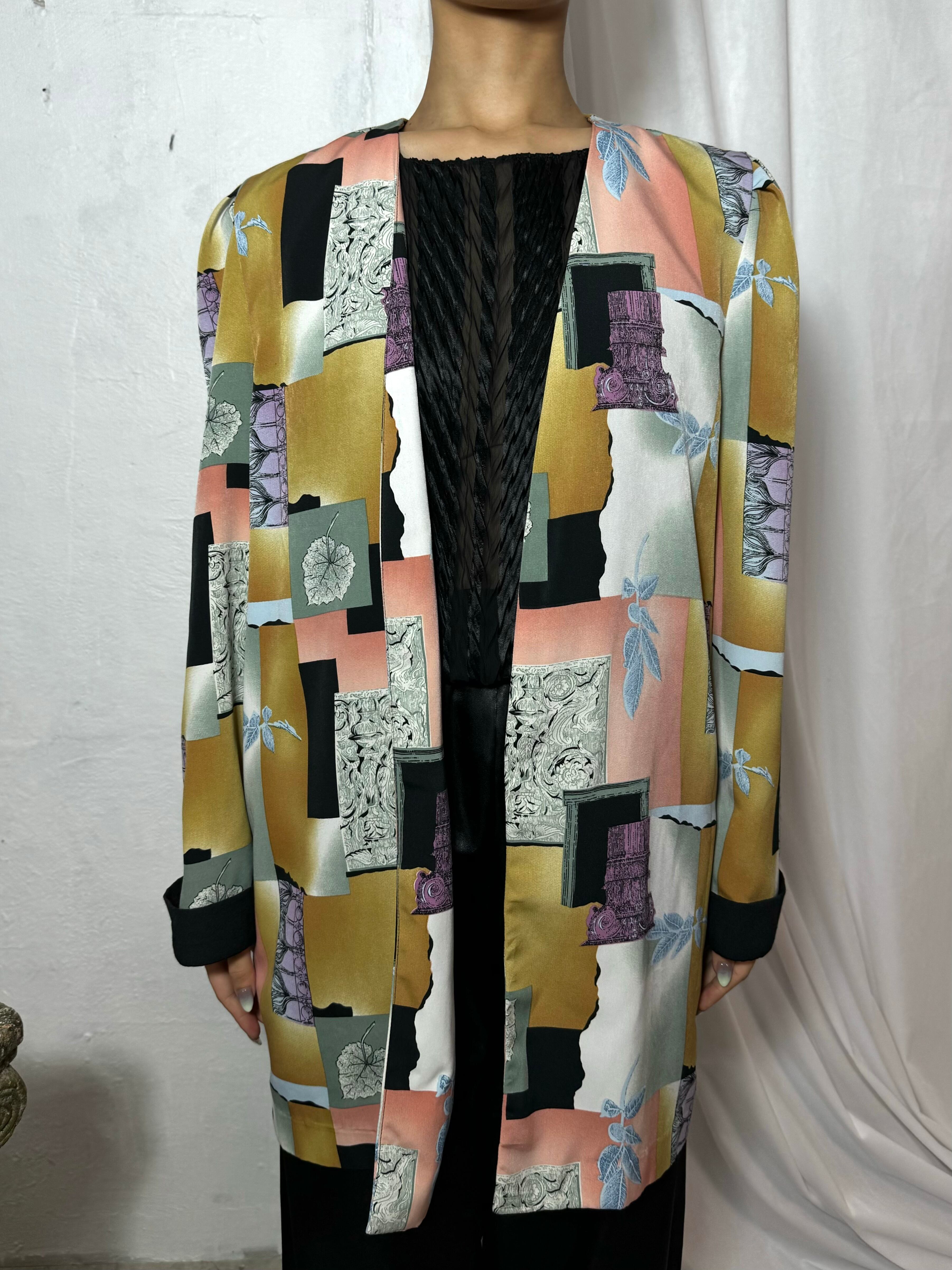 リーフや古い建築をモチーフにした、アーティスティックなプリントがクールなノーカラージャケット。