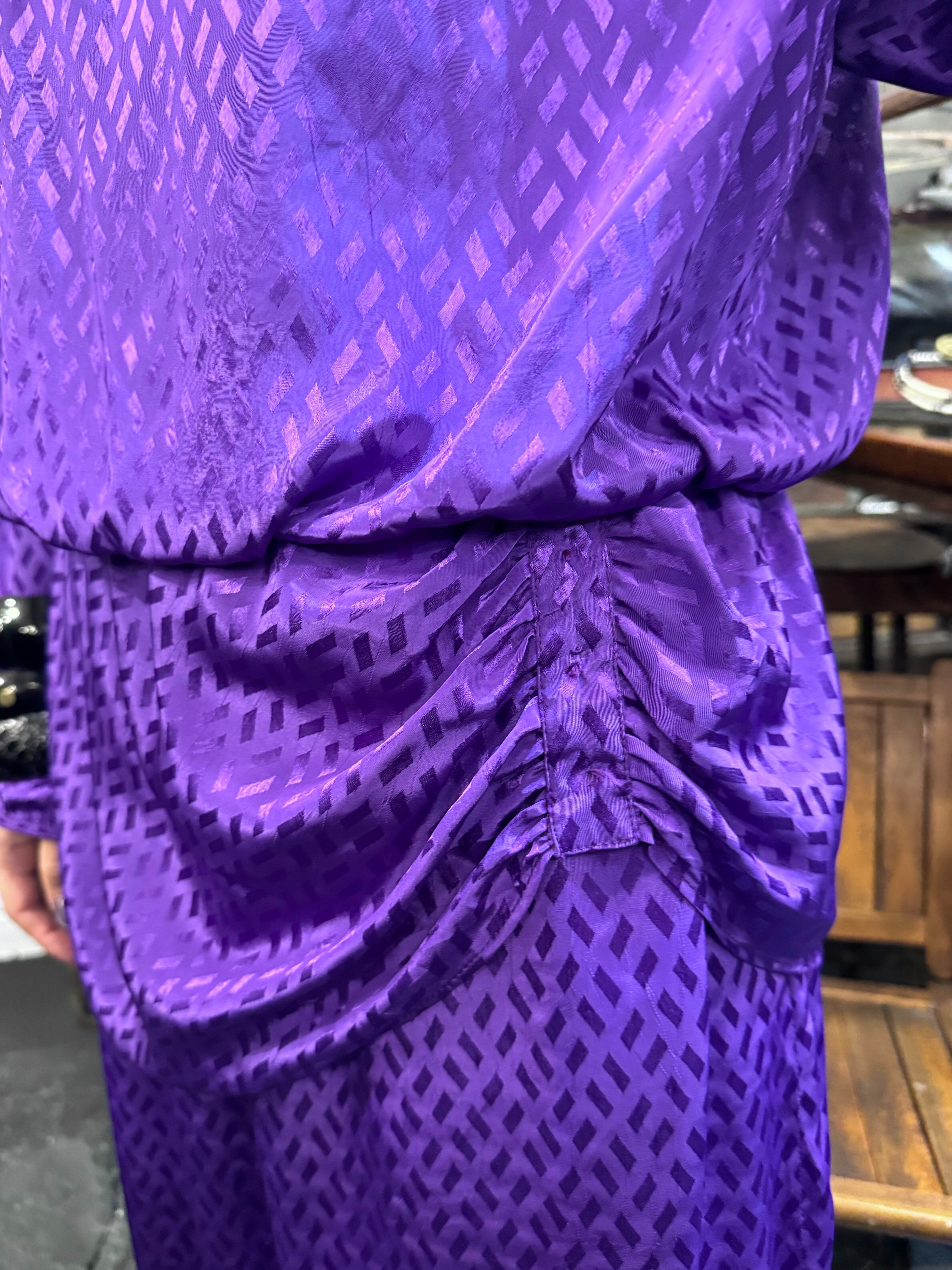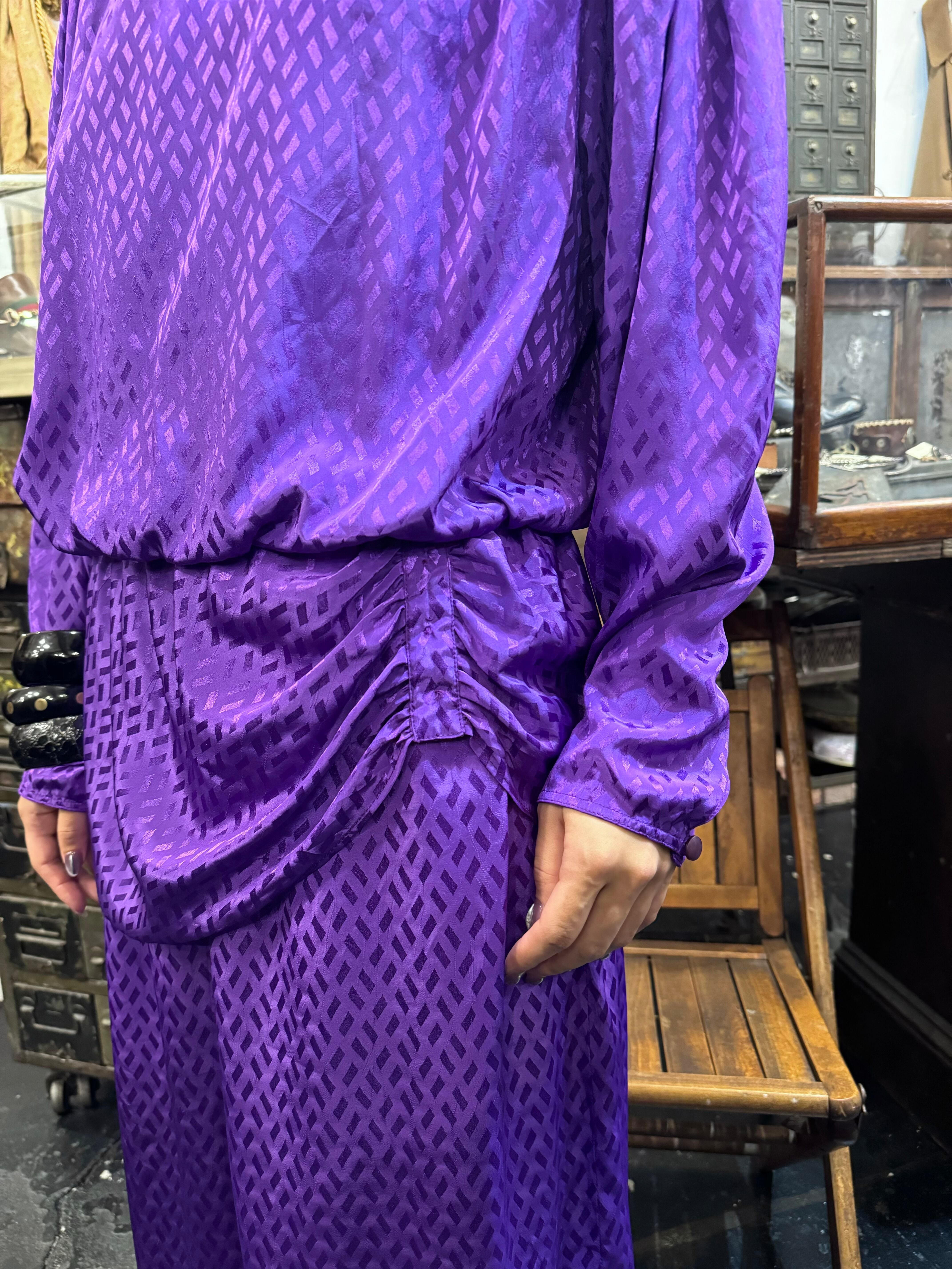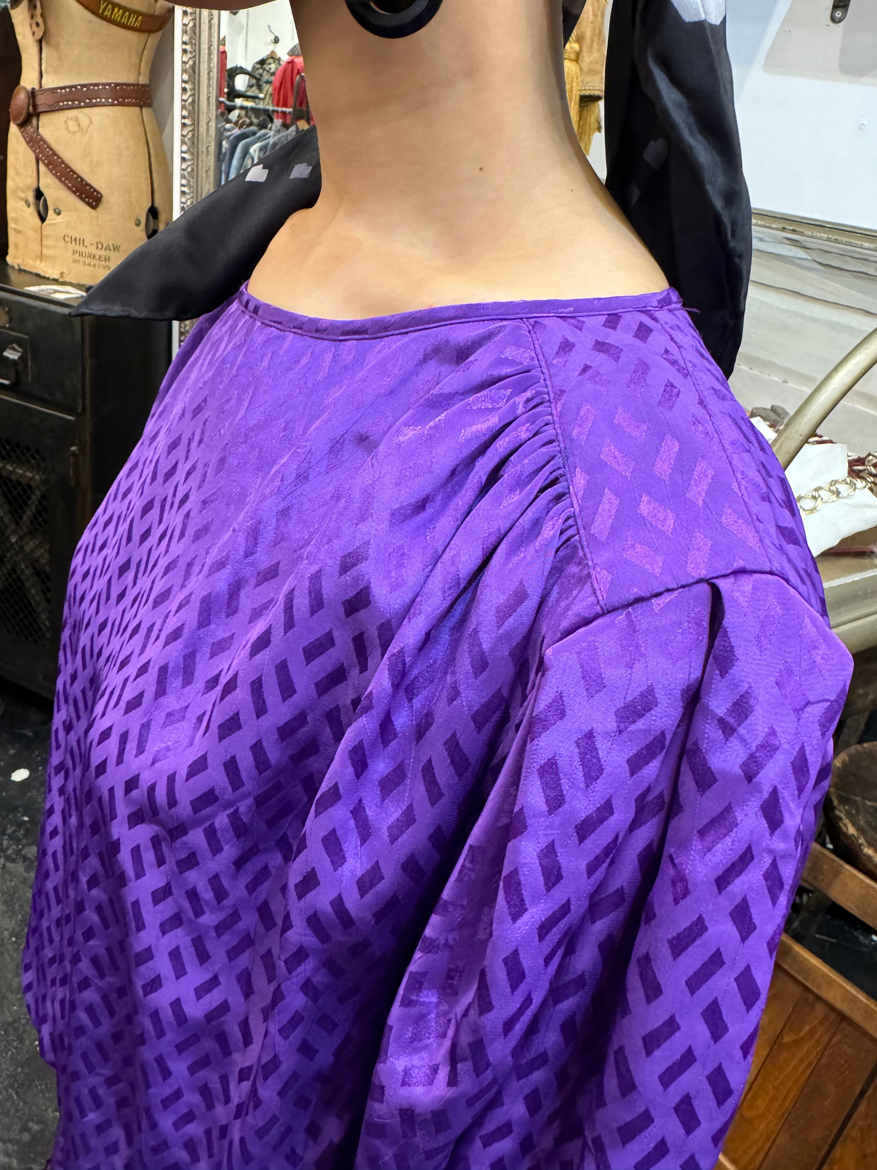 二枚の生地を利用して作られたドレープウエストと、肩周りのギャザーがとてもエレガントでヴィンテージらしいデザイン。艶やかなパープルのカラーリングが美しい印影をつくり、レトロな雰囲気を盛り上げてくれます。
