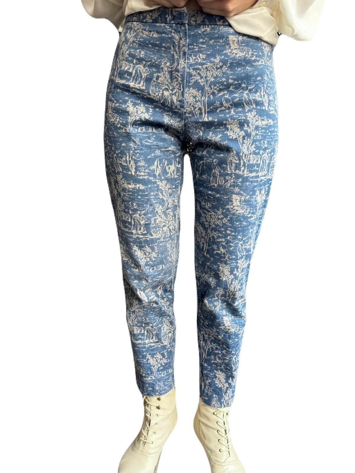 グレイッシュブルーのストレッチデニムにトワル・ド・ジュイの繊細なプリントが浮かび上がる90’sパンツ。