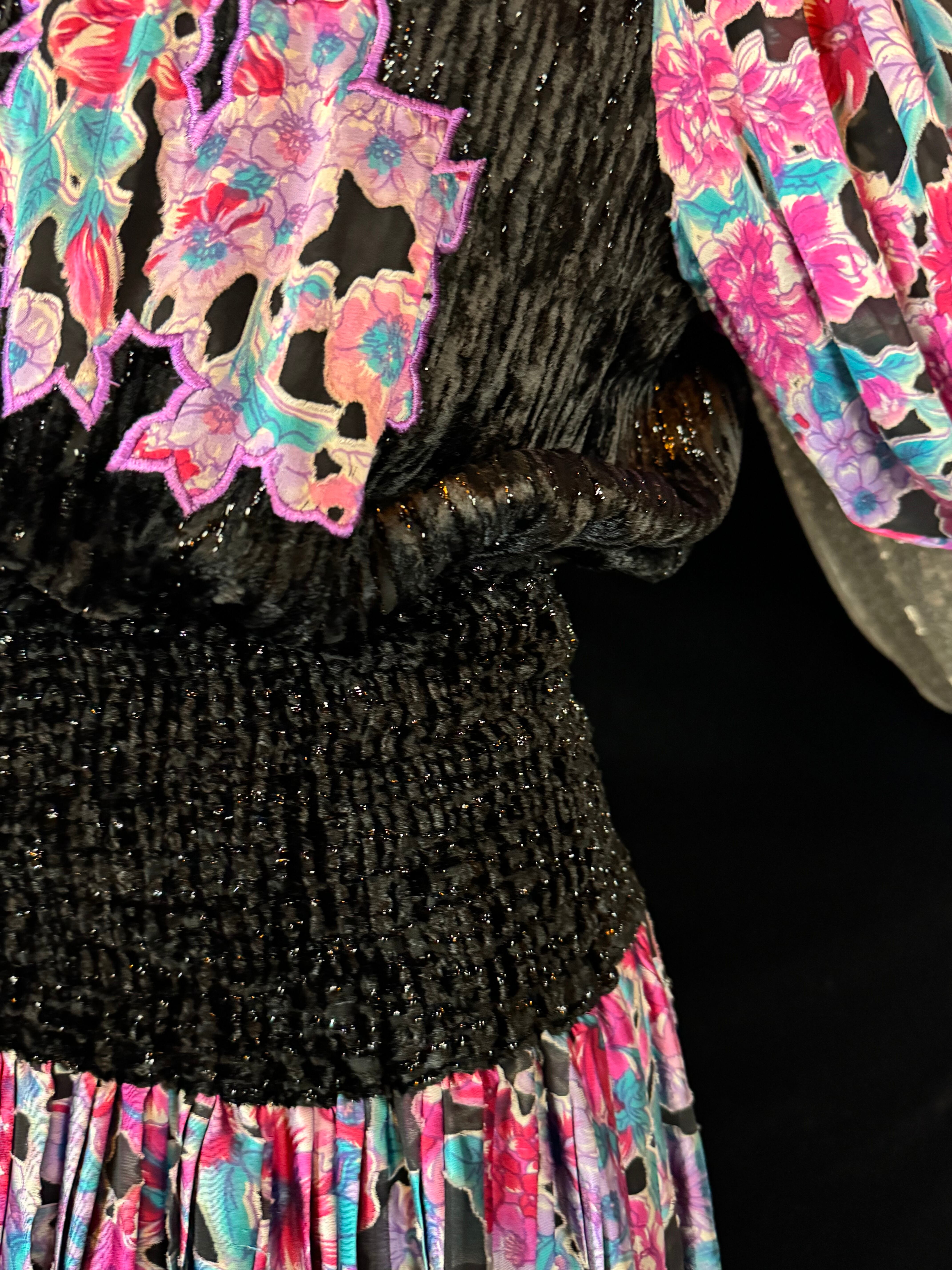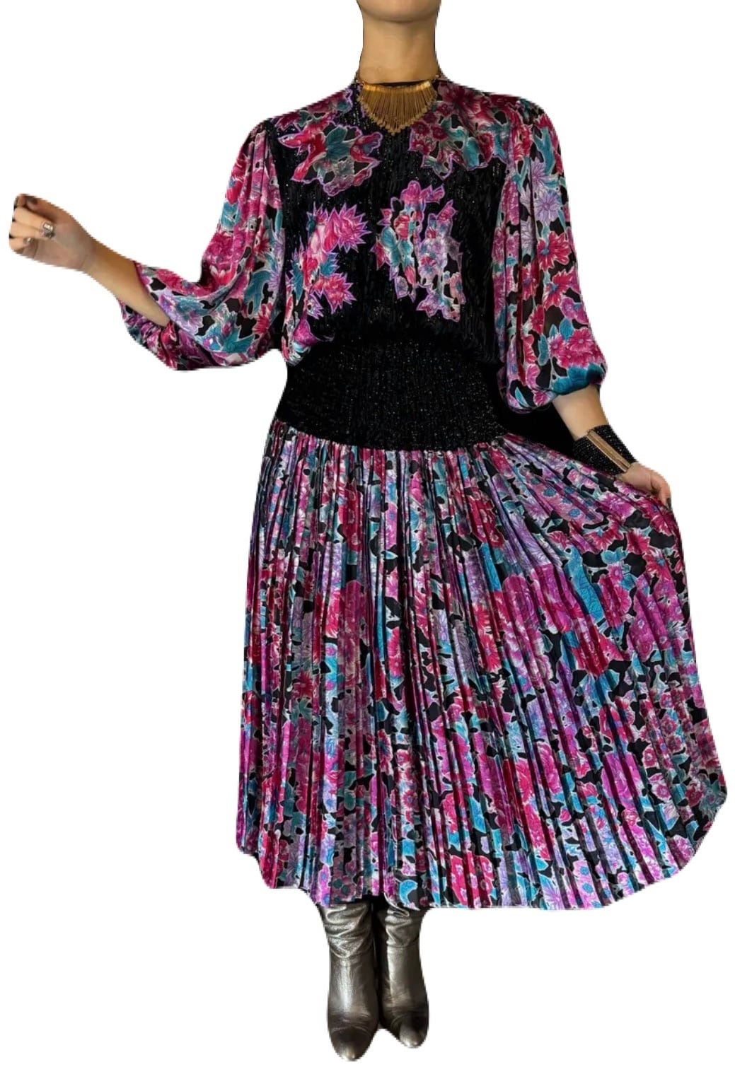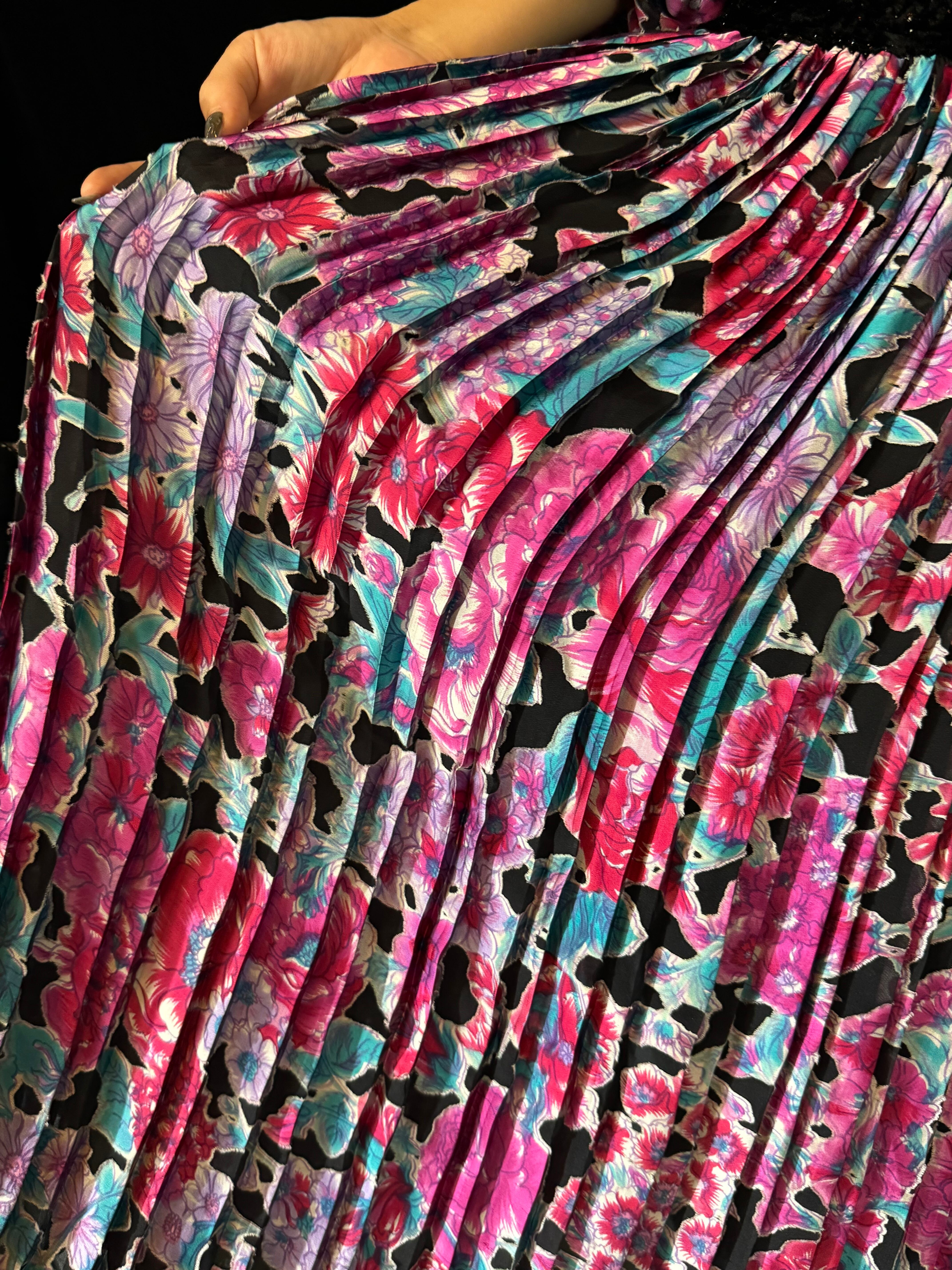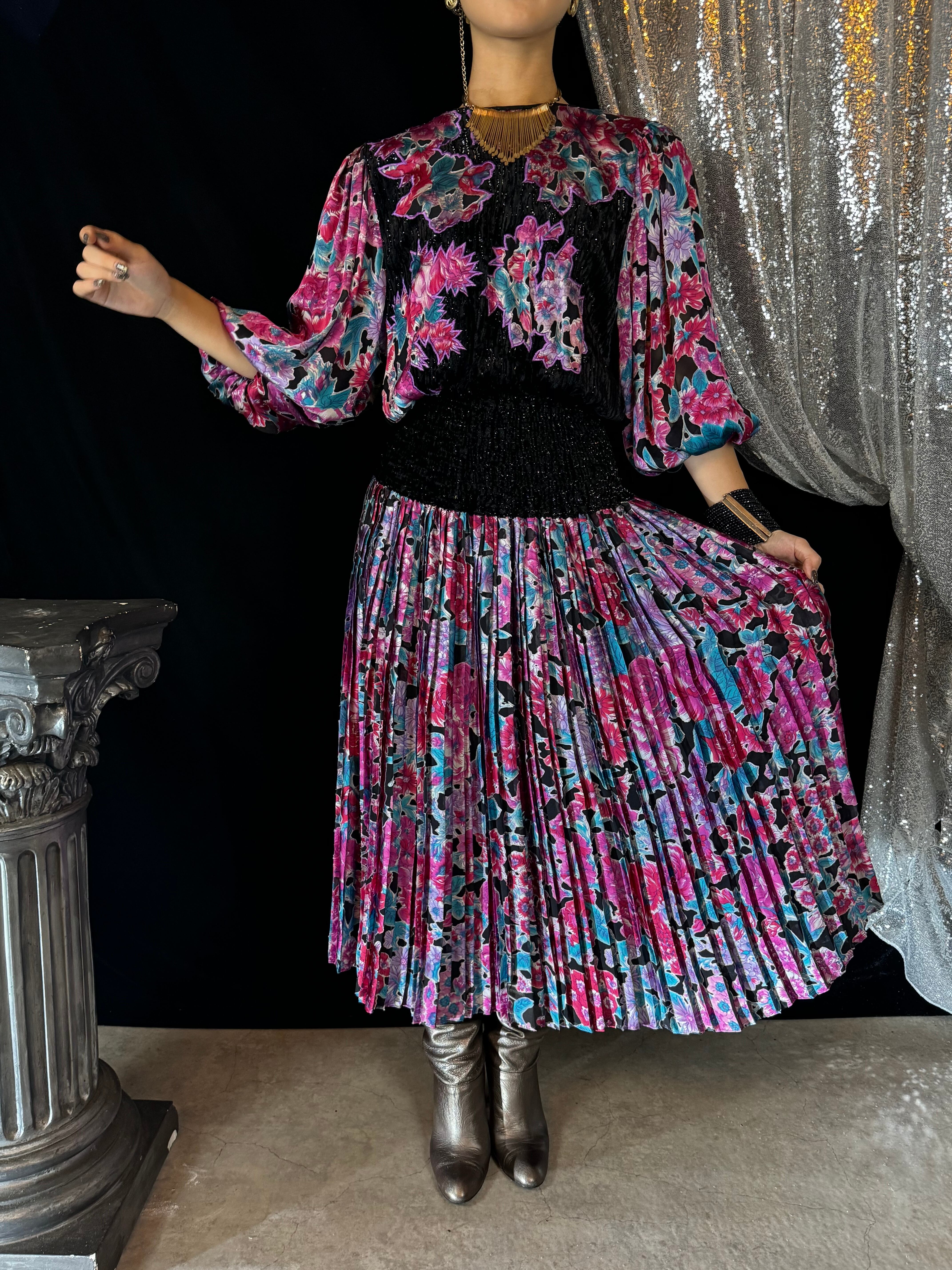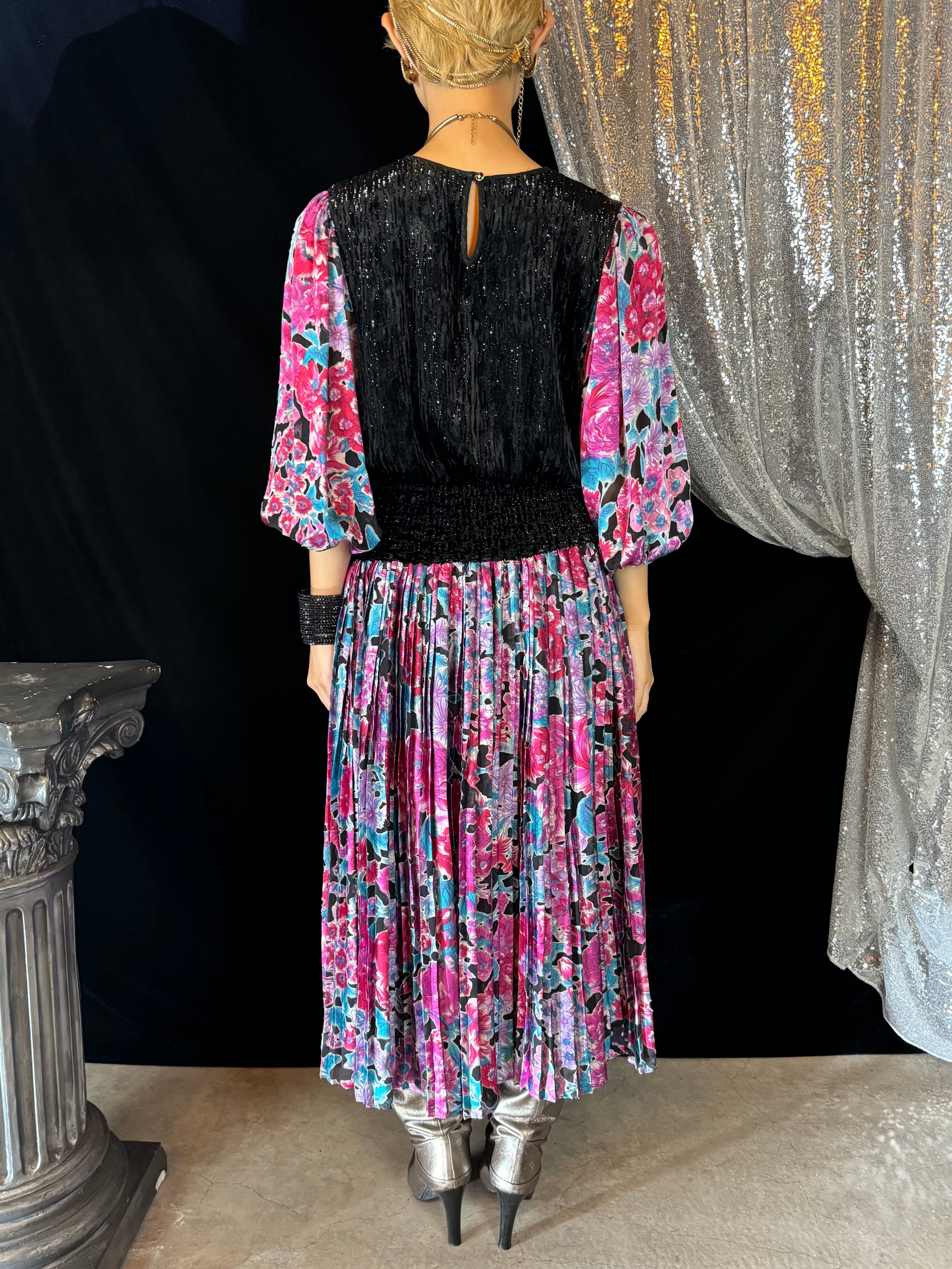 たっぷりと美しいデザインプリーツや、煌めくベロアなど…ライトや動きで、より華やかに、より魅力が増す一枚です。