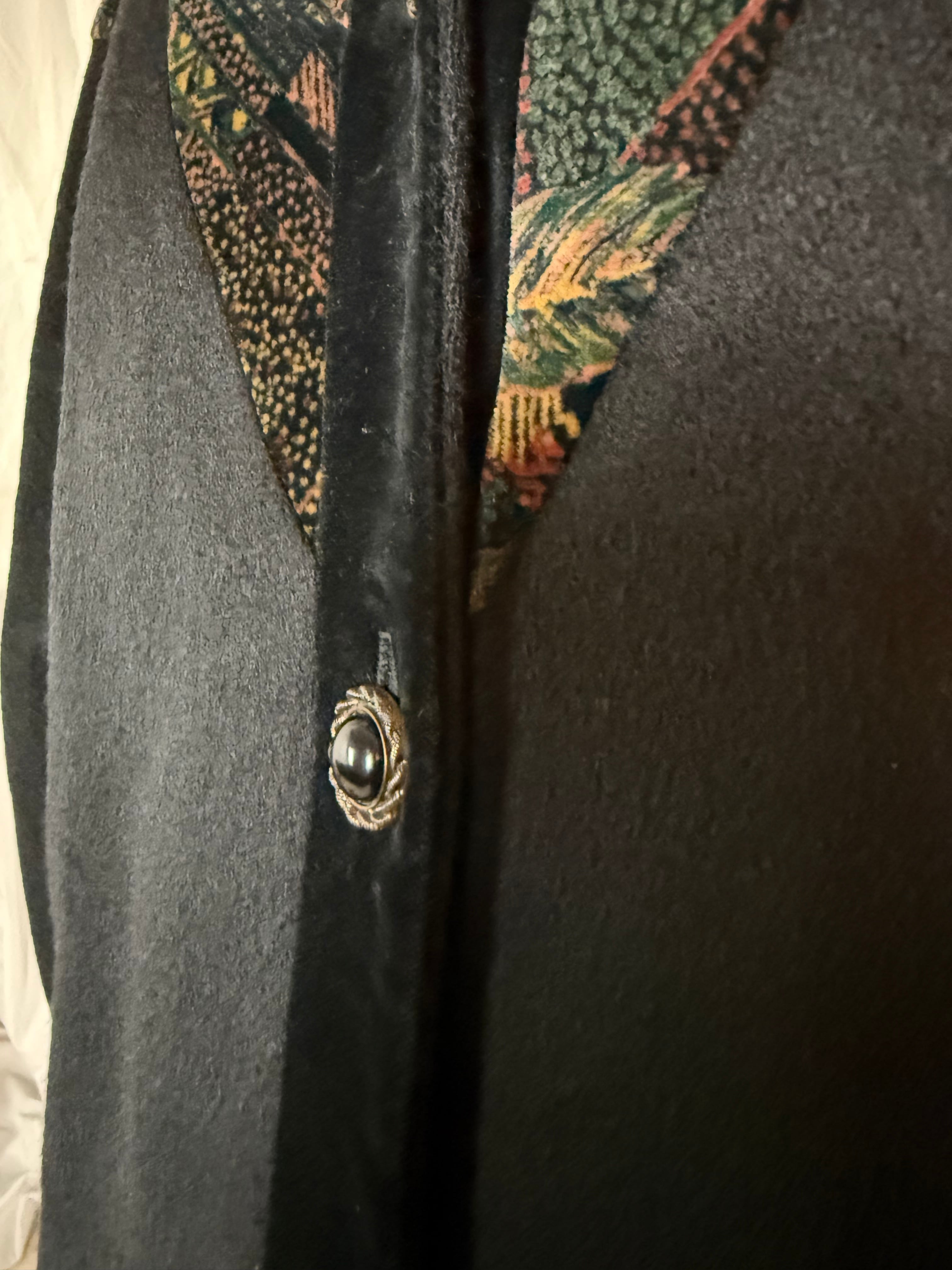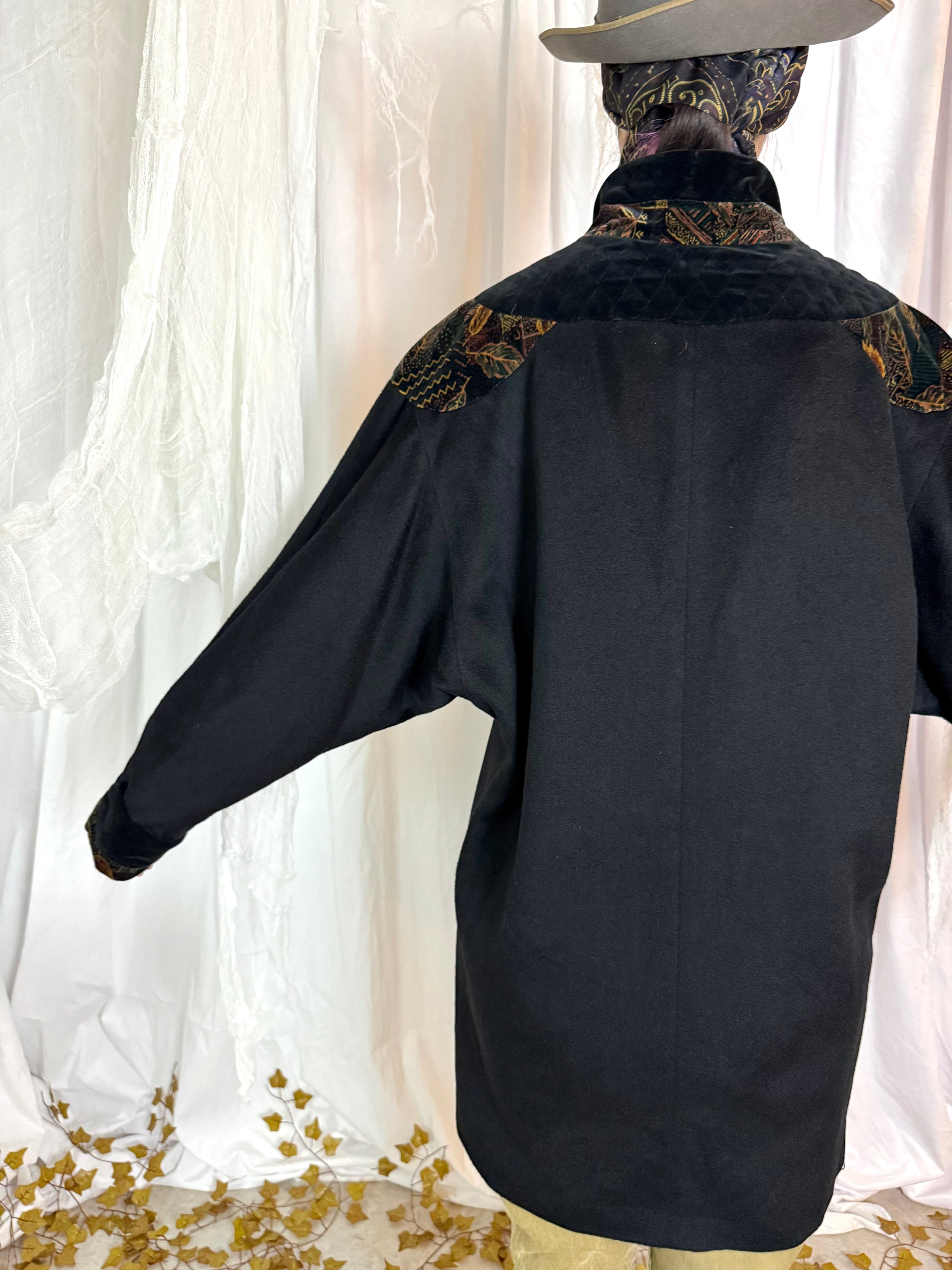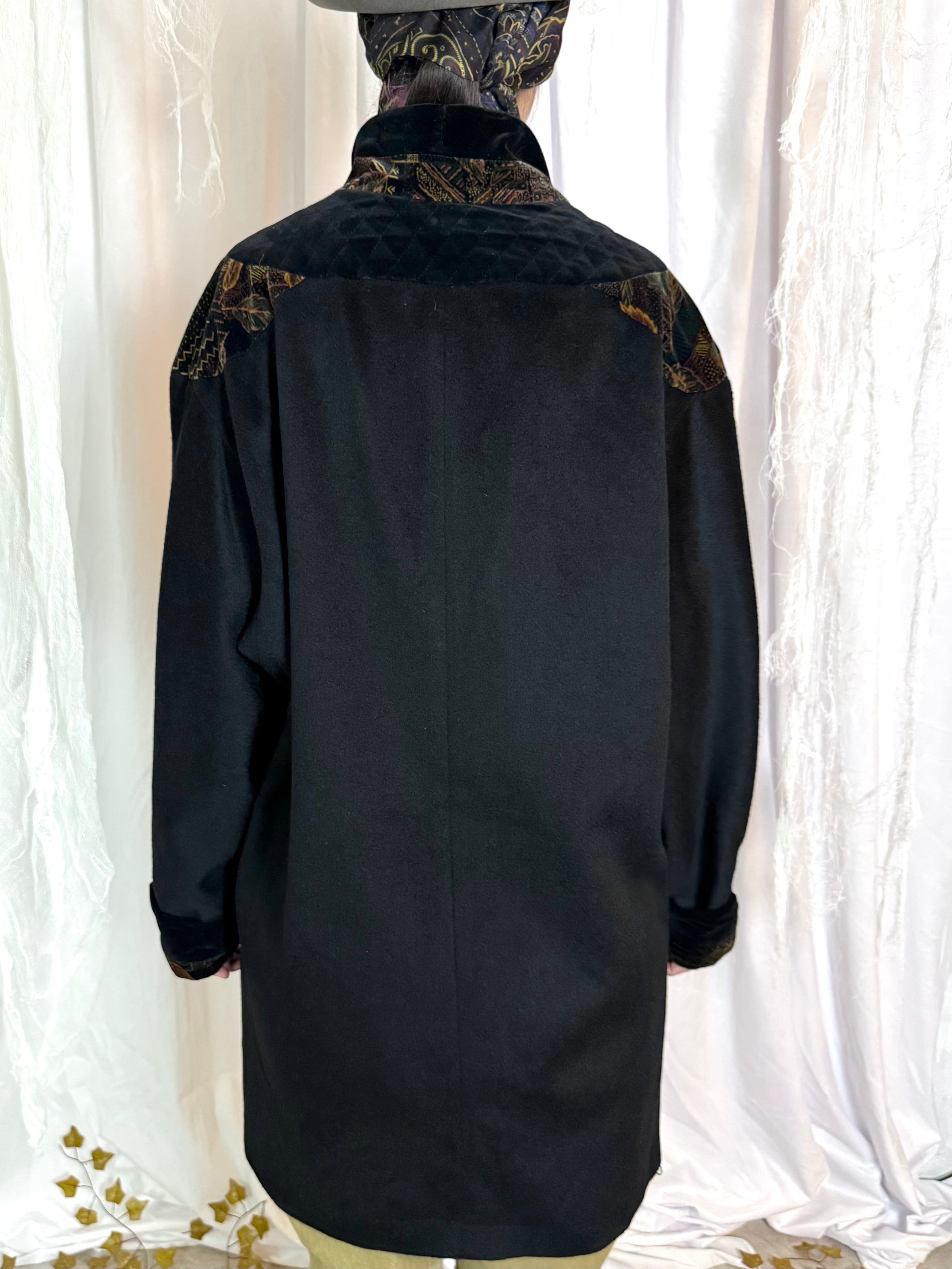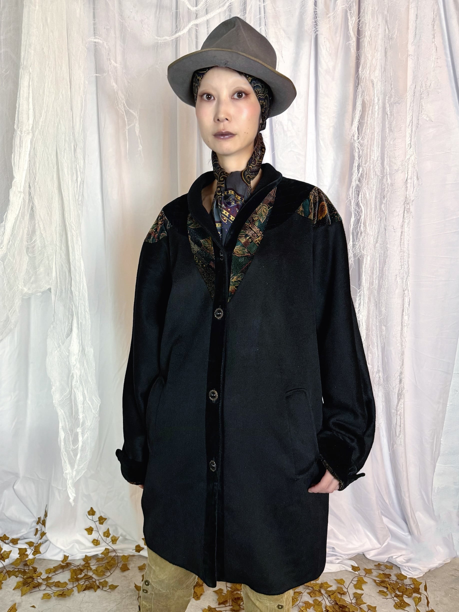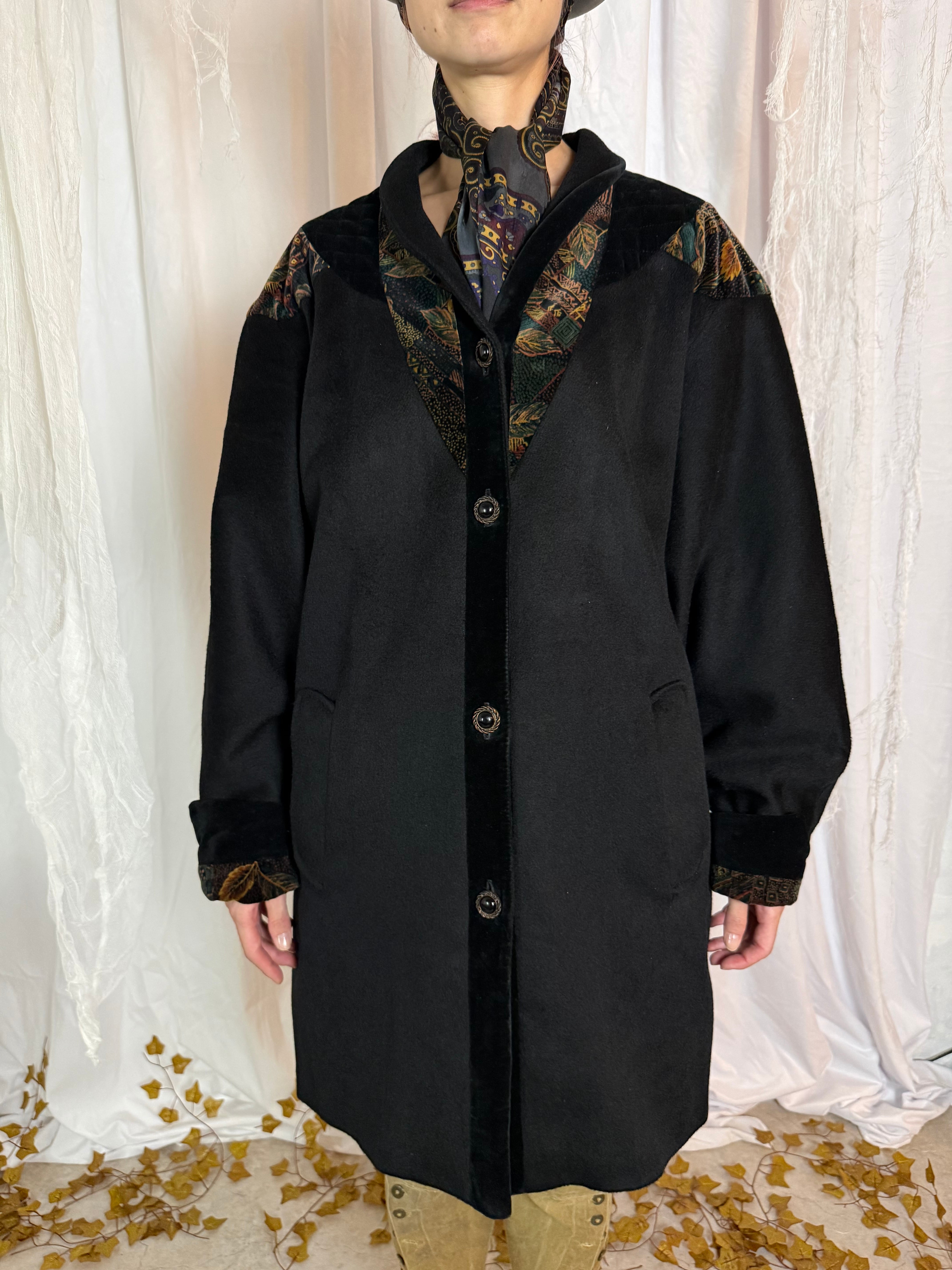首周りから肩、カフスに上品な柄の漆黒ベロアがデザインされたミドルコート。