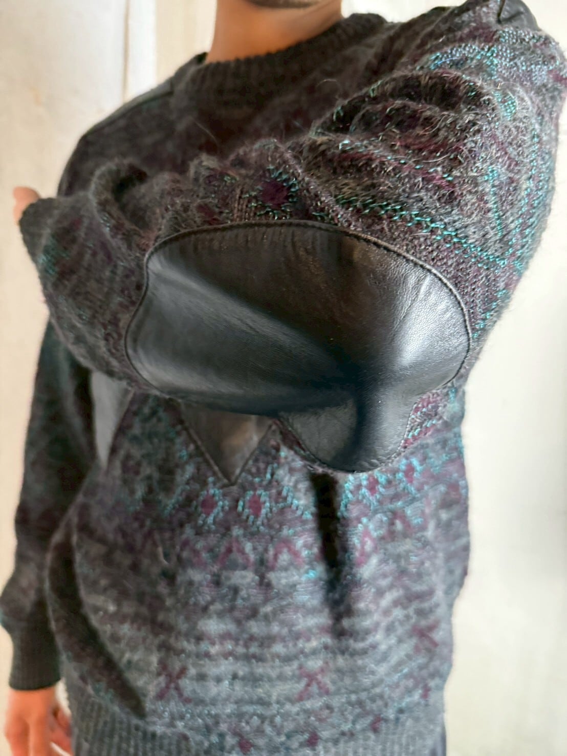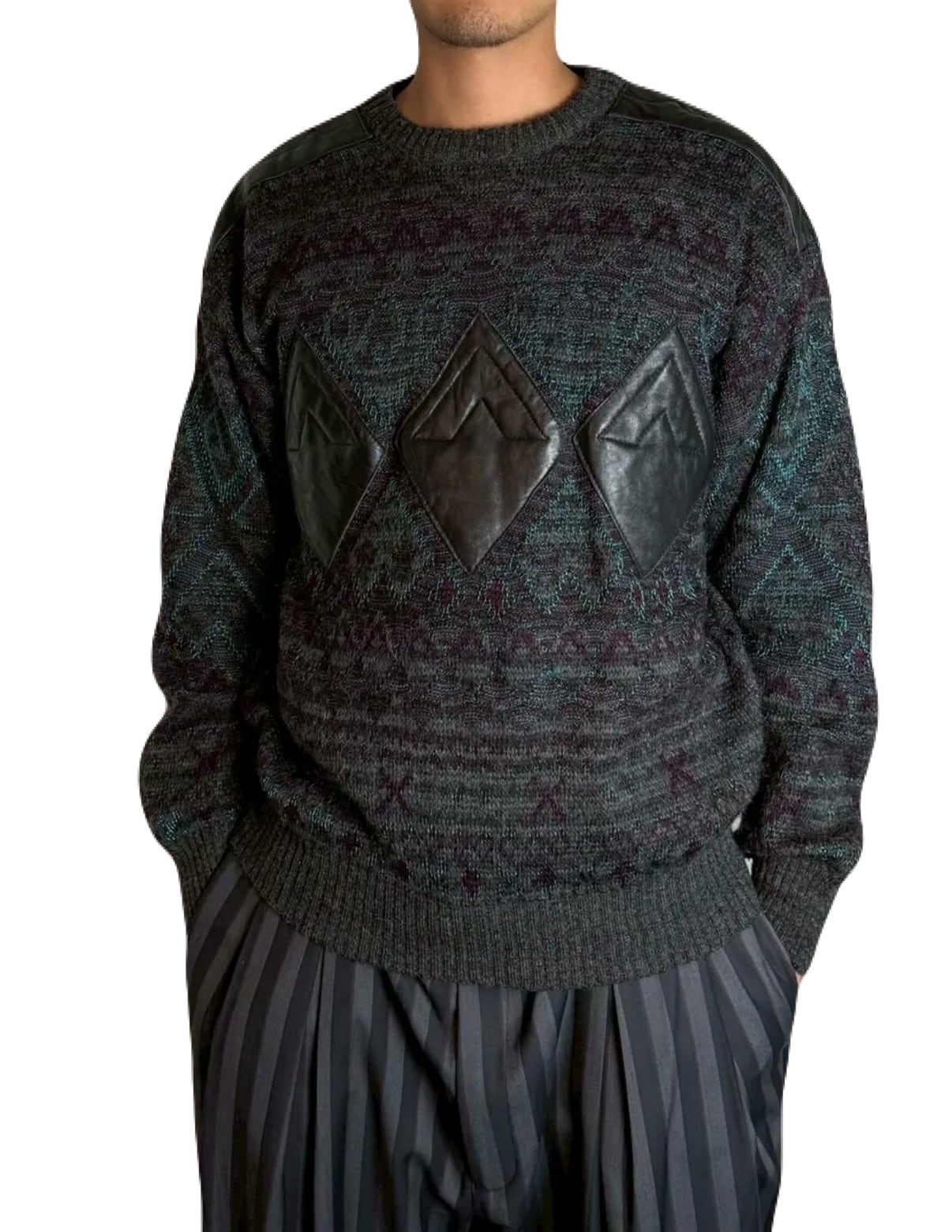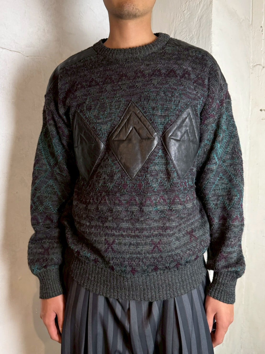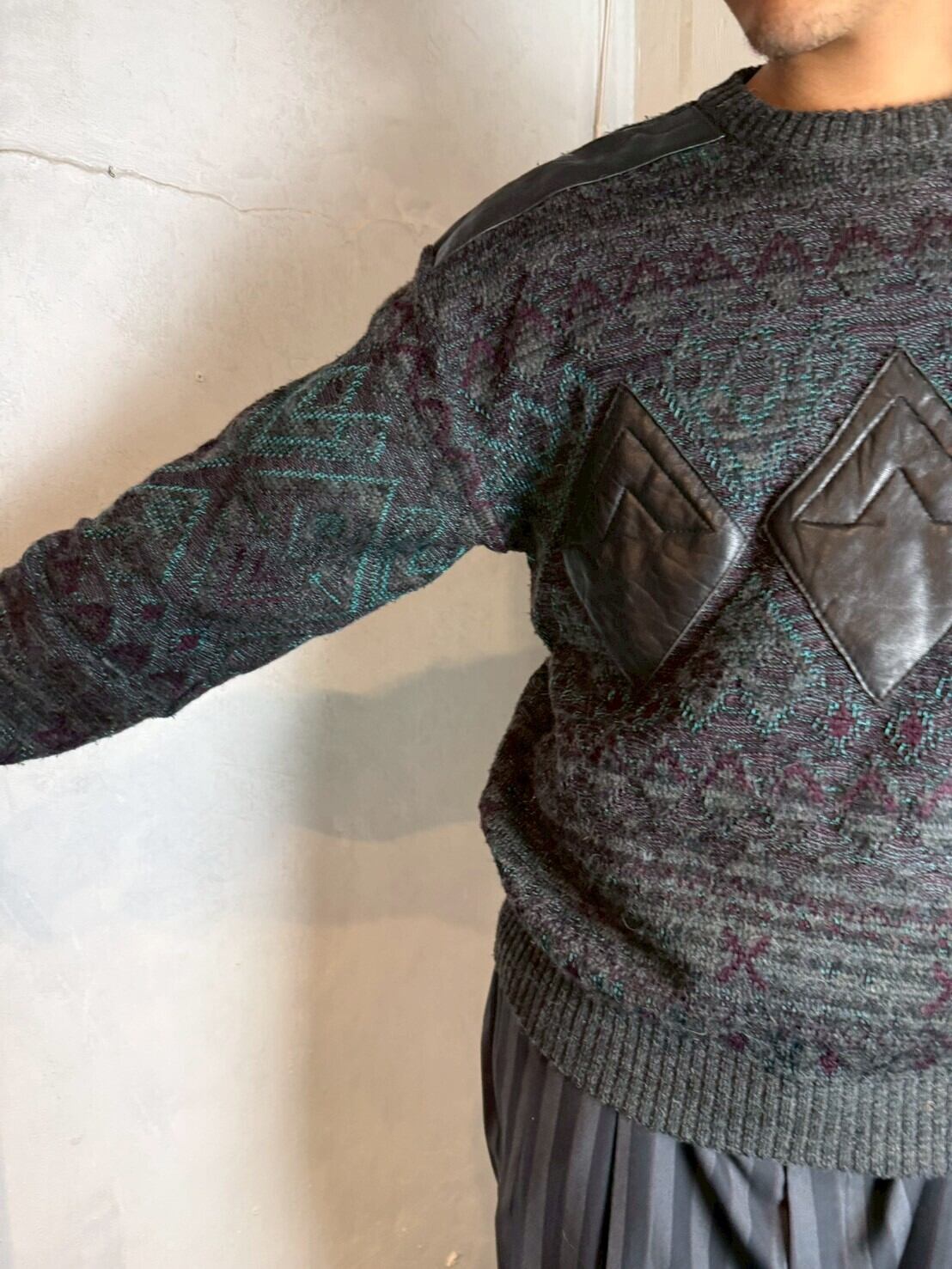 ジオメトリックレザーパッチセーター