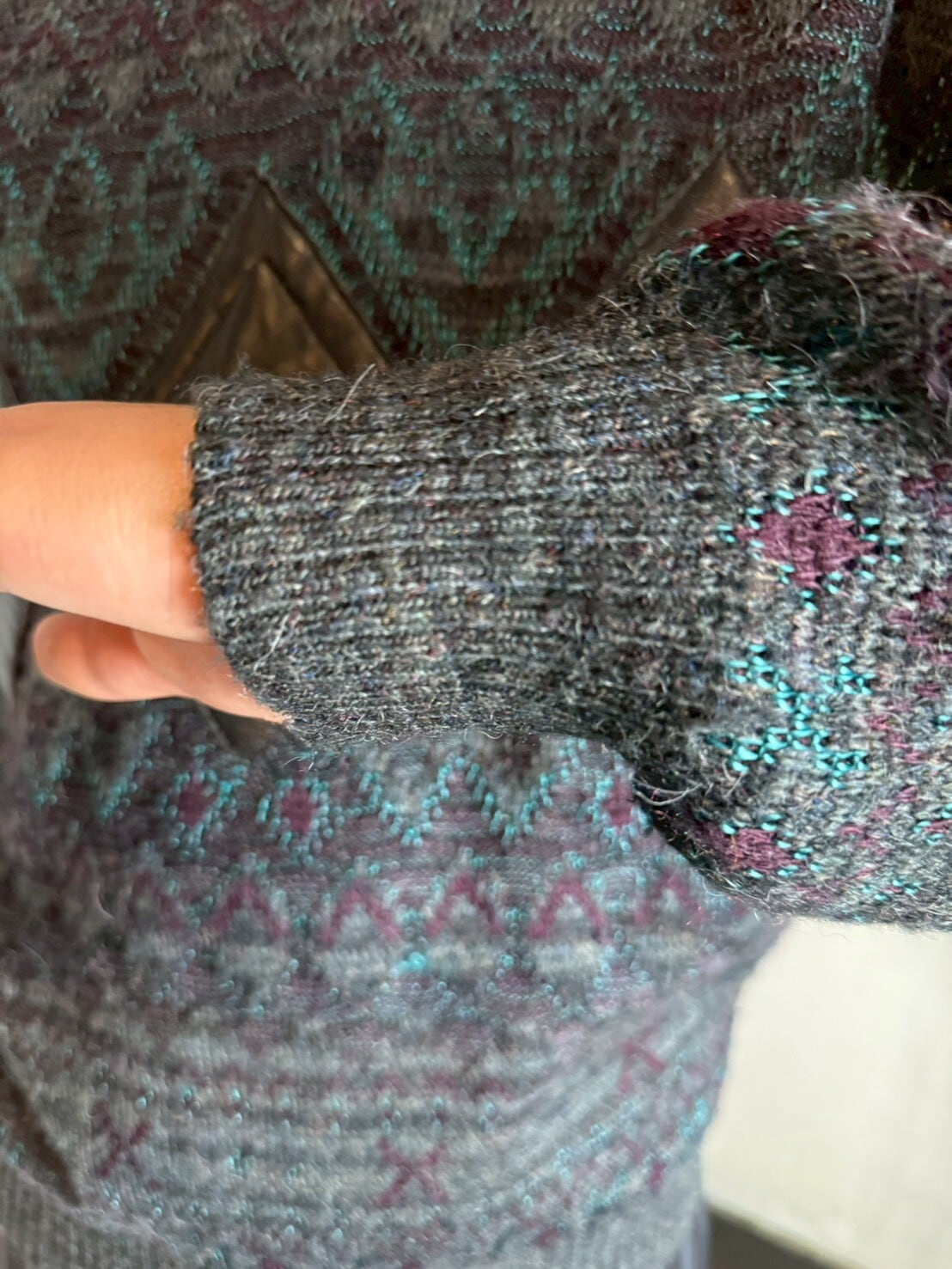 細かなジオメトリック柄のクールなヴィンテージセーター。チャコールグレーやワイン味のあるブラウン、ターコイズブルーなど、多種の色が重なり合い、繊細な柄を作り上げています。